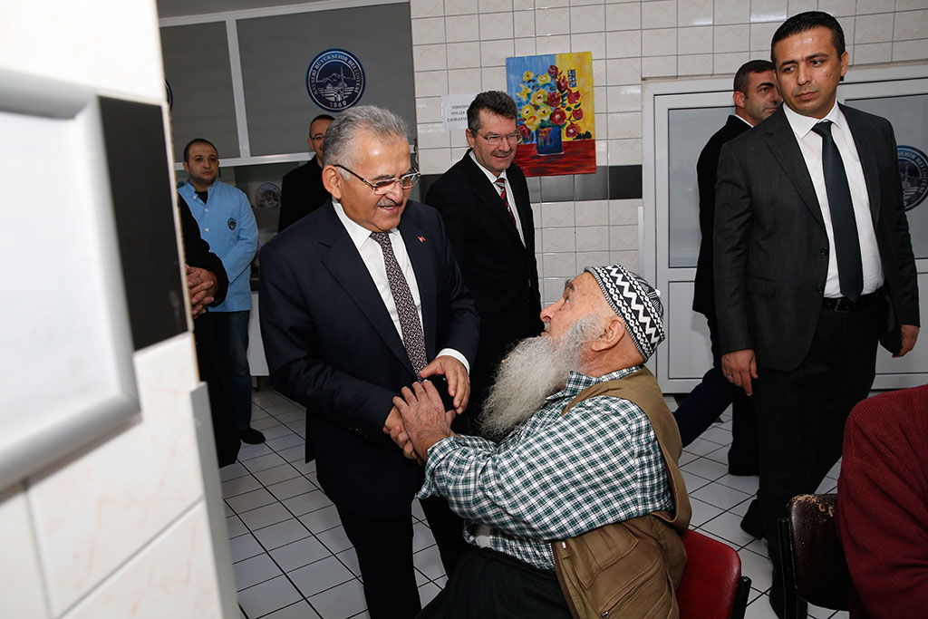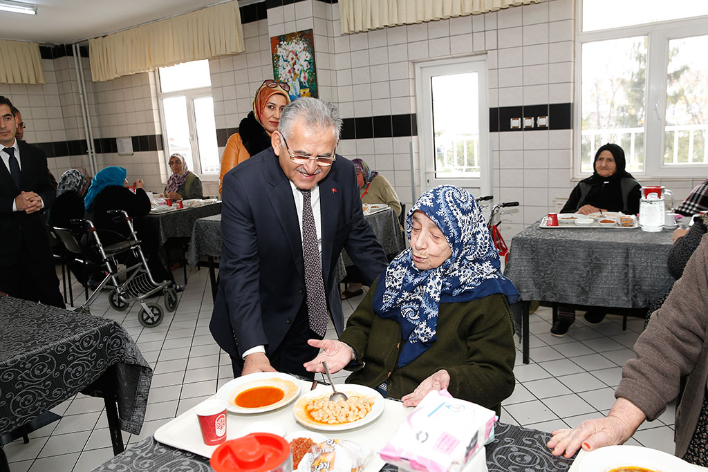 Büyükşehir Belediye Başkanı Memduh Büyükkılıç, öğle yemeği için yemekhanede bulunan yaşlılarımızı da ziyaret etti. Bu sırada Cumhurbaşkanı Recep Tayyip Erdoğan’a selam gönderen bir yaşlımız, devletin ve belediyenin kendilerine çok iyi baktığını ifade ederek “Yediriyorsunuz, içiriyorsunuz. Bize çok iyi bakıyorsunuz. Tayyip Erdoğan’a selam söyleyin. Çünkü bize bakıyor. Ne mutlu bize. Evladının bakmadığına bakıyorsunuz” diye konuştu.