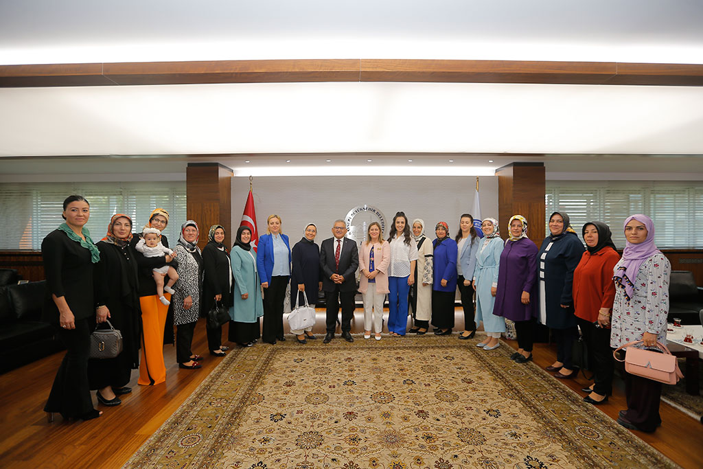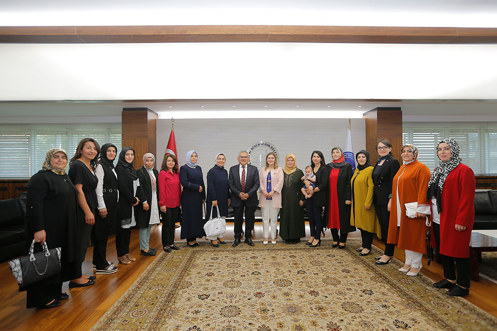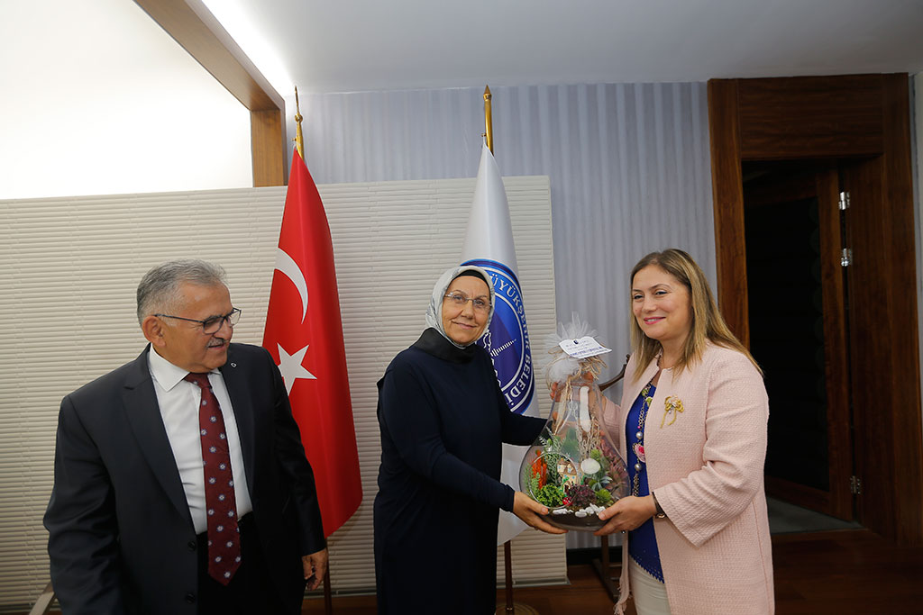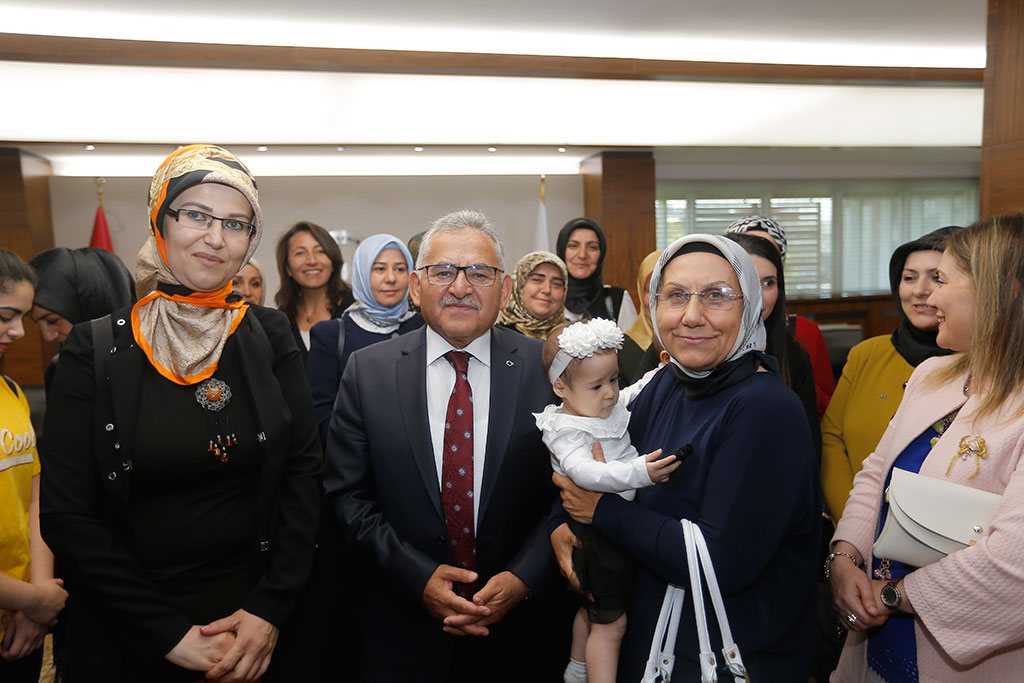 AK Parti Kadın Kolları Başkanı Emine Timuçin ve Kadın Kolları yöneticileri Büyükşehir Belediye Başkanı Dr. Memduh Büyükkılıç’ı ziyaret etti. Ziyarette Başkan Büyükkılıç’ın eşi Dr. Necmiye Büyükkılıç da yer aldı. Başkan Büyükkılıç, ziyarette tüm kadınlara fedakarlıkları nedeniyle teşekkür etti. AK Parti Kadın Kolları Başkanı Emine Timuçin ve Kadın Kolları üyelerini eşi Dr. Necmiye Büyükkılıç ile birlikte karşılayan Büyükşehir Belediye Başkanı Dr. Memduh Büyükkılıç, başta eşi olmak üzere tüm kadınlara fedakarlıkları nedeniyle teşekkürlerini ifade etti. Her zaman halkla iç içe olduğunu ve vatandaşların da kendilerinden birisi olarak gördüğünü ifade eden Başkan Büyükkılıç, bu güvene layık olmaya çalıştıklarını, vatandaşların gönlünü ve duasını almak için gayret ettiklerini söyledi. “BAŞKANIMIZ 7/24 ÇALIŞIYOR” AK Parti Kadın Kolları Başkanı Emine Timuçin de Başkan Büyükkılıç’ın 7 gün 24 saat çalıştığını dile getirerek, “Allah gücünüze güç katsın. Tüm vatandaşların sizlere gösterdiği güvene şahidiz. Herkesin gönlüne girmişsiniz ve herkesin gönlünde taht kurmuşsunuz. Sizler de iyi ki varsınız ve Kayseri’nin değerine değer katacaksınız” diye konuştu. Kadın Kolları Başkanı Emine Timuçin, Başkan Memduh Büyükkılıç’a bayrağımızın yıldızını simgeleyen anlamlı bir hediye, eşi Necmiye Büyükkılıç’a ise çiçek takdim etti. Ziyarete bazı kadın kolları yöneticileri çocuklarıyla birlikte geldi. Başkan Büyükkılıç ve eşi çocuklarla yakından ilgilendi.