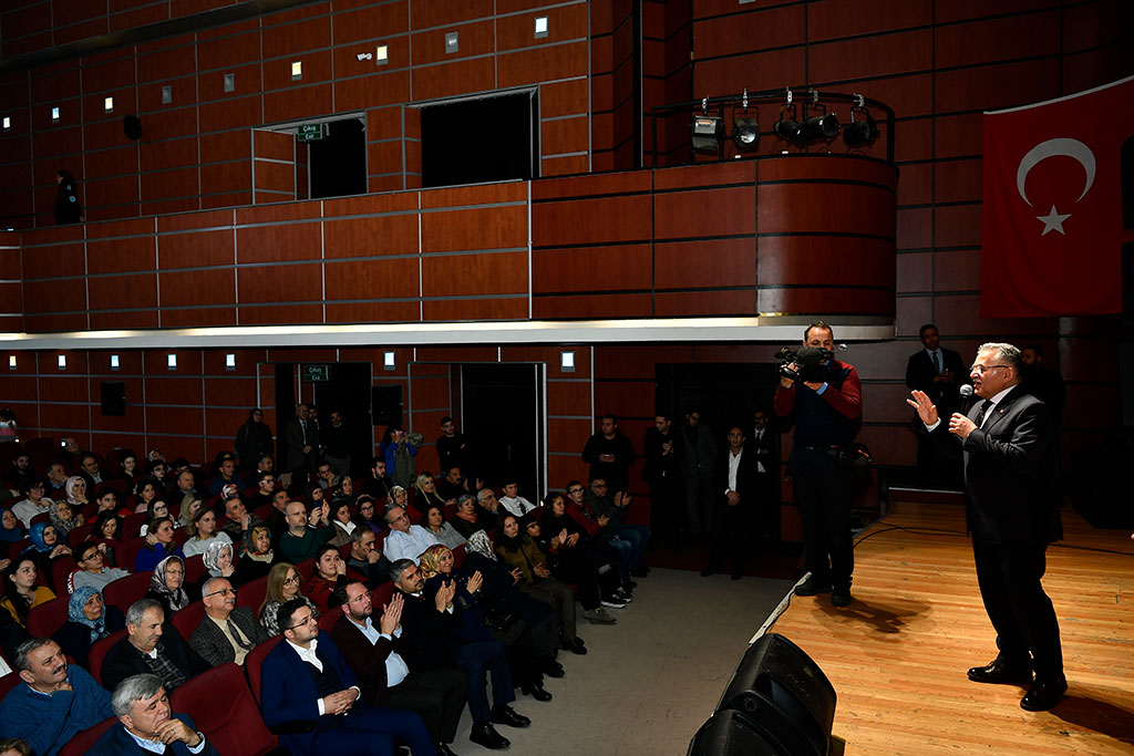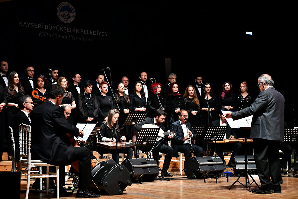 Kayseri Büyükşehir Belediyesi Konservatuvarı Türk Sanat Müziği Kent Korosu Şehir Tiyatrosu’nda bir konser verdi. Konseri izleyen Büyükşehir Belediye Başkanı Dr. Memduh Büyükkılıç, Kayseri’nin özelliklerinden bahsederek bu güzel şehre herkesin sahip çıkmasını istedi. Büyükşehir Belediyesi Konservatuvarı Türk Sanat Müziği Kent Korosu Şehir Tiyatrosu’nda sahne aldı. Büyük ilginin olduğu konseri Kayseri Büyükşehir Belediye Başkanı Dr. Memduh Büyükkılıç da izledi. Şef Burhan Surluev yönetiminde sahne alan Türk Sanat Müziği Korosu, koro ve solo halinde birbirinden güzel şarkılar seslendirdi. Konser sonrası sahneye çıkan Büyükşehir Belediye Başkanı Memduh Büyükkılıç, Kayseri’nin ticaretin yanı sıra kültürün, sanatın, turizmin merkezi olması için de gayret gösterdiklerini belirterek, “2020 yılı bu tür etkinliklerin yılı olacak. Kayseri’mizle ve hemşehrilerimizle gurur duyuyoruz. Kayseri, hayırseverlerin şehri. Kayseri, helalinden kazanıp helalinden harcayanların şehri. Kayseri, sanat sever şehir. Kayseri kültürün ve sanatın merkezi. Kayseri, fedakarlığın ve özverinin merkezi. Konukseverliği ve insanlığıyla gurur kaynağımız olan hemşehrilerimize layık olmak için çalışıyoruz. Herkesten Kayseri’mize sahip çıkılmasını istiyorum” dedi. Büyükşehir Belediye Başkanı Dr. Memduh Büyükkılıç, Türk Sanat Müziği Kent Korosu’na da teşekkür ederek Şef Burhan Surluev’e çiçek verdi.