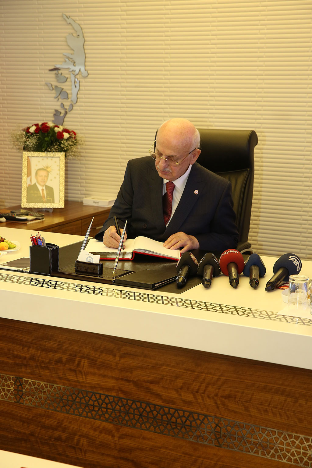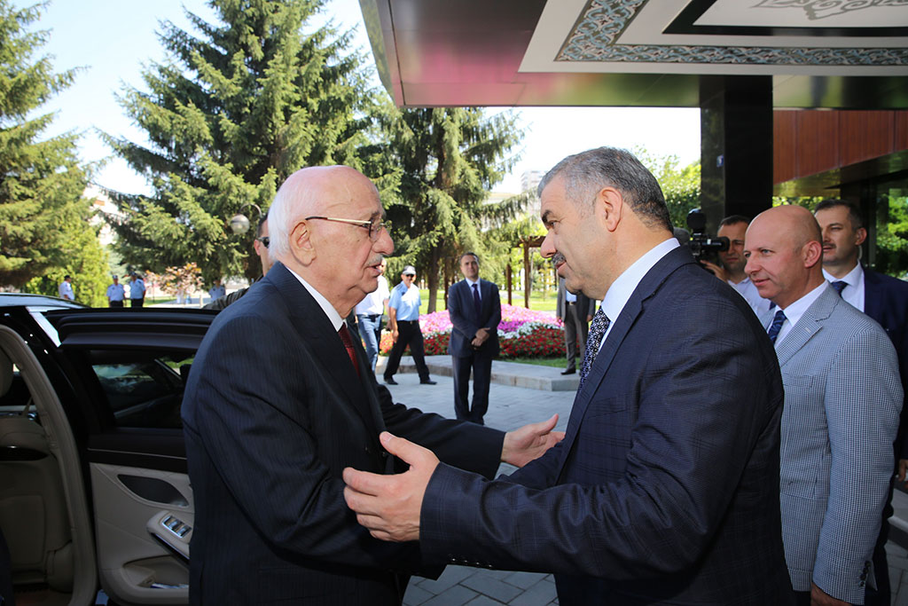 Türkiye Büyük Millet Meclisi Başkanı İsmail Kahraman, Büyükşehir Belediye Başkanı Mustafa Çelik’i ziyaret etti. Meclis Başkanı Kahraman, Kayseri’ye her gelişinde şehirde ilerleme gördüğünü belirterek, emeği geçenlere teşekkür etti. Büyükşehir Belediye Başkanı Mustafa Çelik, TBMM Başkanı İsmail Kahraman’ı başkanlık girişinde karşıladı. Meclis Başkanı Kahraman’ın ziyaretinde Vali Süleyman Kamçı, AK Parti Grup Başkan Vekili ve Kayseri Milletvekili Mustafa Elitaş, Enerji ve Tabi Kaynaklar Eski Bakanı ve Kayseri Milletvekili Taner Yıldız, Kayseri Milletvekili İsmail Tamer ve Kocasinan Belediye Başkanı Ahmet Çolakbayrakdar da hazır bulundu. Büyükşehir Belediye Başkanı Çelik, Meclis Başkanı Kahraman’ı şehrimizde ağırlamakta onur duyduklarını belirterek, Kayseri’nin uyumlu bir şehir olduğunu söyledi. Meclis Başkanı Kahraman da Kayseri’de bugüne kadar hizmet vermiş önemli belediye başkanları olduğunu belirtti ve “Siz de eserlere yeni eserler katacaksınız” diye konuştu. TBMM Başkanı Kahraman daha sonra Büyükşehir Belediyesi’nin anı defterini imzaladı. Kahraman, anı defterine her gelişinde Kayseri’de büyük ilerlemeler gördüğünü ifade ederek emeği geçenlere teşekkür etti. Ziyarette Başkan Mustafa Çelik, TBMM Başkanı Kahraman’a el yapımı ibrik takdim etti. Meclis Başkanı Kahraman da Başkan Çelik’e Abdülhamit’in inşa ettirdiği fabrikanın ürünü olduğunu belirttiği meclisin amblemini taşıyan plaket verdi.