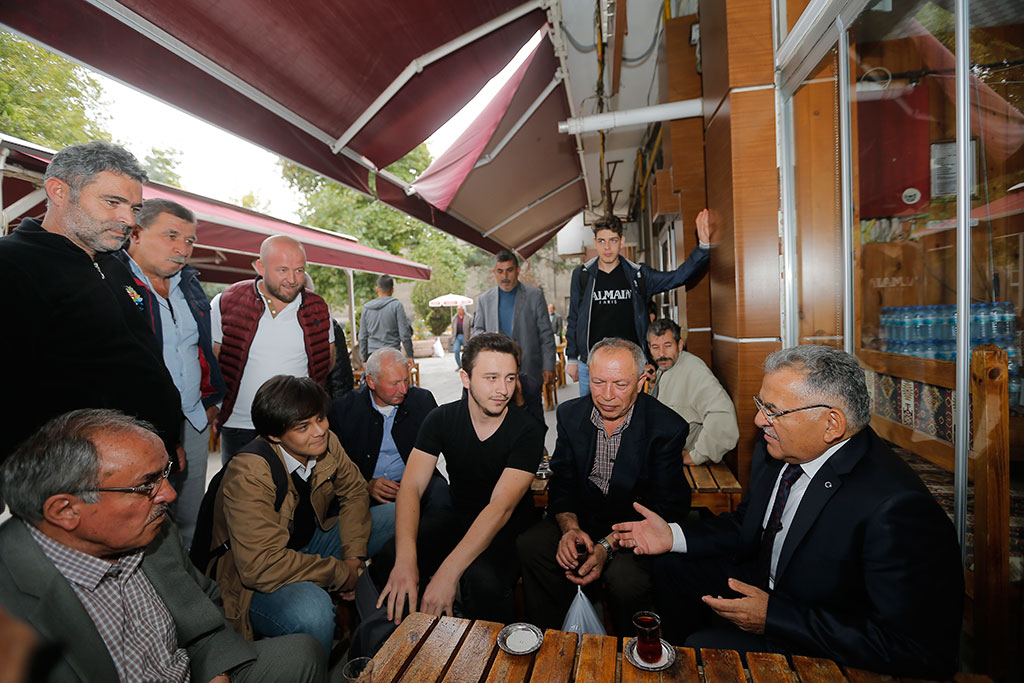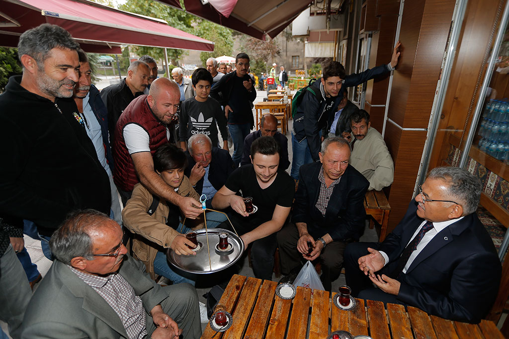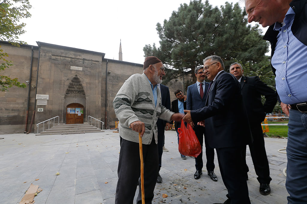 Kayseri’de yapılan her işle özenle ilgilenen Büyükşehir Belediye Başkanı Dr. Memduh Büyükkılıç, Hunat Camii çevresindeki düzenleme çalışmalarını yerinde inceledi. Başkan Büyükkılıç, Hunat Camii çevresindeki esnaf ve vatandaşlarla da bir araya geldi. Büyükşehir Belediye Başkanı Dr. Memduh Büyükkılıç, Hunat Camii’nin Kayseri için çok önemli olduğunu belirtti ve şehrin buluşma noktası olarak adlandırıldığını ifade etti. Hunat Camii’nin çevresinde yapılan düzenleme çalışmalarını takip eden Başkan Büyükkılıç, çalışanlara da tatlı ikram etti. Başkan Memduh Büyükkılıç, daha sonra Hunat Camii çevresinde bulunan esnafları ziyaret etti ve onlarla bir süre sohbet edip, çay içti. Esnaf tarafından sıcak ve samimi bir şekilde karşılaşan Başkan Büyükkılıç, esnaf ve vatandaşlara poğaça ikram etti.