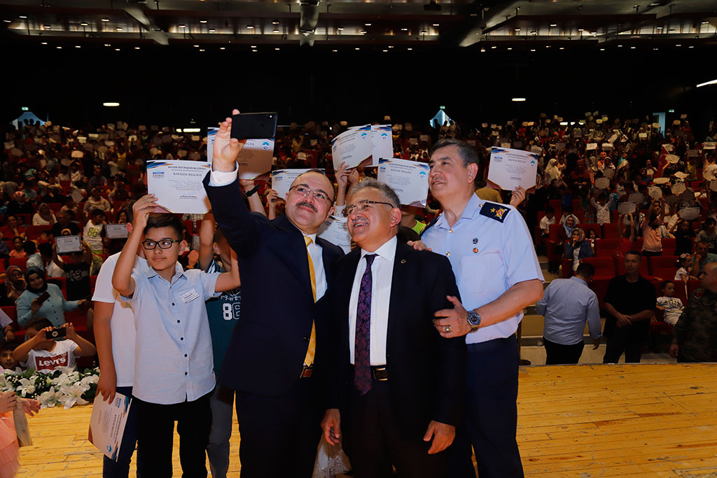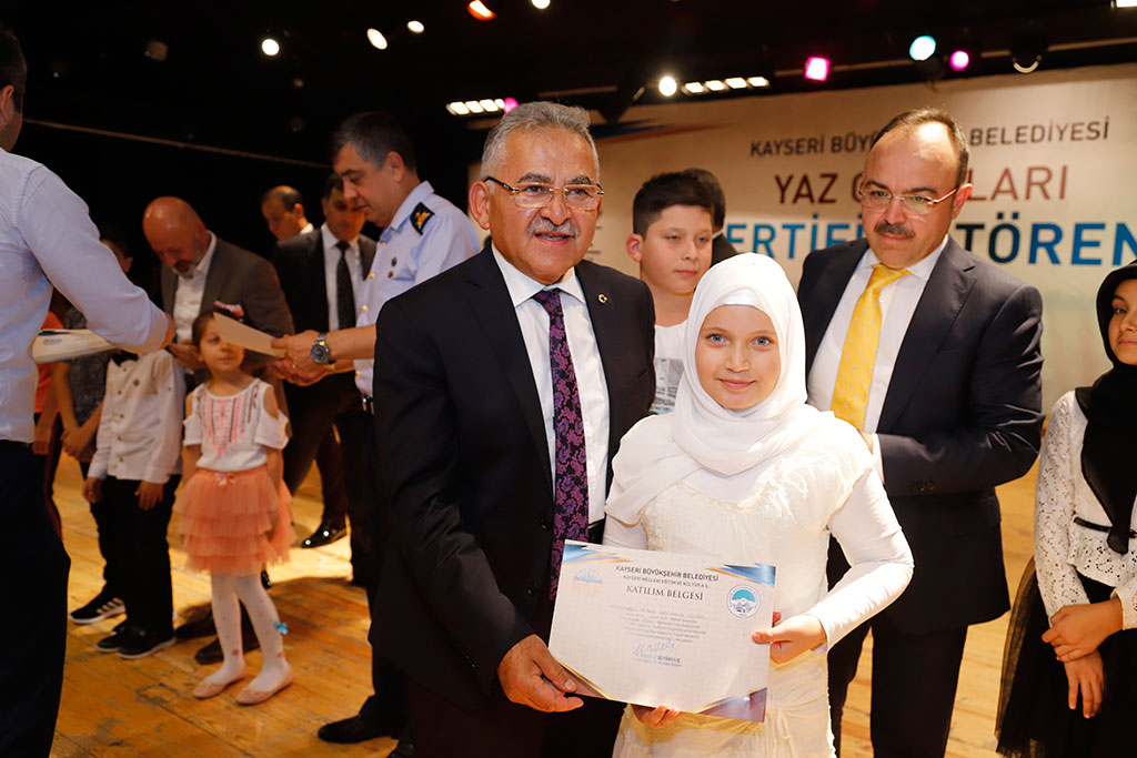 Kayseri Büyükşehir Belediye Başkanı Dr. Memduh Büyükkılıç, sanat ve mesleki eğitimde Anadolu’nun markası haline gelen KAYMEK’in yaz kurslarında 3 bin 600, bir yıl içinde ise yaklaşık 35 bin kişiye eğitim verdiğini söyledi. Başkan Büyükkılıç, KAYMEK’in öğrenci sayısının çok büyük bir devlet üniversitesindeki öğrenci sayısına ulaştığını belirtti. Büyükşehir Belediyesi bünyesindeki KAYMEK tarafından öğrenciler ve yetişkinlere yönelik açılan yaz kurslarının sertifika töreni Kadir Has Kültür ve Sanat Merkezi’nde yapıldı. Büyükşehir Belediye Başkanı Memduh Büyükkılıç, kültür sanat merkezine öğrencilerin alkış ve tezahüratları eşliğinde girdi. Kursiyerler ve ailelerin salonu tıklım tıklım doldurduğu törene Büyükşehir Belediye Başkanı Dr. Memduh Büyükkılıç’ın yanı sıra Garnizon Komutanı Tümgeneral Ercan Teke, Melikgazi Kaymakamı Erkaya Yırık, Kocasinan Belediye Başkanı Ahmet Çolakbayrakdar, bürokratlar, kursiyerler ve aileleri katıldı. Sertifika töreni saygı duruşu ve İstiklal Marşı’nın ardından KAYMEK’in yaz kurslarına katılarak Kuran-ı Kerim öğrenen öğrencilerin yüce kitabımızı okumalarıyla başladı. Öğrencilerin çeşitli etkinlikler sergilediği törende daha sonra kursiyerler adına iki kursiyer velisi tarafından konuşma yapıldı ve Büyükşehir Belediyesi’nin sunduğu hizmet nedeniyle teşekkür edildi. “KAYMEK BİR AİLEDİR” Büyükşehir Belediye Başkanı Dr. Memduh Büyükkılıç da sözlerinin başında KAYMEK’in bir aile olduğu vurgusunu yaptı ve kursiyerlerin de bu ailenin en önemli fertleri olduğunu söyledi. KAYMEK ailesinin tüm fertlerini tebrik eden Başkan Büyükkılıç, “Büyükşehir Belediyemizin güzide kuruluşlarından KAYMEK, yapmış olduğu faaliyetlerle Anadolu’nun markası haline gelmiş ve gururumuz olmuş bir şirketimiz. Yaz kış demeden 7’den 70’e tüm vatandaşlarımıza eğitim veren adeta bir ilim yuvası. Bünyesindeki KAYMEK, Genç KAYMEK ve Aile Danışmanlık Merkezimiz ile daha huzurlu, daha eğitimli ve daha donanımlı bir toplum için gayret gösteriyor. Böylesine önemli bir çalışmada emeği geçen tüm idarecilerimizi, eğitimcilerimizi ve çalışanlarımızı tebrik ediyorum. En büyük teşekkürümüz elbette ki kursiyerlerimize. Yaz döneminde kendilerine sağladığımız bu imkanları değerlendirerek bilgilerine bilgi katan, yeni bilgiler öğrenen, tatilden en güzel şekilde yararlanan öğrencilerimizi ve ailelerini kutluyorum. Yine yaz döneminde sanat ve mesleki eğitim kurslarımızdan faydalanan kursiyerlerimizi tebrik ediyorum” dedi. KAYMEK ve Genç KAYMEK kurs merkezlerinde okulların kapanmasıyla birlikte yaz okulları açıldığını ifade eden Başkan Büyükkılıç, 21 tesiste 8 hafta süren kurslara 1353 öğrencinin katıldığını ifade ederek sözlerini şöyle sürdürdü: “Yaz kurslarımızdaki çocuklarımıza hocalarımız tarafından Yüce Kitabımız Kuran-ı Kerim öğretildi, değerler eğitimi verildi ve ayrıca İngilizce, Diksiyon, Resim, Takı Tasarım, Mutfak Etkinlikleri ve Akıl Oyunları gibi etkinliklere katılmaları sağlandı. Kayseri Büyükşehir Belediyesi bu hizmeti sadece şehir merkezinde vermedi. İlçelerimizdeki çocuklarımız için de yaz okulları açtık ve benzer bir müfredat ile eğitimlerine katkı sunduk. Ayrıca yaz döneminde yetişkin kurslarımız da devam etti. 1236 kursiyerimiz 32 farklı branşta eğitim aldı. Tüm bunların yanında yüksek öğretim kurumları sınavı ve liselere giriş sınavı için de kurslarımız devam etti. Sadece iki aylık yaz döneminde kurslarımızdan faydalananların sayısı 3 bin 600’e ulaştı. İki ay gibi kısa sürede bu kadar çok kişiye ulaşmak önemli bir hizmettir. KAYMEK ve Genç KAYMEK bir yılda ise yaklaşık 35 bin kişiye hizmet verir hale gelmiştir. Bu rakamlar çok büyük bir devlet üniversitesi rakamlarıdır.” KAYMEK’in vermiş olduğu bu hizmetleri artırarak sürdüreceğini dile getiren Başkan Memduh Büyükkılıç, vatandaşların taleplerini en güzel şekilde karşılamak için daha fazla gayret göstereceklerini kaydetti. Konuşmaların ardından Başkan Memduh Büyükkılıç’a öğrenciler tarafından çiçek takdim edildi. Başkan Büyükkılıç da çiçeği KAYMEK eğitmenleri adına bir öğretmene verdi. Daha sonra Başkan Büyükkılıç ve törene katılan protokol mensupları tarafından KAYMEK’in yaz kurslarına katılan öğrenciler ve yetişkinlere sertifikaları verildi.
