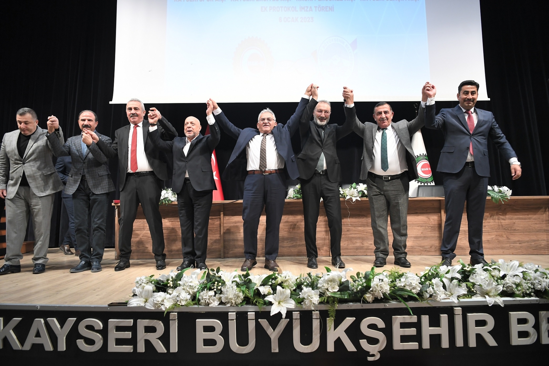 Kayseri Büyükşehir Belediye Başkanı Dr. Memduh Büyükkılıç, HAK İŞ Konfederasyonu ve Hizmet İş Sendikası Genel Başkanı Mahmut Arslan ile birlikte Kayseri Büyükşehir Belediyesi bünyesindeki şirketlerde görev yapan 6 bin işçiyi kapsayan Ek Protokol İmza Töreni’ne katıldı. Başkan Büyükkılıç tarafından imza altına alınan protokole göre 6 bin işçinin maaşı asgari ücret artışı oranında güncellenerek, ilave kazanımlar sağlandı. Böylece, Türkiye’de ilk kez bir Büyükşehir Belediyesi var olan sözleşmeyi işçi lehine geliştirerek, yemek ücreti gibi sosyal haklar dahil önemli kazanımlar sağlamış oldu.Kayseri Büyükşehir Belediyesi bünyesindeki KAYMEK A.Ş., Spor A.Ş., Erciyes A.Ş., KASKİ Personel A.Ş., ve Kayseri Ulaşım A.Ş.’de görev yapan 6 bin çalışanın maaşlarının asgari ücret artışı oranında güncellenerek artırılmasına yönelik Ek Protokol İmza Töreni gerçekleştirildi.