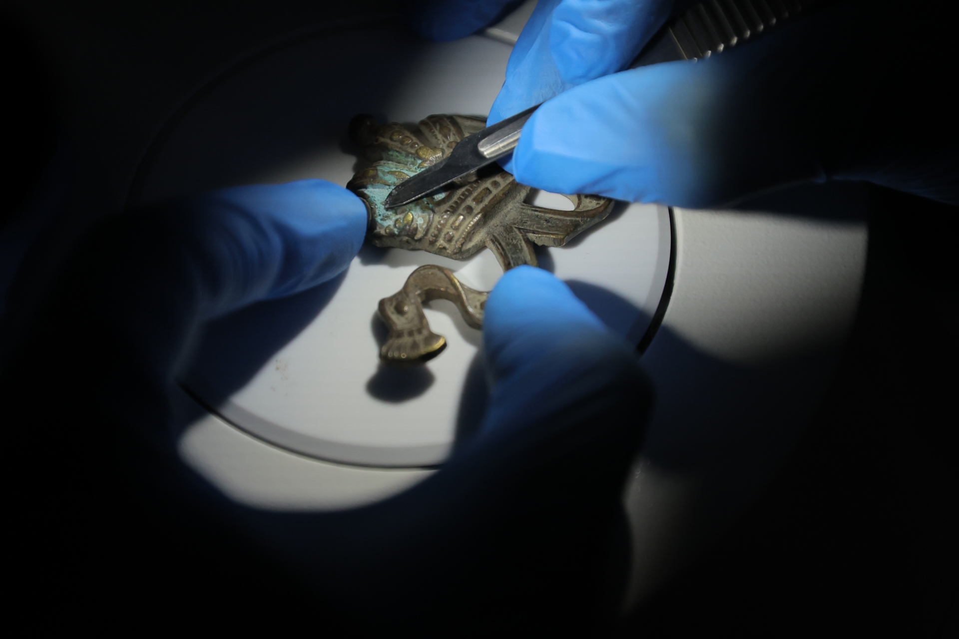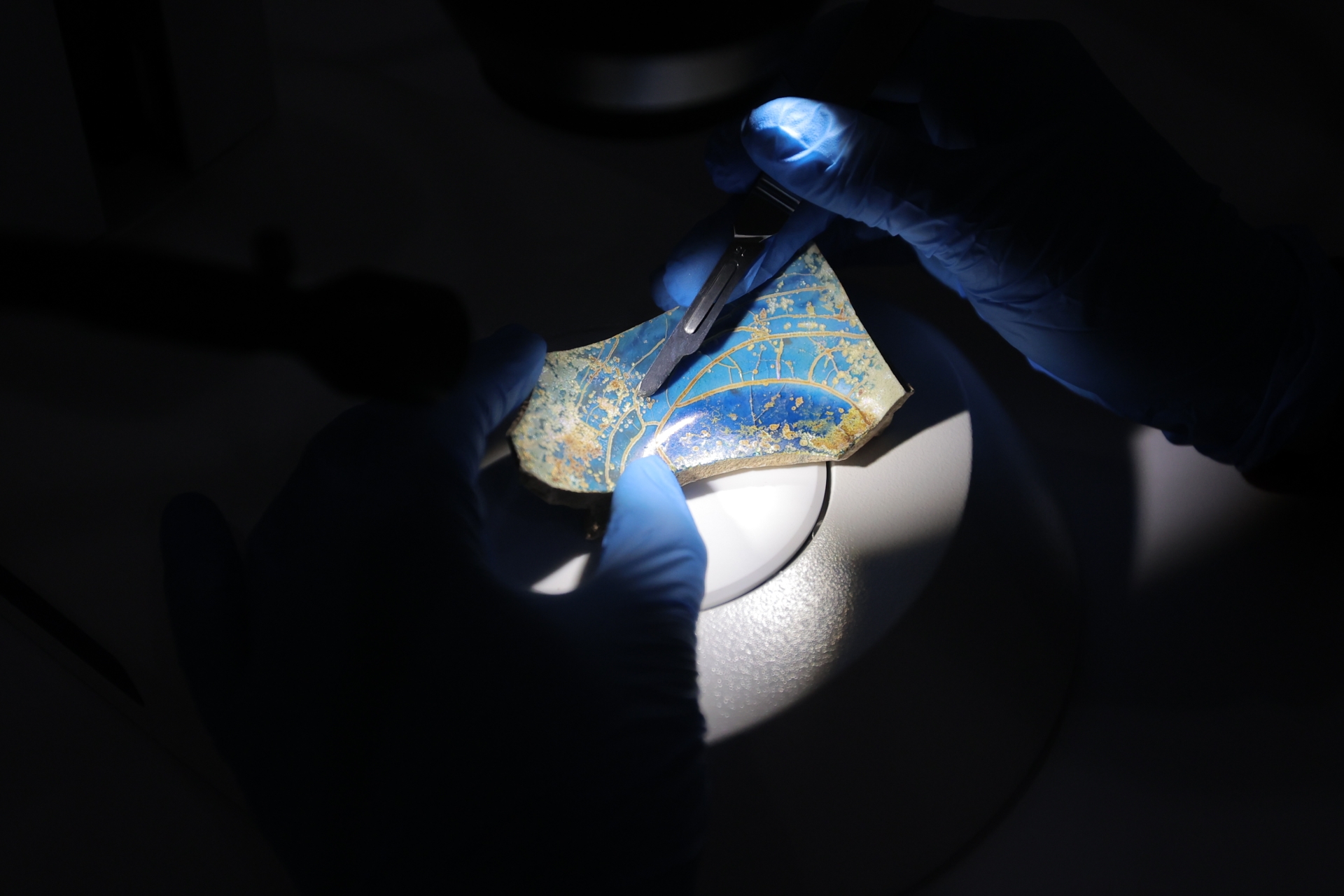 Laboratuvarın çalışmalarına dair bilgiler veren Konservasyon Uzmanı Sibel Çetinkaya koruma, onarım uygulamalarında öncelikli yaklaşımın teşhis olduğunu belirterek, “Teşhisi gerçekleştirebilmek için ön inceleme, analizler, testler, mikroskobik görüntüler gibi çalışmalar yapmaktayız. Teşhisler bizi tespite götürür. Eserlerimizdeki sorunları, bozulmalarına neden olan korozyon ürünleri ya da diğer eserler için farklı bozulma türlerini tespit ettikten sonra onlara uygulayacağımız en uygun müdahale yöntemine ve bu müdahaledeki malzemelere karar veririz” diye konuştu.