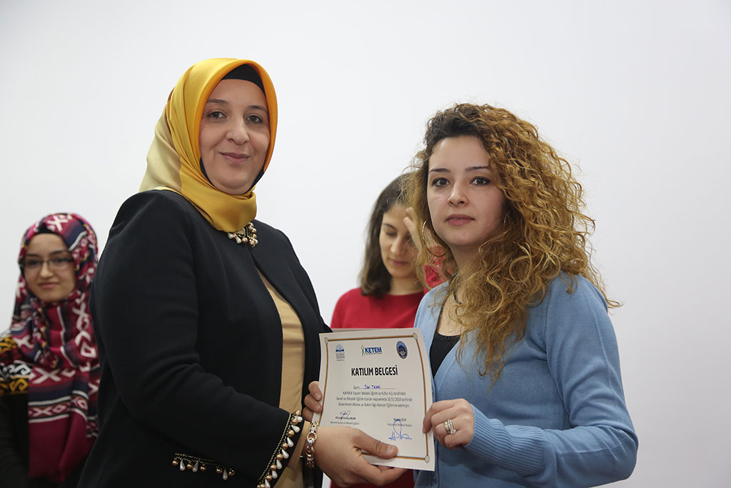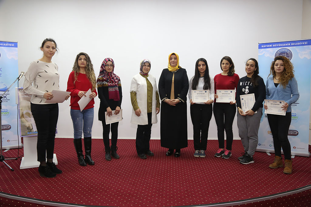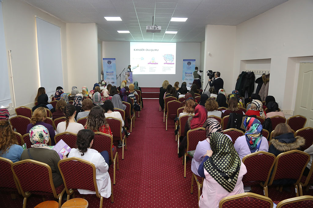 Mesleki eğitimde Anadolu’nun markası olan KAYMEK, sadece sanat ve mesleki eğitim faaliyetleriyle sınırlı kalmıyor, eğitim faaliyetleri ile de dikkat çekiyor. Sağlık başta olmak üzere pek çok alanda eğitim seminerleri gerçekleştiren KAYMEK, birinci eğitim ve öğretim dönemini çağımızın hastalığı olan kansere karşı bilinçlendirme semineri ile kapattı. Semineri Büyükşehir Belediye Başkanı Mustafa Çelik’in eşi İkbal Çelik de takip etti. Büyükşehir Belediyesi bünyesindeki KAYMEK ile Kanser Erken Teşhis Tarama ve Eğitim Merkezi (KETEM) tarafından KAYMEK Sümer Eğitim Merkezi’nde “Meme ve Rahim Ağzı Kanseri Tarama Eğitimi” gerçekleştirildi. Büyükşehir Belediye Başkanı Mustafa Çelik’in eşi İkbal Çelik’in de takip ettiği seminerde kursiyerler kansere karşı bilinçlendirildi. Kanserin toplumumuzdaki yeri, biyolojik ve psikolojik etkileri, erken teşhis ve taramanın önemi gibi konularda bilgilerin verildiği seminere KETEM eğitimcisi Gamze Orak ile Doktor Ebru Güngör katıldı. Seminer sonrası konuşan Başkan Mustafa Çelik’in eşi İkbal Çelik, hastalıkların kaçınılmaz olduğunu; ancak önlem almanın gerektiğini belirterek, “Sağlık da hastalık da, varlık da yokluk da insanlar içindir. Bizler tedbirimiz alalım, takdir Allah’ındır. Hepinize sağlıklı, mutlu ve huzurlu günler diliyorum” dedi. İkbal Çelik seminere katılan kursiyerlere de sertifikalarını verdi. KETEM doktorlarından Ebru Güngör, sertifika töreni sonrası yaptıkları çalışmalarla ilgili bilgi vererek kanser taramasını ücretsiz yaptıklarına dikkat çekerek bu anlamda herkesi bu hizmetten yararlanmaya davet etti. Başkan Çelik’in eşi İkbal Çelik de KETEM ekibine vermiş oldukları bilgiler için teşekkür ederek, “İnşallah kimse bu tür hastalıklarla karşılaşmaz, ama karşılaşılırsa neler yapılacağının da bilinmesi gerekir. Herkese sağlıklı günler diliyorum” diye konuştu.