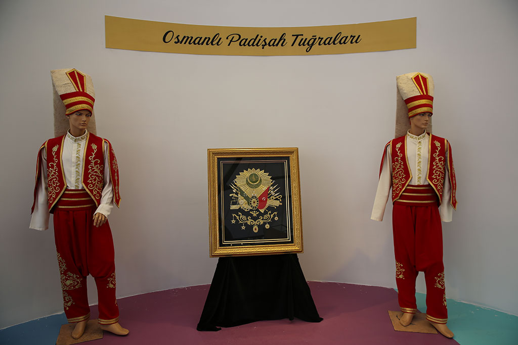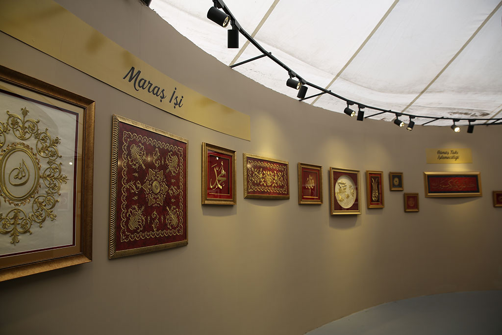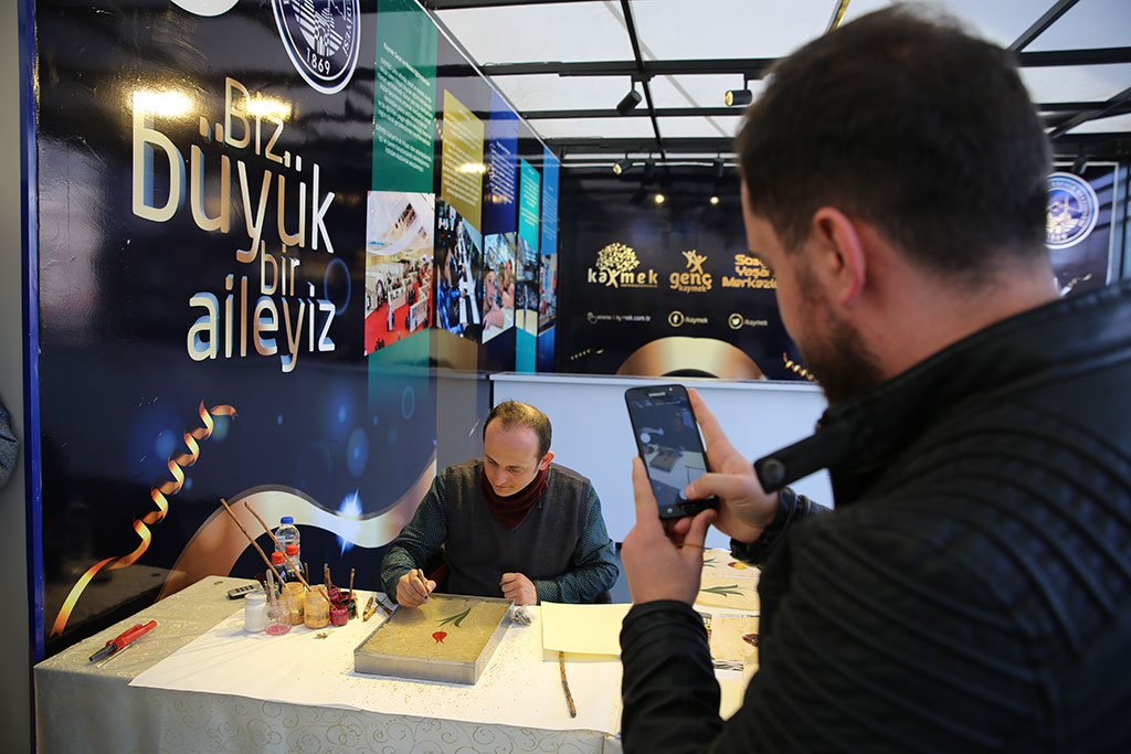 Hunat medresesi önünde yer alan Büyükşehir Belediyesi Faaliyet Çadırı, sanat ve mesleki eğitimde Anadolu’nun markası olan KAYMEK tarafından Sanat Galerisi olarak açıldı. KAYMEK Sanat Galerisi’nde 150’ye yakın eser sergileniyor ve bazı el sanatları uygulamalı olarak gösteriliyor. Hunat Medresesi önündeki KAYMEK Sanat Galerisi’nde Türk-İslam sanatlarına ait eserlerin yer aldığı bir sergi açıldı. Sergide, KAYMEK sanat kurslarına katılan kursiyerler ile eğitimciler tarafından yapılmış eserler bulunuyor. Tezhipten, ebruya; çiniden hat sanatına kadar birçok özel çalışmanın yer aldığı sergide Maraş İşi ve Ebru sanatları uygulamalı olarak da gösteriliyor. Sergide yer alan eserlerden Maraş İşi tekniğiyle ve Hat Sanatıyla yapılmış olan Osmanlı Padişahlarına ait tuğralar vatandaşların büyük ilgisini görüyor. Yağlı boya resim ve gümüş takı işlemeciliği ile yapılmış eserlerin de bulunduğu sergide toplam 150 eser yer alıyor.