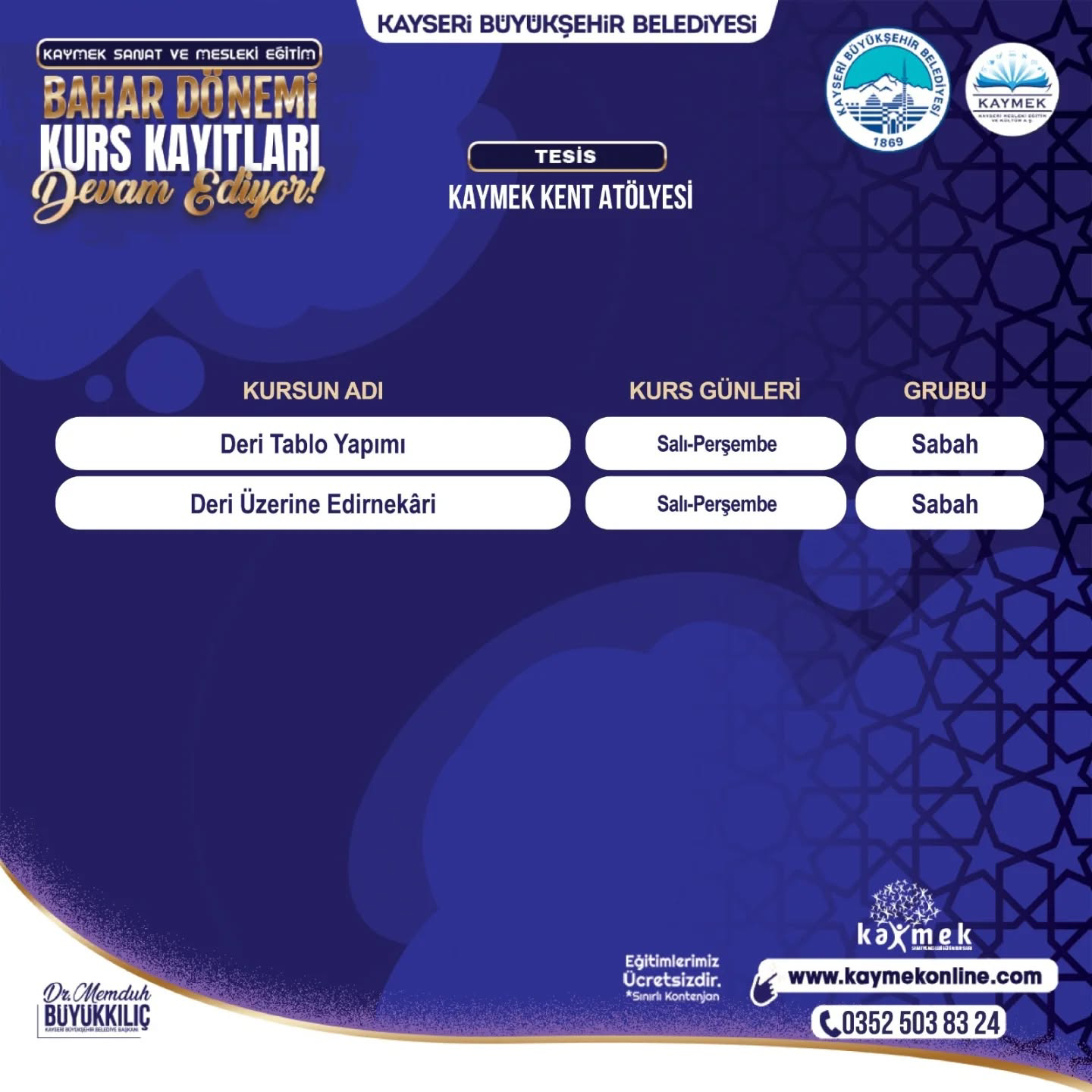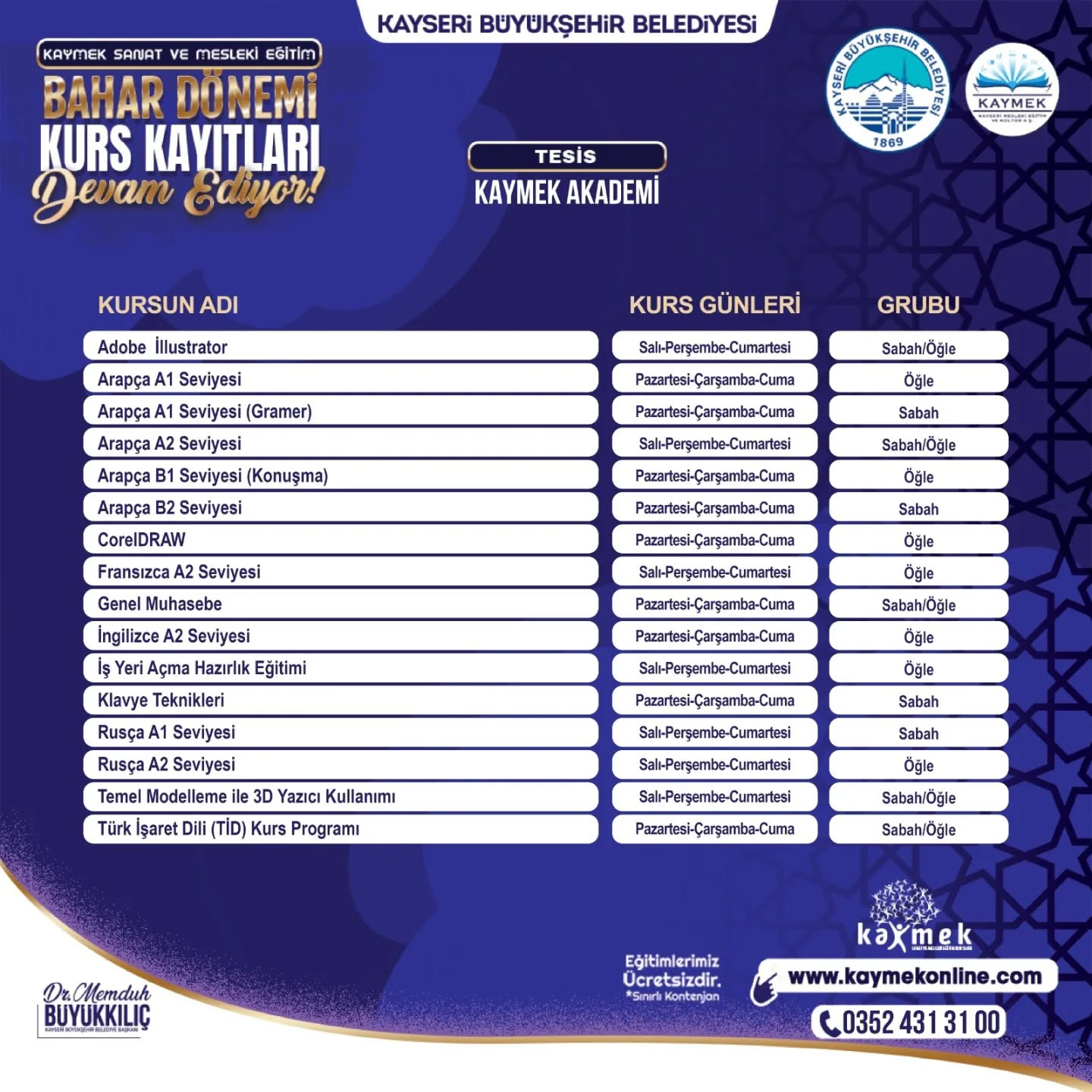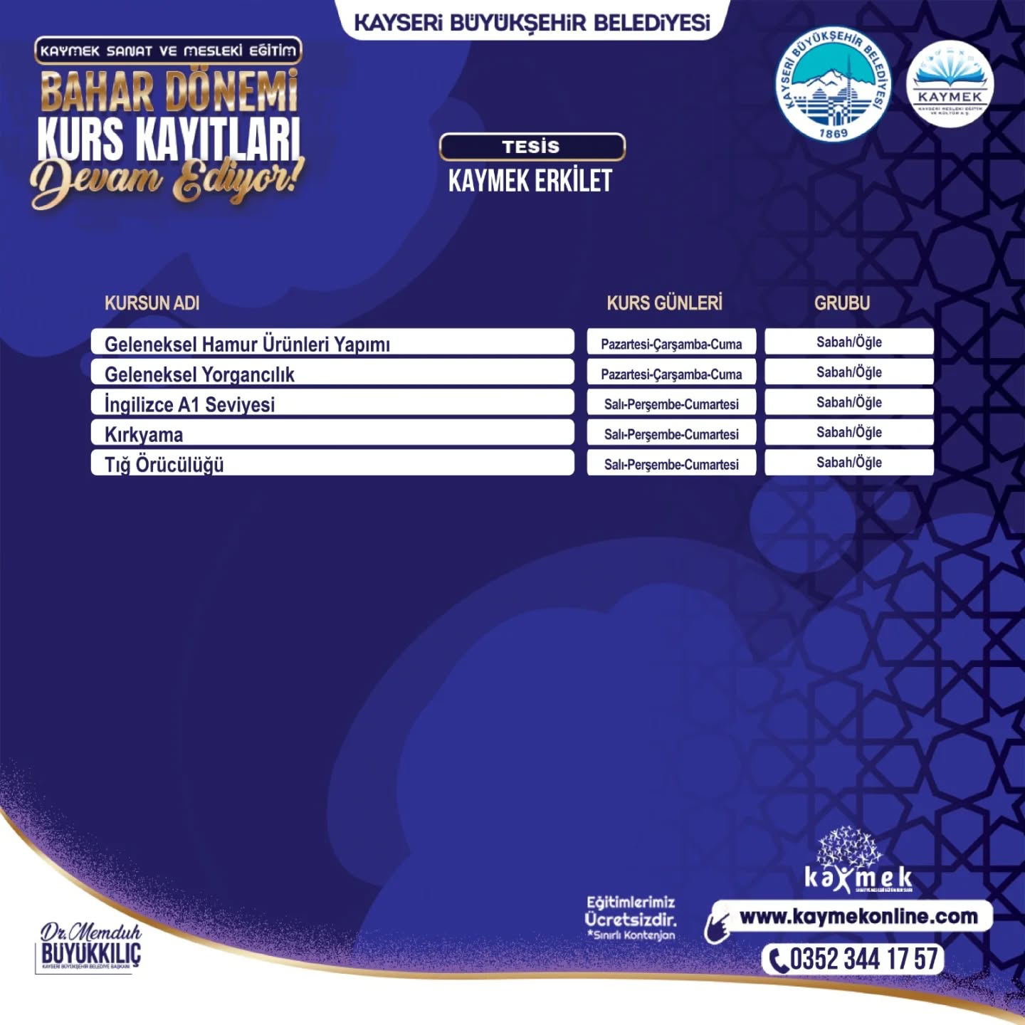 KAYMEK’in alanında uzman eğitmenleri tarafından tamamen ücretsiz olarak verilecek ve kontenjanları sınırları olan kurslar için kayıtlar www.kaymekonline.com internet adresi üzerinden gerçekleştirilebilecek. Kurslar hakkında detaylı bilgiye de bu internet adresi üzerinden ve 0 352 231 80 31 numaralı telefon üzerinden erişebilecek vatandaşlar, 1 Şubat 2026 tarihine kadar kayıt işlemlerini yapabilecek.