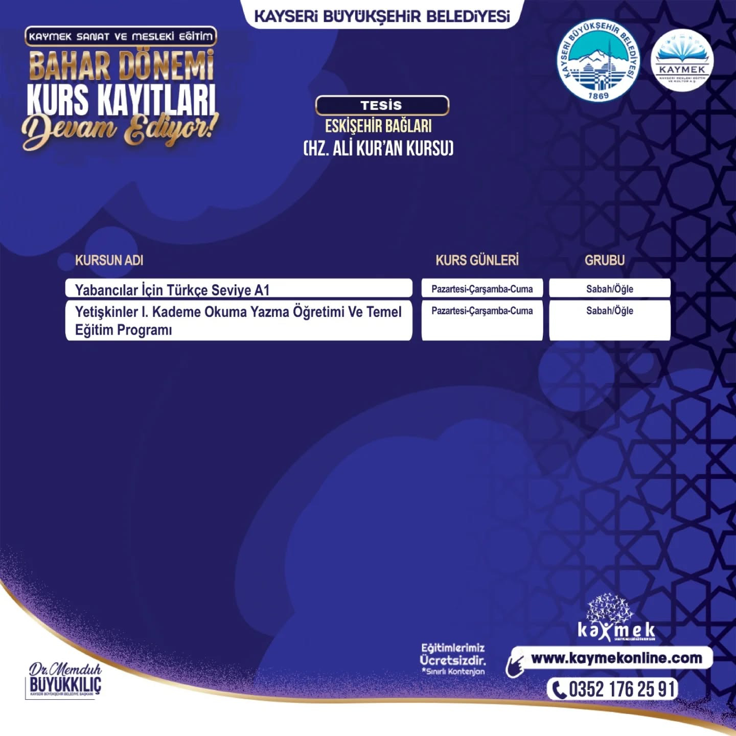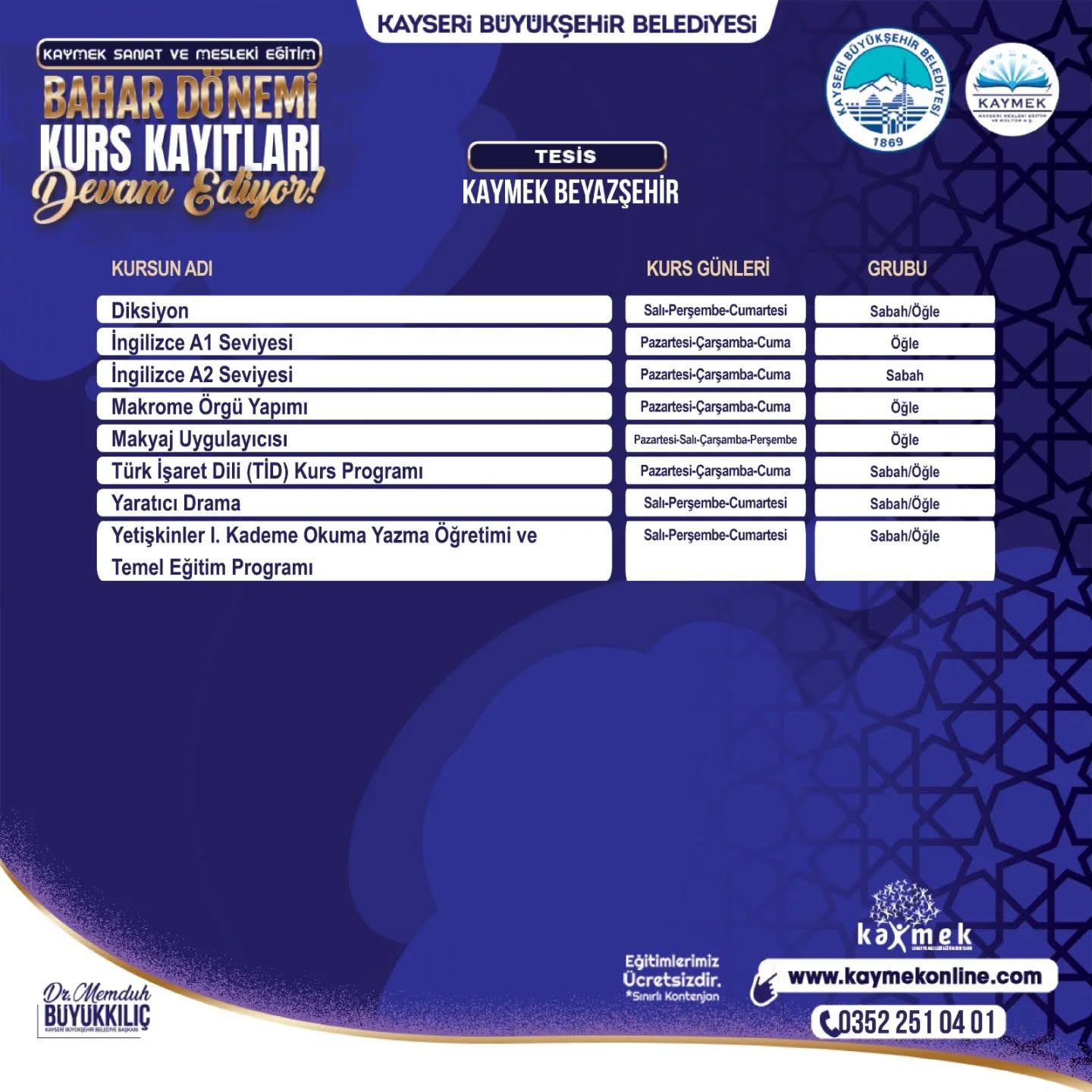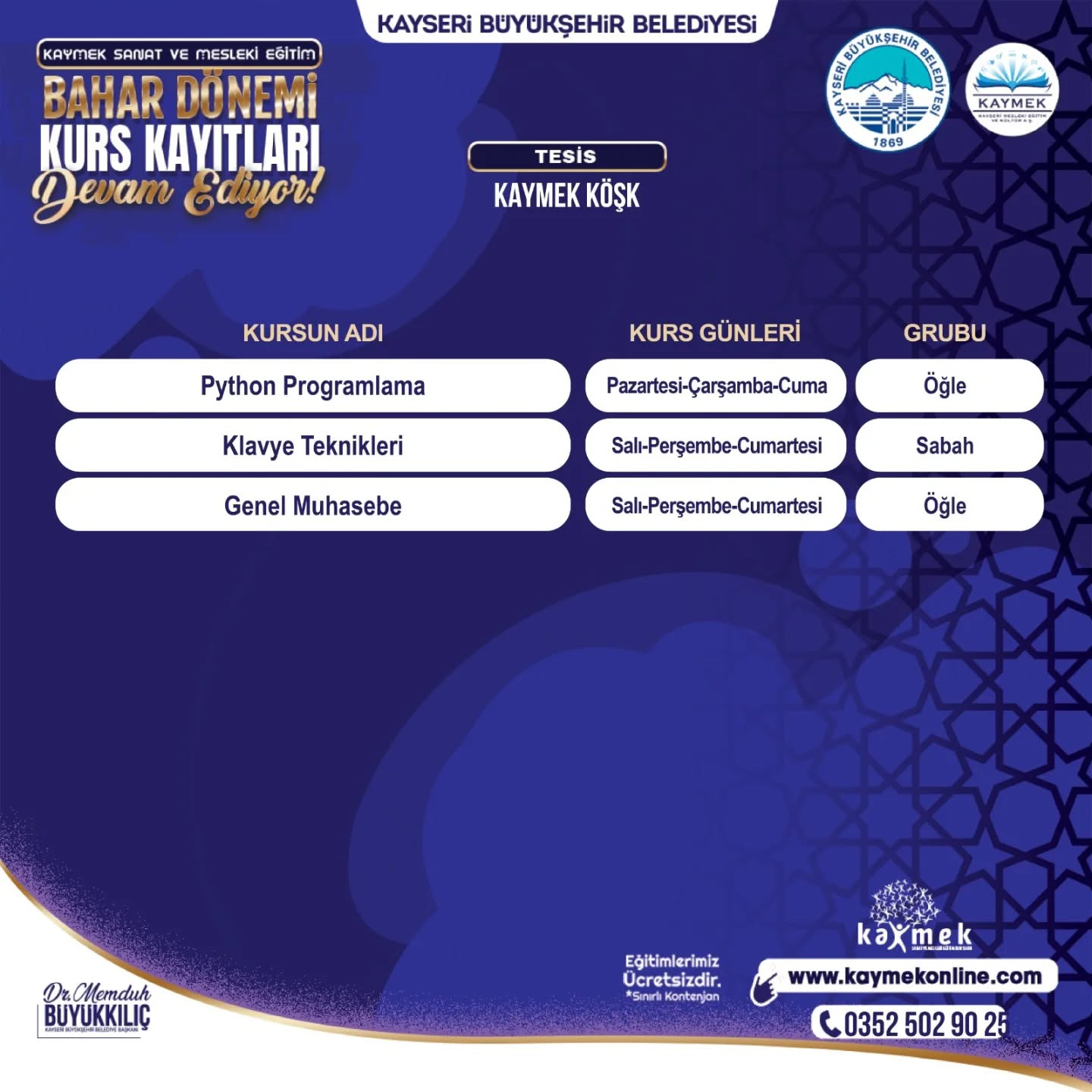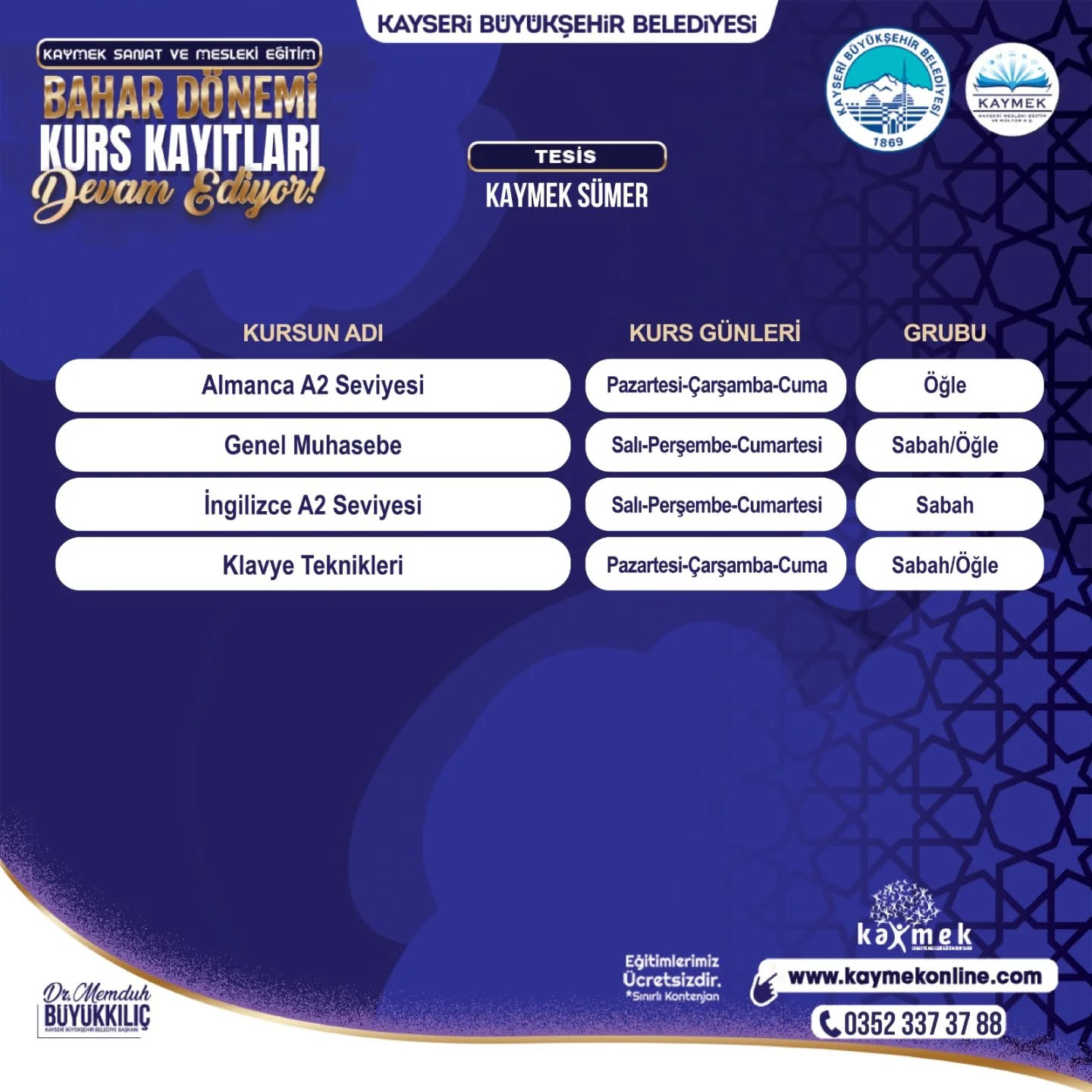 KAYMEK’in alanında uzman eğitmenleri tarafından tamamen ücretsiz olarak verilecek ve kontenjanları sınırları olan kurslar için kayıtlar www.kaymekonline.com internet adresi üzerinden gerçekleştirilebilecek. Kurslar hakkında detaylı bilgiye de bu internet adresi üzerinden ve 0 352 231 80 31 numaralı telefon üzerinden erişebilecek vatandaşlar, 1 Şubat 2026 tarihine kadar kayıt işlemlerini yapabilecek.