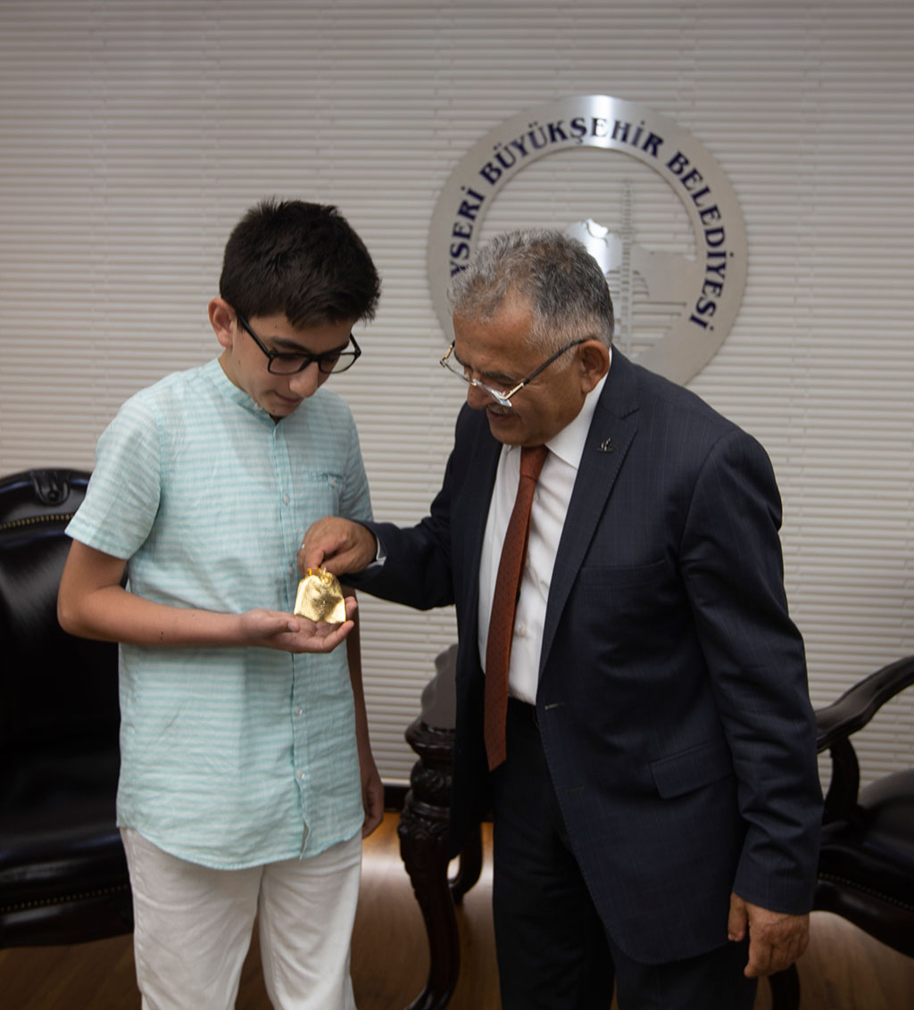 Öğrencilere eğitim desteği veren KAYMEK bünyesindeki Genç KAYMEK, Liselere Giriş Sınavı’nda Türkiye birincisi çıkarma başarısını gösterdi. Büyükşehir Belediye Başkanı Dr. Memduh Büyükkılıç, tüm soruları doğru cevaplayarak Türkiye birincisi olan Genç KAYMEK öğrencisi Fatih Vahip Demir ile görüştü ve başarıyı ödüllendirdi. Liselere Girişi Sınavı’nda (LGS) Türkiye birincisi olma başarısını gösteren Fatih Vahip Demir, Büyükşehir Belediye Başkanı Dr. Memduh Büyükkılıç’ı ziyaret etti. Fatih’i bu başarısından dolayı tebrik eden Başkan Memduh Büyükkılıç, “KAYMEK’in yaptığı önemli çalışmaların ürünlerini alıyoruz. Öğrencimiz LGS’de Türkiye birincisi oldu. Hem kutluyoruz, hem de başarılarının devamını diliyoruz. Öğrencimiz yazılım mühendisi olacağını söylüyor. Bu konuda da kendisine her türlü desteği vereceğiz. KAYMEK’teki gerek öğretmenlerimize gerek birim yetkililerine teşekkür ediyorum. Bu sayının daha da artmasını diliyorum” dedi. Fatih Vahip Demir de üç yıldır Genç KAYMEK öğrencisi olduğunu ifade ederek, “KAYMEK’in verdiği hizmetlerden dolayı memnunum. Üç yıldır eğitim görüyorum. Gerçekten bana çok katkıları oldu. Başkanımıza da hizmetlerinden dolayı teşekkür ediyorum” diye konuştu. Başkan Memduh Büyükkılıç, Fatih Vahip Demir’i başarısından dolayı altınla ödüllendirdi.