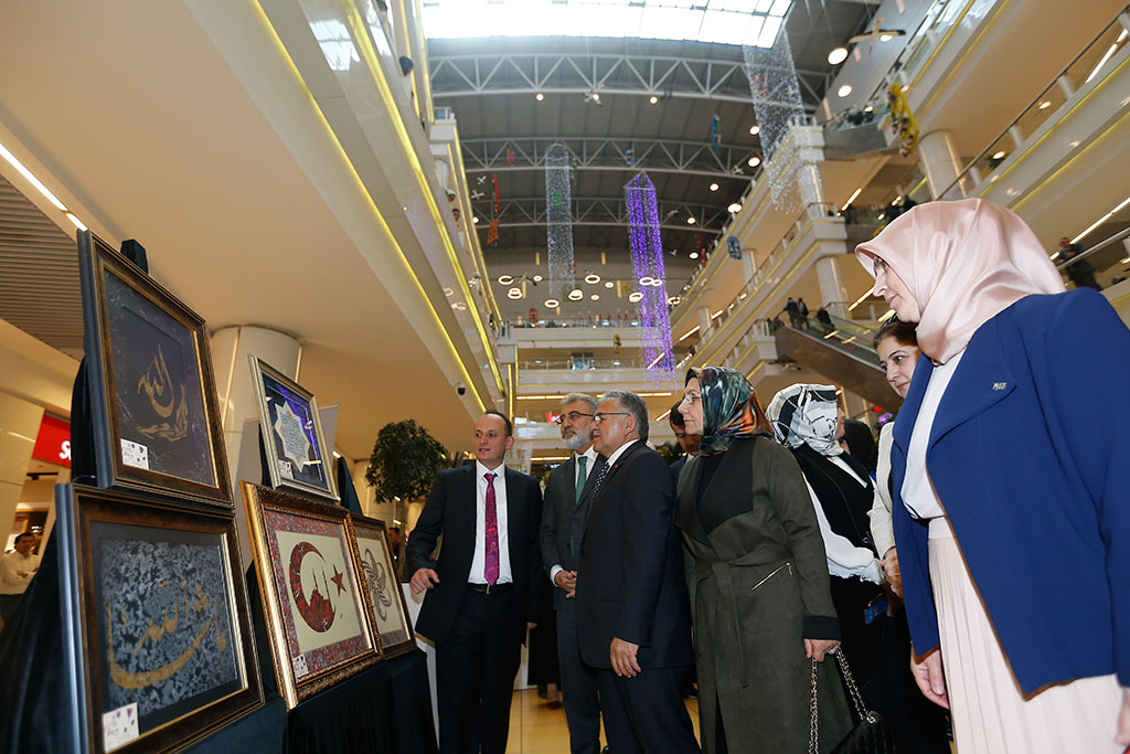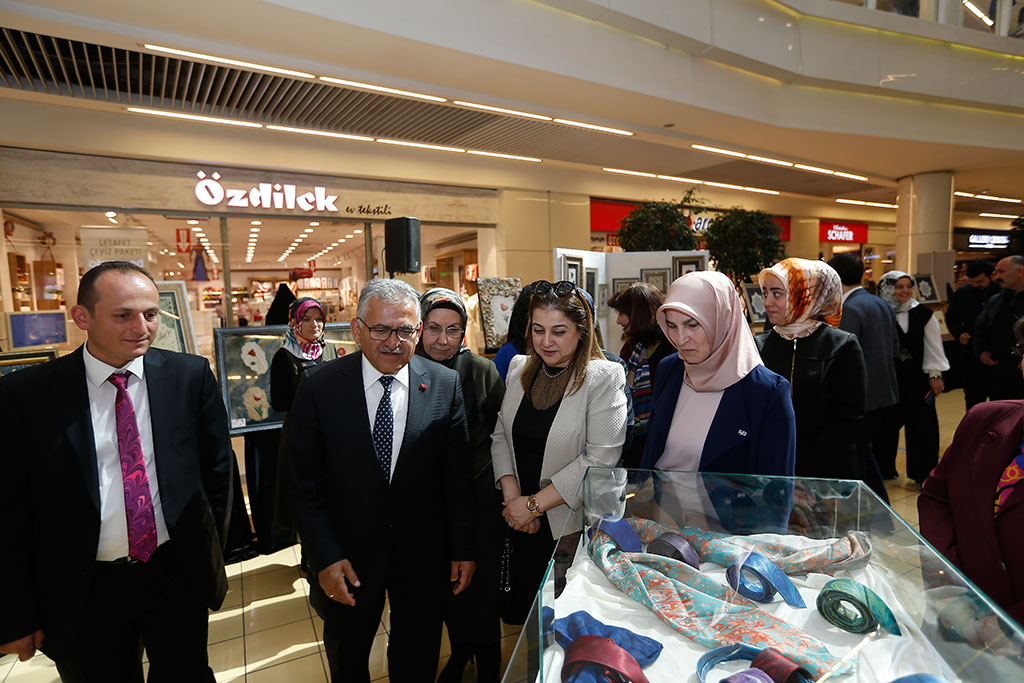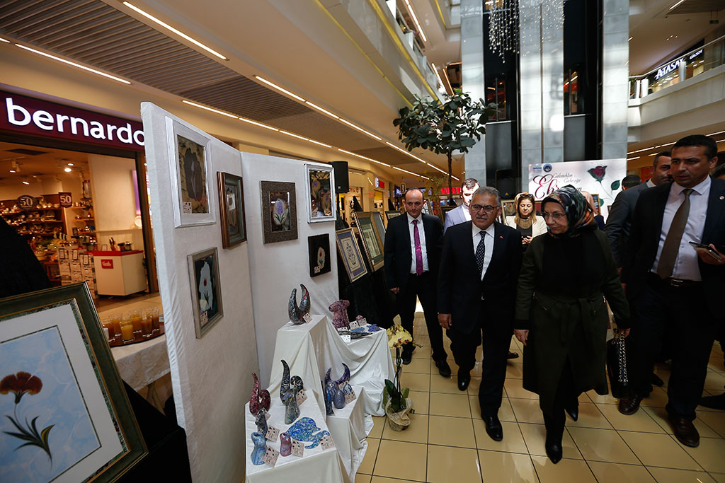 Sanat ve mesleki eğitimde Anadolu’nun markası olan KAYMEK, ürünleri sergilemeye devam ediyor. “Gelenekten Geleceğe Ebrunun Yolculuğu” konulu sergiyi Büyükşehir Belediye Başkanı Dr. Memduh Büyükkılıç da gezdi. Büyükşehir Belediyesi bünyesindeki KAYMEK Sanat ve Mesleki Eğitim Kursları, farklı branşlardaki sergilerine bir yenisini daha ekledi. Kayseri Park Alışveriş Merkezi’nde KAYMEK tarafından hazırlanan “Gelenekten Geleceğe Ebrunun Yolculuğu” adlı sergiyi Büyükşehir Belediye Başkanı Dr. Memduh Büyükkılıç’ın eşi Dr. Necmiye Büyükkılıç, Vali Şehmus Günaydın'ın eşi Aysel Günaydın ile birlikte açtı. Ebru sanatıyla yapılmış 78 çalışmanın yer aldığı sergiyi Büyükşehir Belediye Başkanı Memduh Büyükkılıç da katıldığı bir program dönüşünde AK Parti Kayseri Milletvekili Taner Yıldız ile birlikte gezdi.