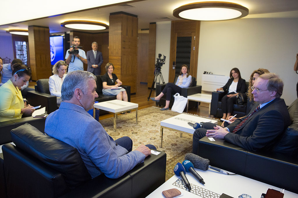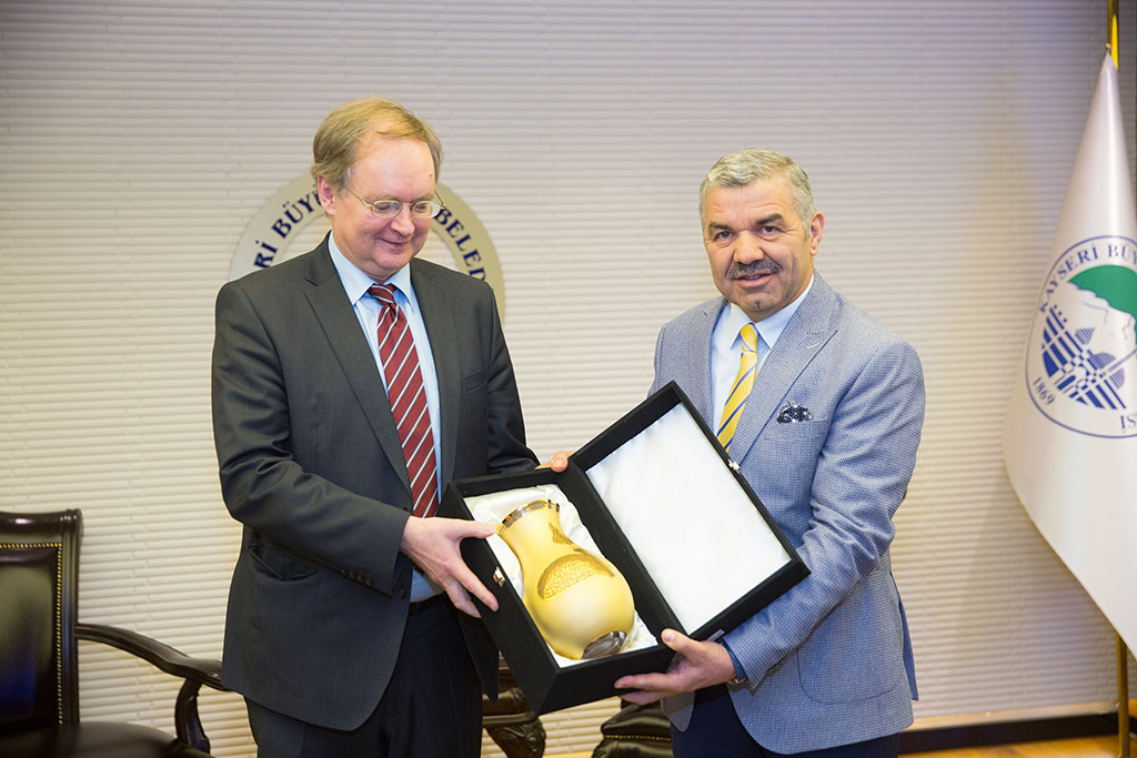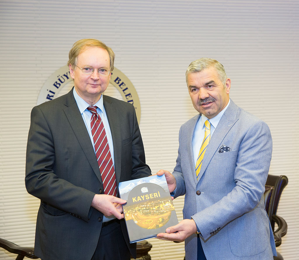 İki günlük program için Kayseri’ye gelen AB Türkiye Delegasyonu Başkanı Christian Berger, Büyükşehir Belediye Başkanı Mustafa Çelik’i ziyaret ederek bir süre görüştü. Sıcak ve samimi bir ortamda gerçekleşen ziyarette karşılıklı görüş alışverişinde bulunuldu. AB Delegasyonu Başkanı Berger, Kayseri’den çok etkilendiğini belirtti ve Kayseri Büyükşehir Belediyesi’nin bazı çalışmalarının Avrupa’daki şehirlerde uygulanabileceğini söyledi. Büyükşehir Belediye Başkanı Mustafa Çelik, Avrupa Birliği Türkiye Delegasyonu Başkanı Christian Berger ve Türkiye Delegasyonu yöneticilerini Başkanlık girişinde karşıladı. Büyükşehir Belediye Başkanı Çelik, Christian Berger ile bir süre görüştü. AB Delegasyonuna Kayseri hakkında bilgiler veren Başkan Çelik, Kayseri’nin 6 bin yıllık tarihe sahip birçok medeniyete ev sahipliği yapmış bir şehir olduğunu söyledi. Güçlü bir ticari geçmişe sahip olduklarını ifade eden Başkan Çelik, “Şehircilik açısından da 147 yıllık geçmişe sahip bir belediyeyiz. Projeleriyle takip edilen, örnek alınan işler yapıyoruz. Planlı ve düzgün gelişen bir şehiriz. Şehirdeki planlı gelişim insanların yüzüne de yansıyor. Huzurlu ve mutlu insanların yaşadığı bir şehirde bulunuyoruz. Ayrıca, şehrin tüm yönetim dinamikleri arasında bir uyum vardır. Bu uyum Kayseri’yi Türkiye’deki diğer şehirlerden daha hızlı büyütüyor” dedi. AB Türkiye Delegasyonu Başkanı Christian Berger de çok sıcak bir şekilde karşılandıkları için teşekkür etti. Ziyareti öncesinde Türkiye ile ilgili rehber bir kitap okuduğunu ifade eden Berger, “Bu kitapta Kayseri hakkında anlatılan bilgilerden çok etkilendim. Hem tarihi zenginlik hem de güçlü ekonominin birleşimi bu şehirde var. Kökleri derin bir geçmiş ve girişimci bir ruhu taşıyor. Bu da şehri ilginç hale getiriyor” diye konuştu. Kayseri’de yapacakları görüşmelerin yanı sıra bazı projeleri yerinde görmek istediklerini de belirten AB Delegasyonu Başkanı Berger, bazı projelere de destek vermek üzere geldiklerini söyledi. Başkan Çelik, bu açıklama üzerine Kayseri’de yaşayan Suriyelilerle ilgili İller Bankası ile birlikte yürüttükleri projeden bahsetti ve Avrupa Birliği’nin bu projeye destek verdiğini söyledi. Başkan Mustafa Çelik görüşme sırasında Kayseri’nin ticari genlerinin kaynağı olan Kültepe’den ve burada çıkarılan tabletlerden de bahsetti. Kazılarda çıkan bir tableti örnek gösteren ve bu tablette yazanları AB Delegasyonuna anlatan Başkan Çelik, “Eski tabletlerin yerine artık yeni tabletler kullanıyoruz. Bizim coğrafi anlamda avantajlarımız yok; ama en önemli değerimiz müteşebbis, girişimci insanımız. Girişimcilerimiz iş ve kaynak yaratarak bu şehri geliştiriyorlar” dedi. Kayseri ile ilgili anlatılanlardan etkilenen AB Delegasyonu Başkanı Christian Berger de Kayseri’nin özellikle şehir planlaması konusunda önde olduğunun görüldüğünü belirtti ve “Sizin yaptığınız bazı uygulamalardan yeni şeyler öğrenip Avrupa’da uygulayabiliriz” ifadelerini kullandı. Ziyarette Büyükşehir Belediye Başkanı Mustafa Çelik, AB Delegasyonu Başkanı Christian Berger’e el yapımı vazo ve Büyükşehir Belediyesi’nin bastırdığı Kayseri hakkında yazılmış kitabı hediye etti.