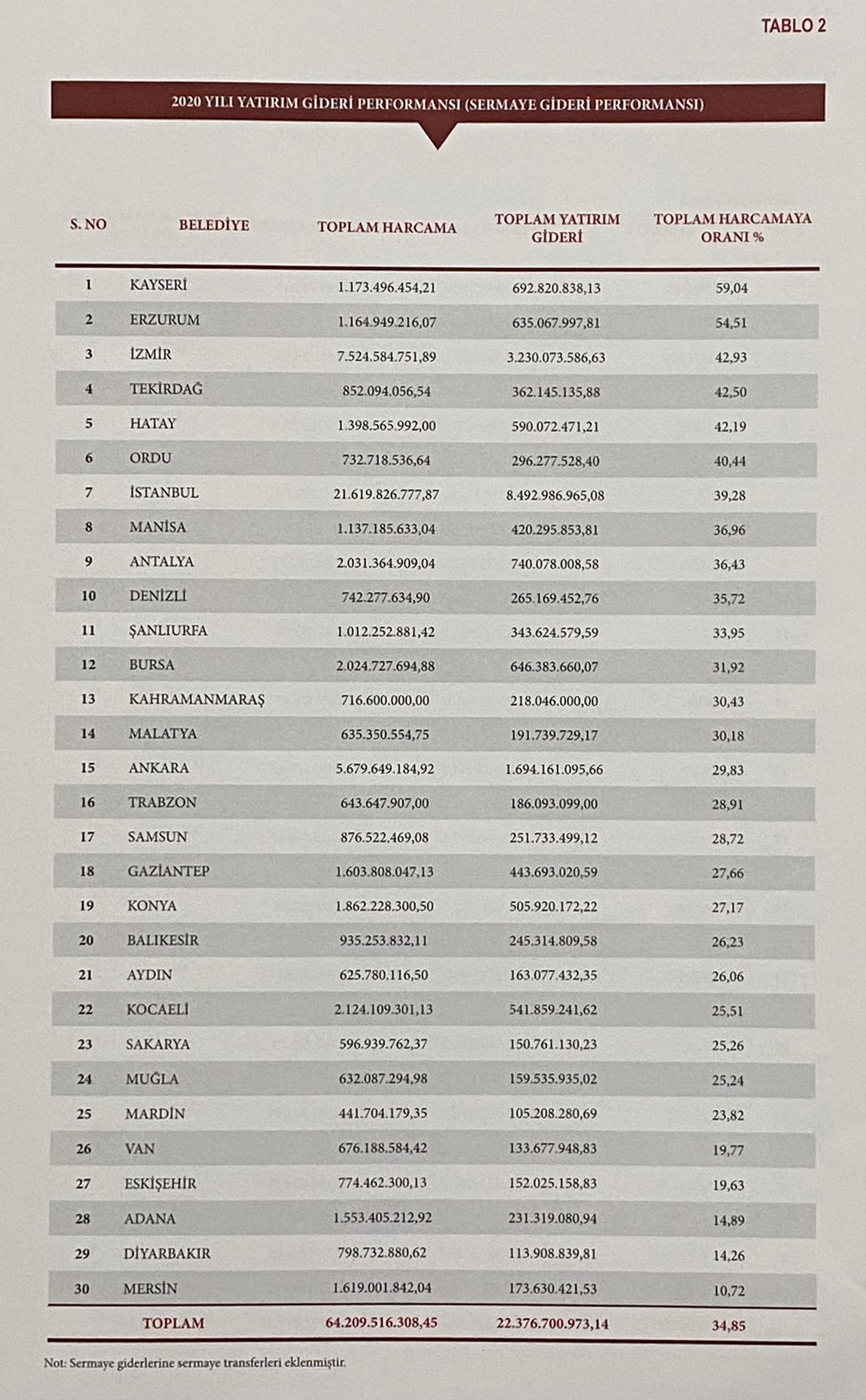 30 Büyükşehir Belediyesi arasında birinci oldu. Bütçesinden yatırıma en çok