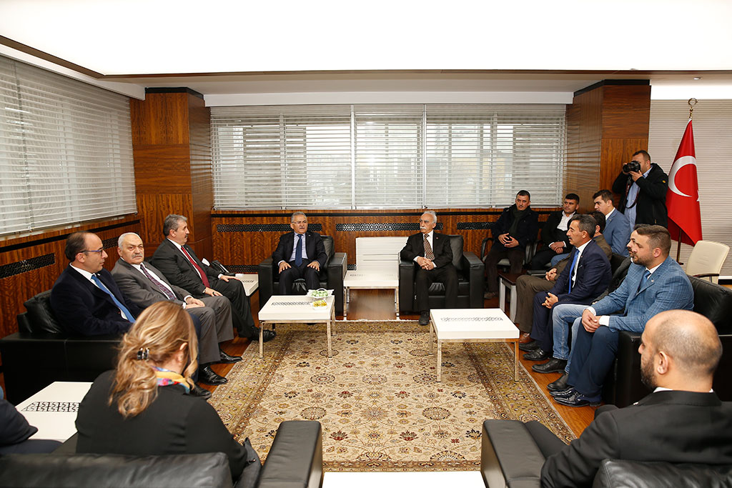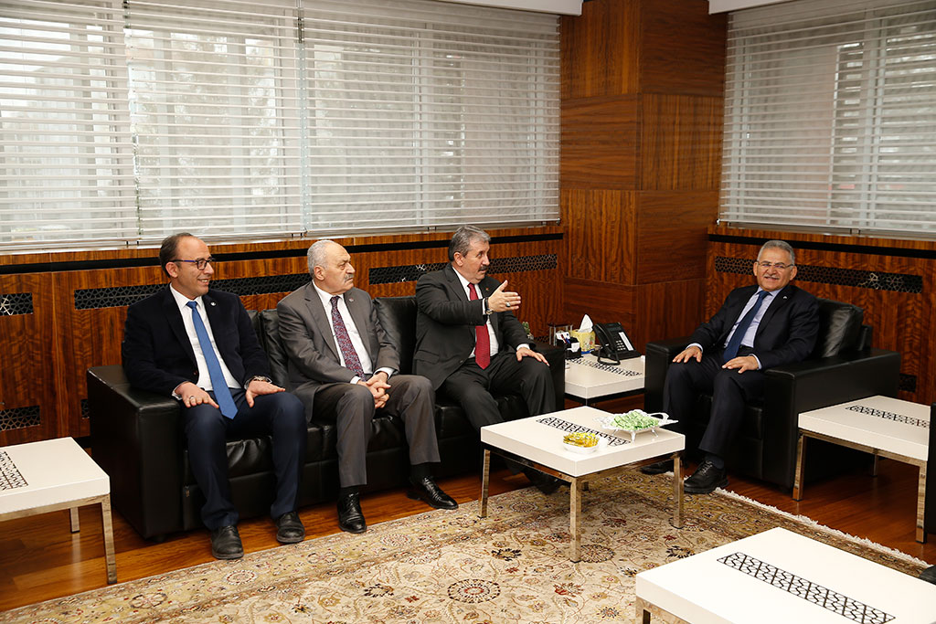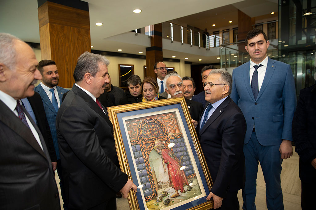 Büyük Birlik Partisi Genel Başkanı Mustafa Destici, Kayseri Büyükşehir Belediye Başkanı Dr. Memduh Büyükkılıç’ı ziyaret etti. BBP Genel Başkanı Destici Kayseri’nin bölgenin parlayan yıldızı olduğunu belirtti. Büyükşehir Belediye Başkanı Dr. Memduh Büyükkılıç, BBP Genel Başkanı Mustafa Destici’yi Başkanlık girişinde karşıladı. Ziyaretten duyduğu memnuniyeti dile getiren Başkan Memduh Büyükkılıç, Büyük Birlik Partisi’nin kurucu genel başkanı Merhum Muhsin Yazıcıoğlu ile aynı dönemde milletvekilliği yaptığını ve birlikte hacca gittiğini belirtti. Büyük Birlik Partisi Genel Başkanı Mustafa Destici de, Başkan Büyükkılıç’ın Büyükşehir Belediyesi’nde çok başarılı hizmetlere imza atacağına yürekten inandığını söyledi. 2020’de Ankara dışındaki ilk ziyaretlerini Kayseri’ye yaptıklarını ifade eden Destici, “Kayseri, ülkemiz için önemli bir şehir. Bölgenin adeta parlayan yıldızı. Sadece Cumhuriyet döneminde değil cumhuriyet dönemi öncesinde de önemli olan kadim bir şehir” diye konuştu. GENEL BAŞKANA KAYMEK SERGİSİ’NDEN HEDİYE Büyükşehir Belediye Başkanı Dr. Memduh Büyükkılıç, BBP Genel Başkanı Mustafa Destici ile birlikte Büyükşehir Belediyesi Sergi Salonu’nda KAYMEK tarafından açılan sergiyi de gezdi. Başkan Büyükkılıç, sergide yer alan “Kaplumbağa Terbiyecisi” tablosunu ziyaretin anısına Genel Başkan Destici’ye ziyaret etti.