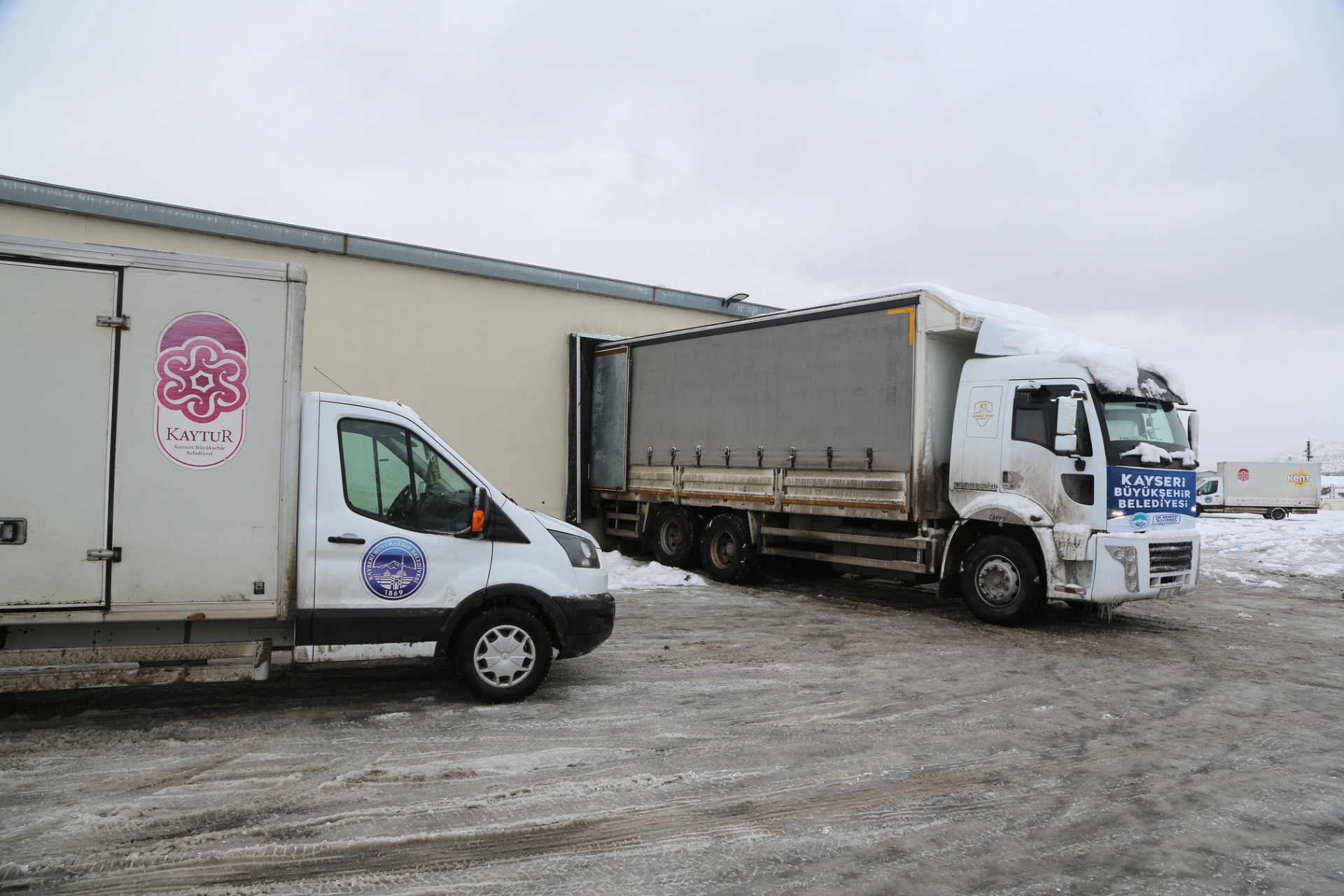 ve battaniye gibi malzemelerle dolu 20 ayrı yardım tırı ile 3 yardım kamyonun