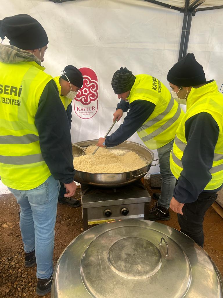 Kayseri Büyükşehir Belediyesi sulu yemekler başta olmak üzere beyaz ve kırmızı et yemekleri ile çorbanın yanı sıra pek çok yiyecek ve içeceği, depremin merkezi Kahramanmaraş’taki deprem bölgesinde KAYTUR aracılığıyla gıda yüklü 10 araç, 5 mobil mutfak ve 20 kişilik aşçı ekibi ile bölgedekilere ulaştırıyor. Kayseri Büyükşehir Belediyesi’nin oluşturduğu yemek stantlarında, günlük 15 bin depremzede ve görevliye sıcak yemek dağıtımı gerçekleştiriliyor.