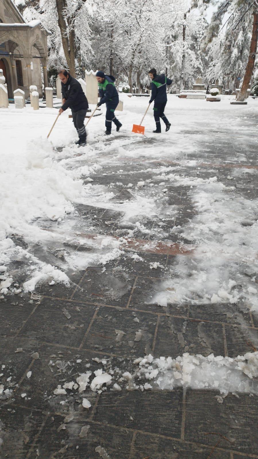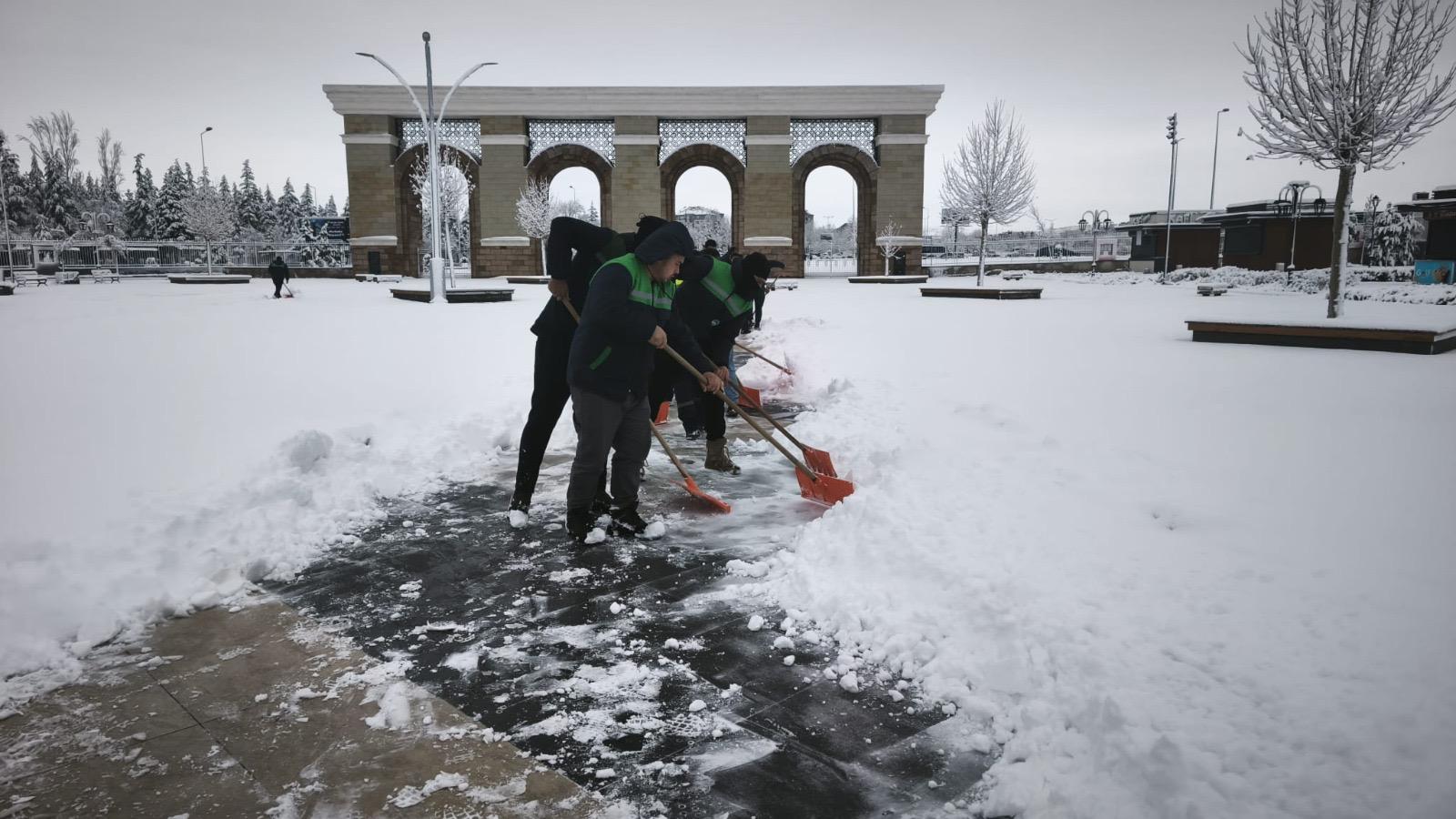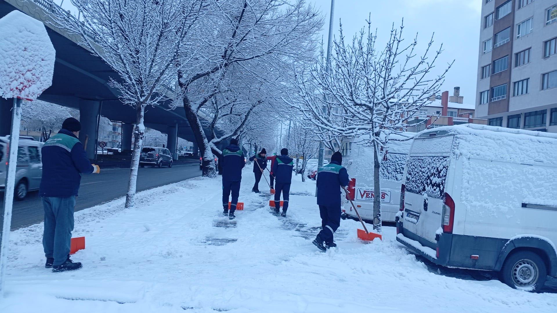 Park ve Bahçeler Daire Başkanlığı ekipleri de 72 personel ile yaya yolları ve kaldırımlarda kar temizliği çalışmaları yaparak vatandaşların güvenliğini sağlıyor.
