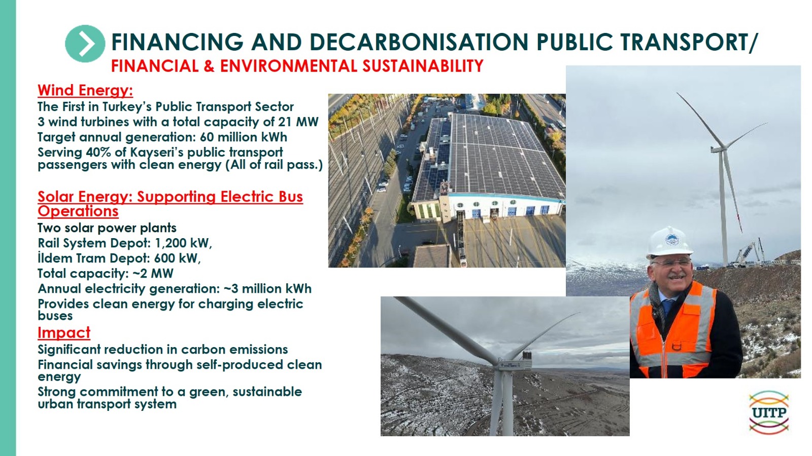 Sunumun en çok ilgi gören başlıklarından biri, Kayseri’nin temiz enerji alanında yürüttüğü öncü çalışmalar oldu. Erdoğan, Kayseri’de kurulan rüzgâr enerji santrali ve güneş enerji santrali sayesinde raylı sistemin enerji ihtiyacının yüzde 100 oranında yenilenebilir kaynaklardan karşılandığını belirtti. Ayrıca bu tesislerin elektrikli otobüslerin enerji ihtiyacına da önemli katkı sağladığını ifade etti. Bu örnek uygulamalar, konferans katılımcıları tarafından büyük beğeniyle karşılandı ve çok sayıda soruya konu oldu.