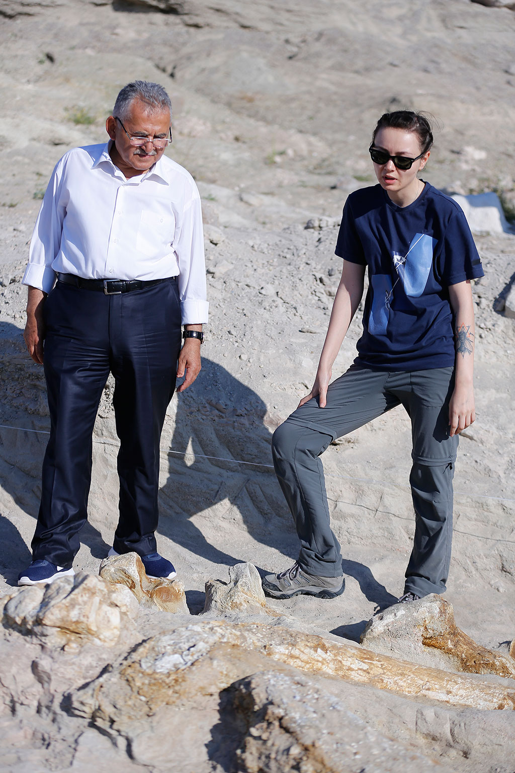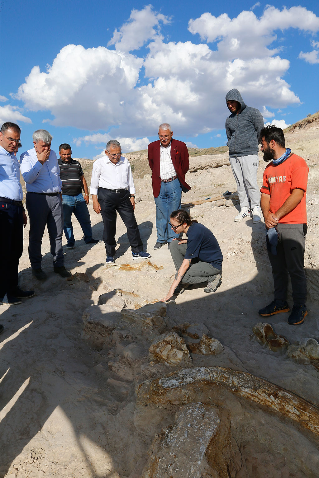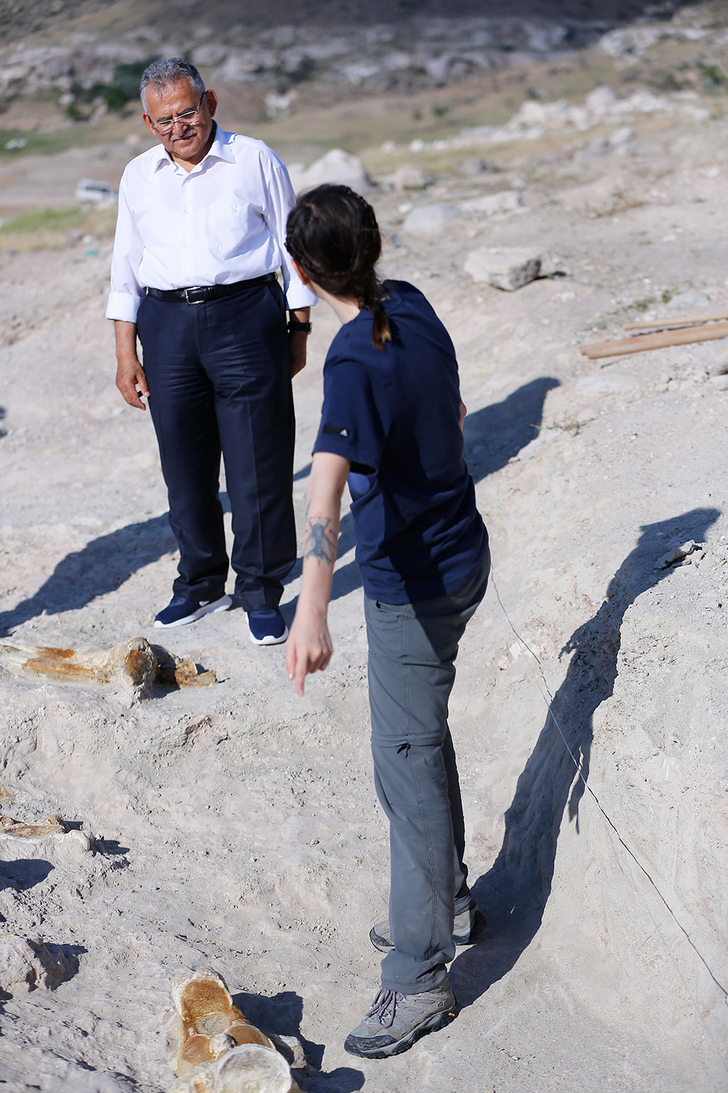 Kayseri Büyükşehir Belediyesi’nin destekleriyle Taşhan bölgesinde yapılan kazı çalışmalarında 7,5 milyon yıllık yeni fosiller bulundu. Buluntular arsında yer alan ve neredeyse tamamı korunmuş halde bulunan zürafa fosili dikkat çekiyor. Kayseri’deki bu önemli buluntular Avrupa’daki bilim insanlarının da dikkatini çekiyor. Büyükşehir Belediye Başkanı Dr. Memduh Büyükkılıç, kazı bölgesine giderek bilim insanları ile görüştü. Kayseri Büyükşehir Belediye Başkanı Dr. Memduh Büyükkılıç, Yamula Barajı kenarındaki Taşhan bölgesine giderek fosil kazılarına ilişkin çalışmaları yerinde inceledi. Kazı bölgesinde yer alan Ankara Üniversitesi Paleoantropoloji Ana Bilim Dalı Öğretim Görevlisi Uzman Antropolog Özge Kahya, Başkan Büyükkılıç’a kazı çalışmalarıyla ilgili bilgi verdi. Kazı çalışmalarında 7,5 milyon yıllık filler, zürafalar, atlar ve gergedanlara ait fosiller bulduklarını ifade eden Kahya, Kayseri Büyükşehir Belediyesi’nin destekleriyle hız kesmeden kazılara devam ettiklerini söyledi. Özge Kahya, neredeyse tamamı korunmuş halde bulunan 7,5 milyon yıllık zürafa fosili ile ilgili Başkan Büyükkılıç’a açıklamalarda bulundu. Büyükşehir Belediye Başkanı Dr. Memduh Büyükkılıç da Taşhan, Çevril, Kuşçu bölgesinin çok zengin bir bölge olduğunu dile getirerek, “7,5 milyon öncesine ait zürafa, at, fil ve gergedana ait olan parçaları görüyoruz. Yeni buluntular arasında zürafanın üst çenesi ait olan bir fosil ve fillere ait omurlar ve kürek kemiği söz konusu. Bu bölgede çalışmaları devam ettirip, daha sonraki süreçte kamuoyunun ziyaretine açma şeklinde bir çalışma yapacağız. Fedakar ekibimize teşekkür ediyoruz” dedi. YABANCI BİLİM İNSANLARININ İLGİSİNİ ÇEKİYOR Kayseri’de Büyükşehir Belediyesi’nin destekleriyle bulunan ve dünyada eşine ender rastlanır özellikleri olan fosil grubu Avrupa’daki bilim insanlarının da ilgisini çekiyor. Buluntuları görmek için Finlandiya-Helsinki Üniversitesi’nden Jeolog Matti Lehikoinen, Almanya-Frankfurt Doğa Bilimi Enstitüsü’nden Jeomorfolog Maud Meijer ve Almanya-Berlin Doğa Tarihi Müzesi’nden Faysal Bibi Kayseri’ye gelecek.