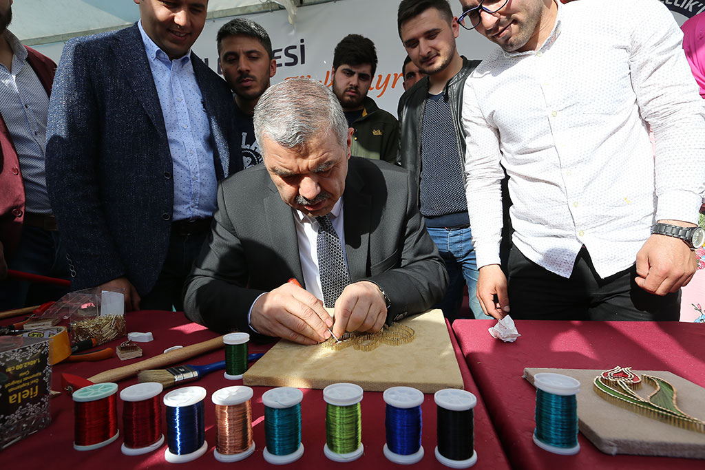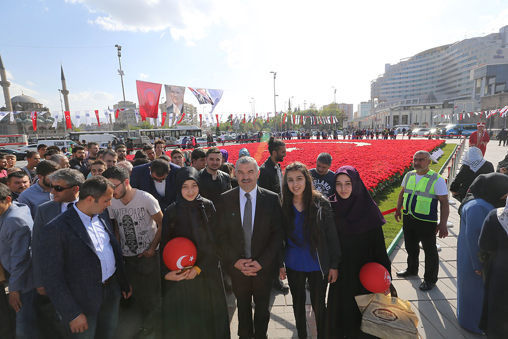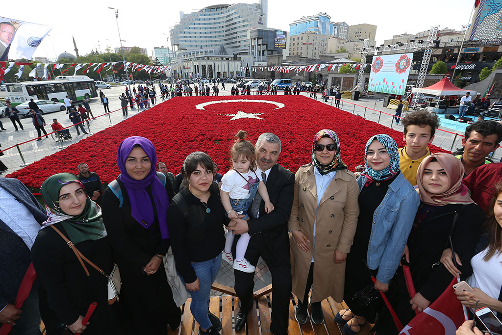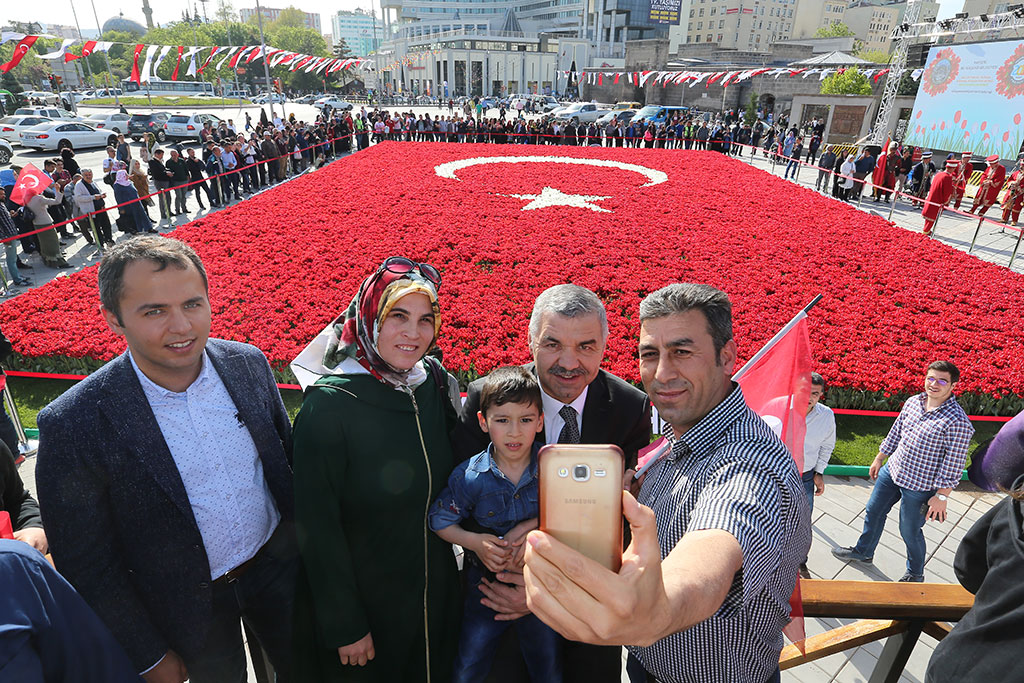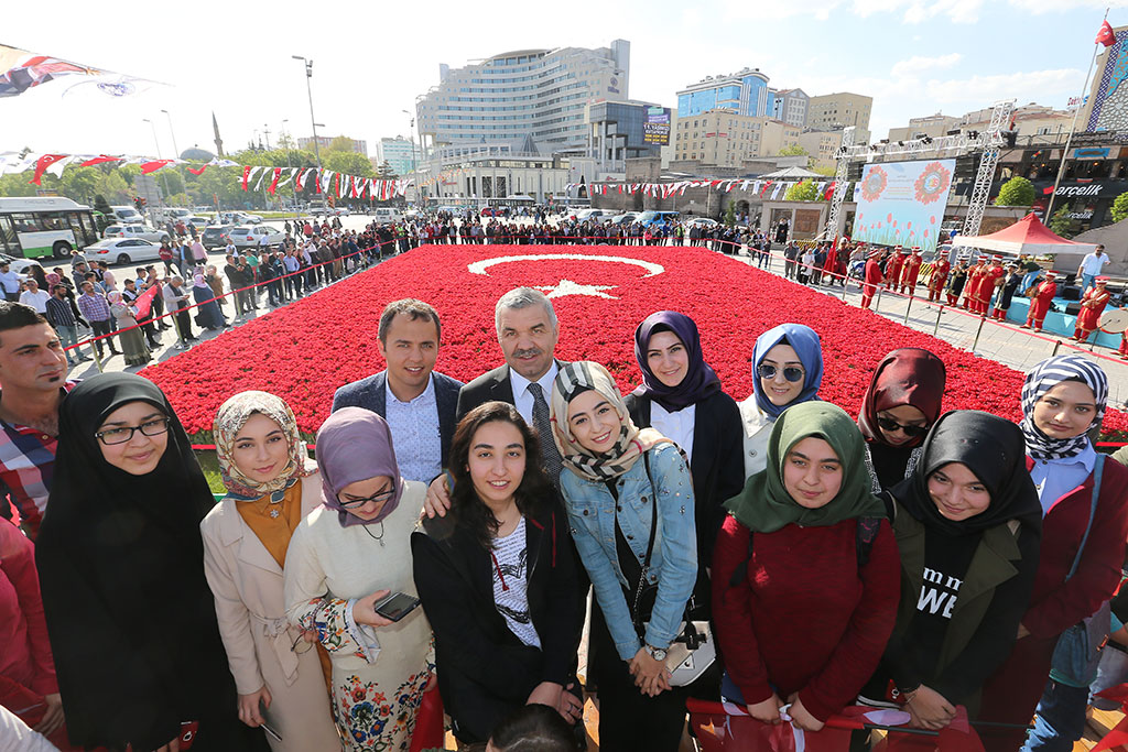 Büyükşehir Belediyesi’nin Cumhuriyet Meydanı’nda yaptığı lale peyzajlı dünyanın en büyük bayrağına halkın ilgisi artarak devam ediyor. Büyükşehir Belediye Başkanı Mustafa Çelik de akşam saatlerinde Cumhuriyet Meydanı’na giderek bu ilgiyi yerinde gördü ve vatandaşlarla bu anı ölümsüzleştirdi. 461 kişinin 13 saatlik bir çalışmayla yaptığı dünyanın en büyük bayrağı Kayseri’ye dünya rekorunu getirdi. Bu alandaki dünya rekorunun Türk Bayrağı olmasını sağlayan Büyükşehir Belediyesi, Cumhuriyet Meydanı’na farklı bir güzellik getirdi. Bu güzelliği görmek isteyenler şehrin dört bir tarafından Cumhuriyet Meydanı’na gelerek Türk Bayrağı önünde fotoğraflar çektiriyor. Büyükşehir Belediye Başkanı Mustafa Çelik de Cumhuriyet Meydanı’na giderek vatandaşlarla fotoğraf çektirdi. Meydana gelenler arasında AK Parti Gençlik Kolları da vardı. Başkan Çelik, Gençlik Kolları üyeleriyle de fotoğraf çektirerek sohbet etti. Dünya rekoru bayrağımızı görmek için Cumhuriyet Meydanı’na gelenler için çeşitli etkinlikler de gerçekleştiriliyor. Vatandaşlar etkinlik alanında farklı Türk el sanatlarını yapma imkanı buluyorlar. Başkan Mustafa Çelik de stantlarda bir süre kalarak tablolar oluşturdu.