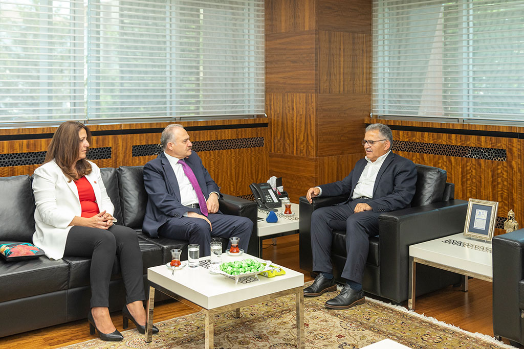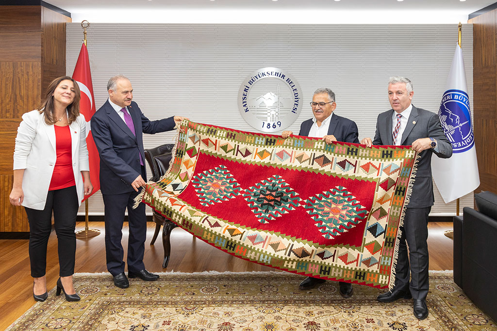 CHP Ankara Milletvekili ve Türkiye Büyük Millet Meclisi Başkanvekili Levent Gök, Büyükşehir Belediye Başkanı Dr. Memduh Büyükkılıç’ı ziyaret etti. Ziyarette, Kayseri’nin turizm değerleri konuşuldu ve bu değerlerin tanıtılması için yapılacak çalışmalardan bahsedildi. CHP Ankara Milletvekili ve TBMM Başkanvekili Levent Gök’ün Büyükşehir Belediye Başkanı Dr. Memduh Büyükkılıç’ı ziyaretine CHP Kayseri Milletvekili Çetin Arık ile İl Başkanı Ümit Özer de katıldı. Başkan Büyükkılıç, eşi Kayserili olan TBMM Başkanvekili Levent Gök’e, Kayseri’nin değerlerinden kök boyadan üretilmiş el emeği göz nuru bir kilim hediye etti. Ziyarette Kayseri’nin sahip olduğu güzelliklerden bahsedildi. Levent Gök’ün Kapuzbaşı şelalelerinin görmesini isteyen Başkan Memduh Büyükkılıç, şelalelerin dünyanın önemli güzelliklerinden olduğunu belirtti. Başkan Büyükkılıç ayrıca Koramaz Vadisi ve bu vadi çevresinde yer alan tarihi ve doğal güzellikler ve bu güzelliklerin turizme kazandırılması için yaptıkları çalışmalarla ilgili de bilgi verdi. Koramaz Vadisi, Germir, Mimar Sinan’ın doğduğu Ağırnas, Talas ve Kültepe’yi kapsayan çalışmalarla ilgili açıklamalarda bulunan Başkan Büyükkılıç, bu çalışmalarla Kayseri’ye yeni, değerler kazandıracaklarını kaydetti.
