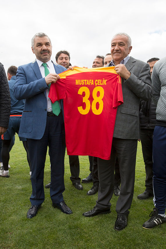Ziyarette Başkan Mustafa Çelik’e Kulüp Başkanı Mamur tarafından Kayserispor’un 38 numaralı forması hediye edildi. Forma için teşekkür eden Büyükşehir Belediye Başkanı Çelik, “İşlerimizin yoğunluğu nedeniyle sık gelemiyoruz; ama yüreğimiz hep Kayserispor ile birlikte. Her zaman yanınızdayız. Siz elinizden geleni yapın, bizler de elimizden geleni yapalım ve bu takımı layık olduğu yerde tutalım” diye konuştu.
