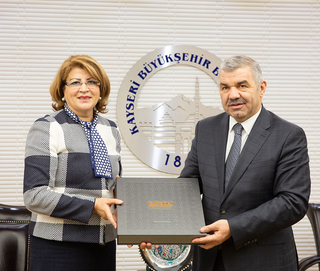 Azerbaycan Büyükelçiliği Eğitim Müşaviri Necibe Nesibova, Büyükşehir Belediye Başkanı Mustafa Çelik’i ziyaret etti. Ziyarette iki kardeş ülkenin ilişkilerinin daha da geliştirilmesine yönelik görüş alışverişinde bulunuldu. Azerbaycan’ın Ankara Büyükelçiliği Eğitim Müşaviri Necibe Nesibova, her iki ülke arasındaki ilişkileri ilerletme arzusunda olduklarını ifade ederek, “Kardeş ülkemizin her köşesindeki insanlarımızla kardeşliğimizi pekiştirmek istiyoruz” dedi. Büyükşehir Belediye Başkanı Mustafa Çelik de her zaman “İki devlet tek millet” ana prensibinde hareket ettiklerini belirtti. Karşılıklı kardeşlik ilişkisine çok önem verdiklerini ve kardeş şehir ilişkisi kurulmasıyla ilgili hafta sonu Haydar Aliyev öğrenci yurdunun açılışı için şehrimize gelen Azerbaycan Cumhurbaşkanı Yardımcısı Ali Hasanov ile görüştüklerini dile getiren Başkan Çelik, “Bakü’nün yanındaki Sumgayıt şehri ile kardeşlik konusunda yazışmalara başlayacağız. Bunun yanında ekonomik olarak da ilişkilerin geliştirilmesi lazım. Ekonomi her zaman politikanın önünde gitmiştir. Bu ilişkileri geliştirirsek iki tarafın da yararına olacaktır. Kayseri Ticaret ve Sanayi Odaları ile muhataplarını köprü vazifesi görerek bir araya getirebiliriz” dedi. Eğitim Müşaviri Nesibova’ya ziyareti sırasında Kayseri’deki üniversitelerde öğrenim gören Azeri öğrenciler de eşlik etti. Kayseri’de eğitim gören yabancı öğrencilere bakışını dile getiren Başkan Çelik, “Bu öğrenciler aynı zamanda bizim de evlatlarımız. Bunlar ömür boyu Kayseri’nin fahri temsilcileri gibi bizi anlatacaklar. İyi intiba ile ayrılırlarsa iyi anlatırlar” diye konuştu. Ziyarette Başkan Çelik, Azeri konuğuna Medeniyetler Şehri Kayseri Kitabını, Nesibova da Başkan Çelik’e Azerbaycan ve Türkiye’yi tek yürek şeklinde gösteren fincan takımını hediye etti.