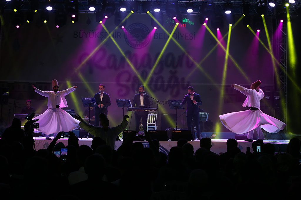 Büyükşehir Belediyesi’nin Ramazan Sokağı, birbirinden güzel etkinliklerle Ramazan gecelerine renk katmaya devam ediyor. Ramazan Sokağı’nın dokuzuncu gününde Kuran ve ilahilerle muhteşem bir gece yaşatıldı. Büyükşehir Belediyesi’nin Kurşunlu Otoparkı ve Mimarsinan Parkı’nda kurduğu Ramazan Sokağı her gün on binlerce kişiyi ağırlamaya devam ediyor. Saat 17.00’den itibaren açılan ve gece 01.00’a kadar farklı etkinliklerle devam eden Ramazan Sokağı’nda teravih namazı sonrası başlayan programlar da büyük ilgi görüyor. Ramazan Sokağı’nın 9. gününde sahneye ilk olarak Ünlü Hafız Ali Tel çıktı ve Kuran-ı Kerim okudu. Hafız Ali Tel’e programı sonrası izleyiciler arasında yer alan Gençlik Hizmetleri ve Spor İl Müdürü Murat Eskici tarafından çiçek verilerek teşekkür edildi. Ramazan Sokağı’nda daha sonra Grup Devran sahne aldı. Grup Devran birbirinden güzel ilahiler seslendirdi. İlahilere semazenler de eşlik etti. Program sonrası Büyükşehir Belediyesi Hukuk Müşaviri Orhan Erdoğan, Grup Devran’a teşekkür ederek çiçek verdi.