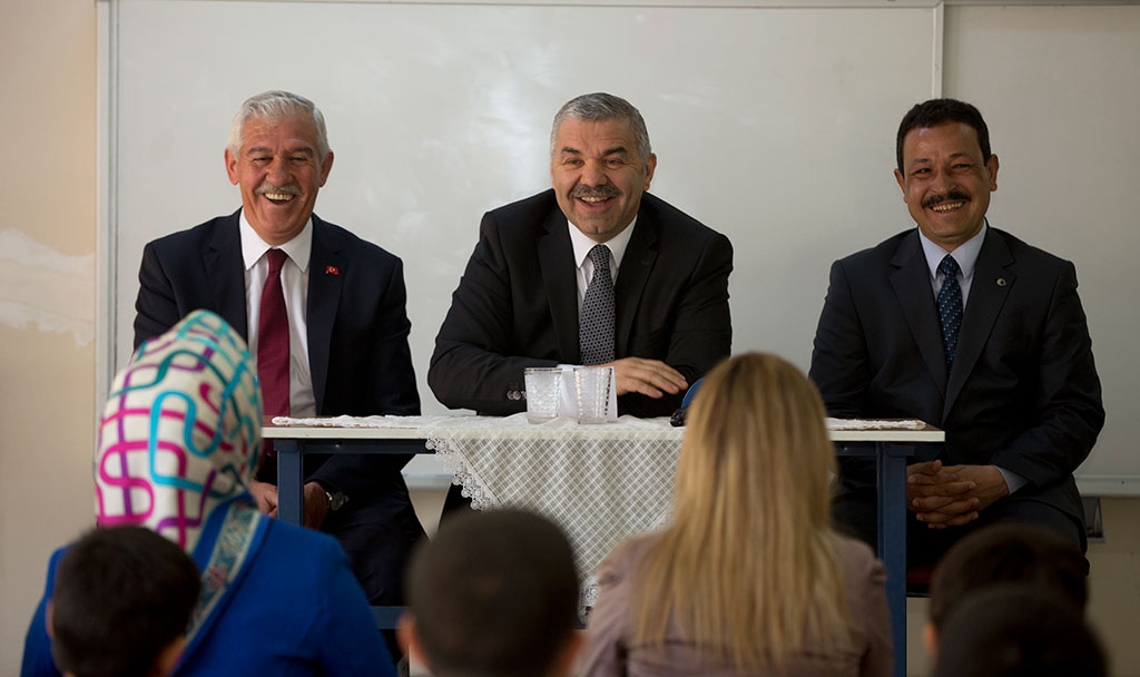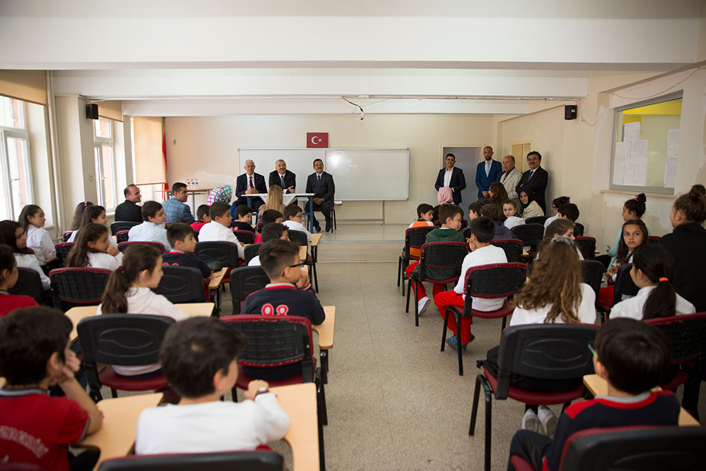 Büyükşehir Belediye Başkanı Mustafa Çelik, İl Milli Eğitim Müdürlüğü tarafından düzenlenen “Liderler Derste” programı kapsamında Besime Özderici İlkokulu 4. Sınıf öğrencileriyle bir araya geldi. Başkan Çelik, öğrencilere tecrübelerini aktardı ve çeşitli tavsiyelerde bulundu. Büyükşehir Belediye Başkanı Mustafa Çelik, Besime Özderici İlkokulu’nda İl Milli Eğitim Müdürü Osman Elmalı ve Okul Müdürü Sebahattin Durna tarafından karşılandı. Öğrencilerin çiçek takdim ettiği Başkan Çelik, 4. Sınıf öğrencileriyle bir araya geldi. Konuşmasına çocuklara sık sık sorulan “Ne olacaksınız?” sorusunu yönelterek başlayan Başkan Mustafa Çelik, çocuklardan cevapları aldıktan sonra bu sorunun cevabının bir meslek olmaması gerektiğini söyledi. Asıl olanın bir meslek sahibi olmaktan çok insan olmak olduğunu vurgulayan Başkan Çelik, “Öncelikle adam olacağım” cevabının verilmesi gerektiğini belirtti. Nasıl adam olunacağına dair de açıklamalar yapan Başkan Çelik, “Sevgi ve saygıda kusur etmeyeceğiz. Görev ve sorumluluk bilinci içinde olacağız. Eve gidince çantayı bir kenara atmamak, yemeği yiyince tabağı kaldırmak birer sorumluluktur” dedi. Küçük yaşta adalet bilincinin gelişmesi gerektiğini belirten ve “Adaletten hiç ayrılmayacaksınız” ifadelerini kullanan Başkan Çelik, “Hayatınız boyunca her yaşta adaletli olmak zorundasınız. Küçük kardeşiniz varsa onunla oyuncağınızı, sevginizi paylaşmak da adalettir. Bunlar günlük hayatta her zaman karşımıza çıkan olaylar” diye konuştu. Yardımseverlik, doğruluk, dürüstlük gibi kavramlardan da bahseden Başkan Çelik, “Doğruluk ve dürüstlüğü kendisine prensip edinmeyen kişi yönetici olamaz. Bu unsurlar en fazla yöneticilikte belli olur. Aklınızın köşesinde para, pul, makam, mevki, hırs gibi başka şeyler varsa o zaman doğruluktan ayrılırsınız. Kentinize çalışmak dururken kendinize çalıyorsanız yöneticilikten bahsedemezsiniz” dedi. Büyükşehir Belediye Başkanı Mustafa Çelik, sözlerinin sonunda öğrencilerden sanal alemden uzak durmalarını istedi. Sanal alemin insanlara hiçbir şey katmadığını vurgulayan Başkan Çelik, çocukların sokağa çıkarak oyun oynamasını ve gerçek alemle ilgilenmesini istedi. Başkan Çelik daha sonra öğrencilerden gelen soruları cevaplandırdı. Başkan Çelik, Besime Özderici İlkokulu’nun diğer sınıflarını da ziyaret ederek öğrencilere çeşitli sorular yöneltti.