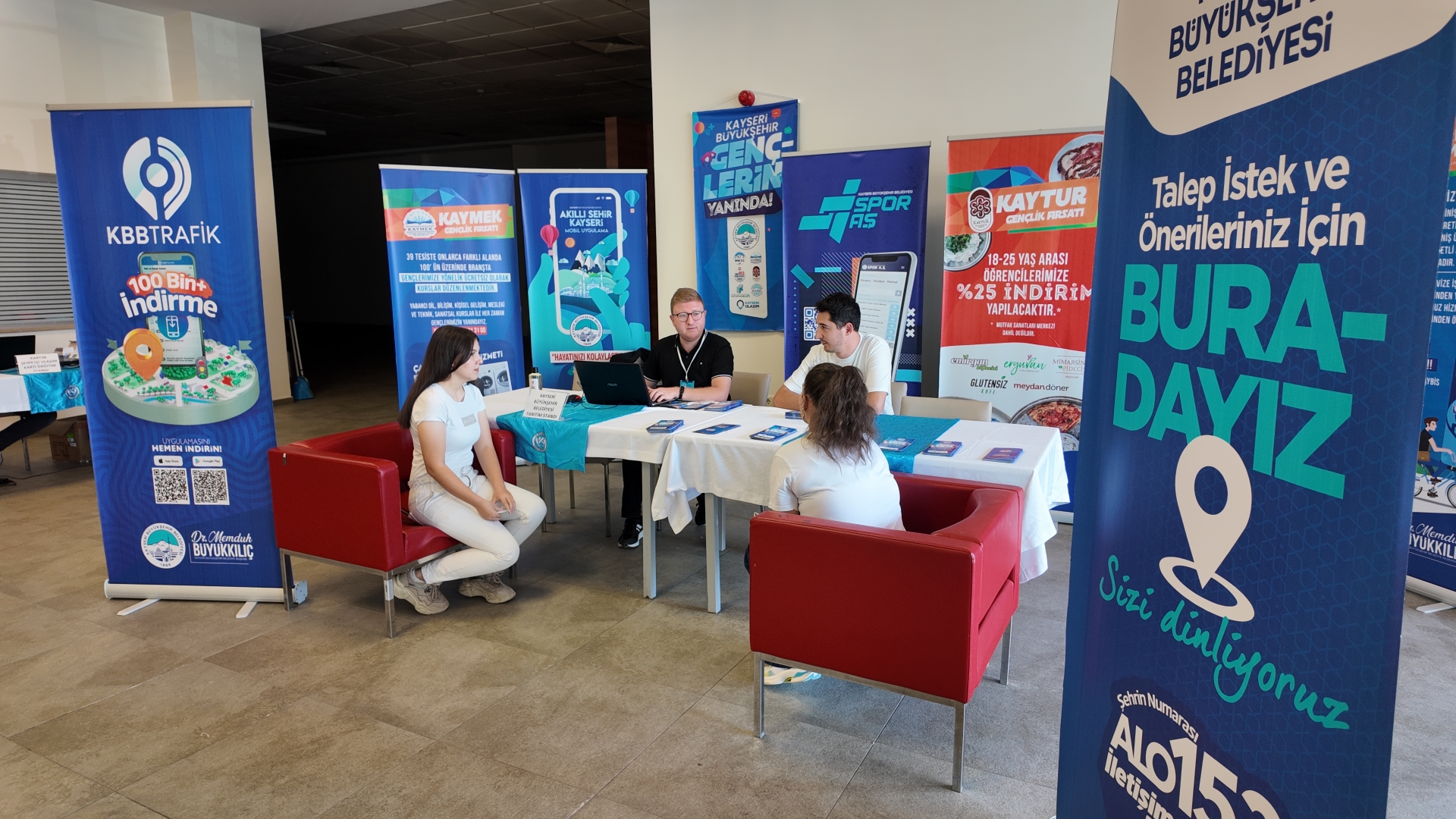 Bu çerçevede Büyükşehir Belediyesi Alo 153 İletişim Merkezi, Ulaşım A.Ş., ve KAYMEK A.Ş. tarafından Erciyes Üniversitesi, Kayseri Üniversitesi, Kayseri Cumhuriyet Meydanı, Kayseri Şehirler Arası Otobüs Terminali ve yurtlar bölgesinde kurulan stantlarla 09.00-17.00 saatleri arasında hizmet verilerek, Kayseri’ye gelen öğrenciler karşılanıyor ve Büyükşehir’in öğrencilere yönelik faaliyetleri de anlatılıyor.