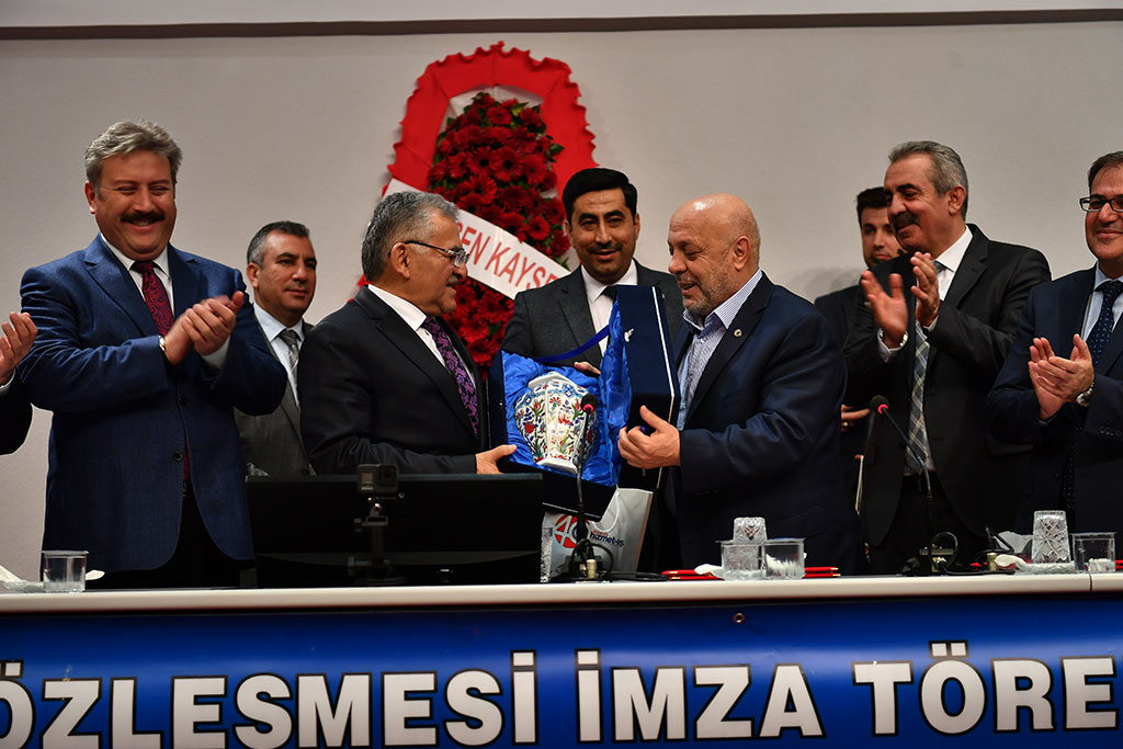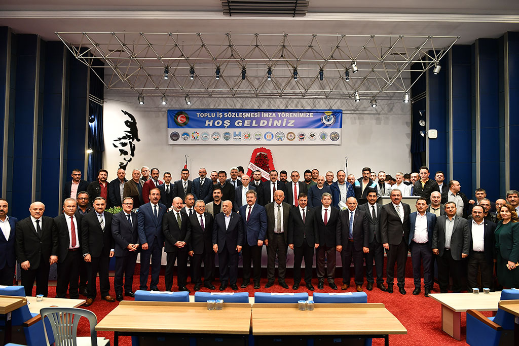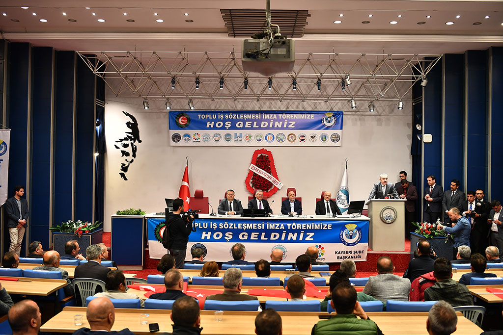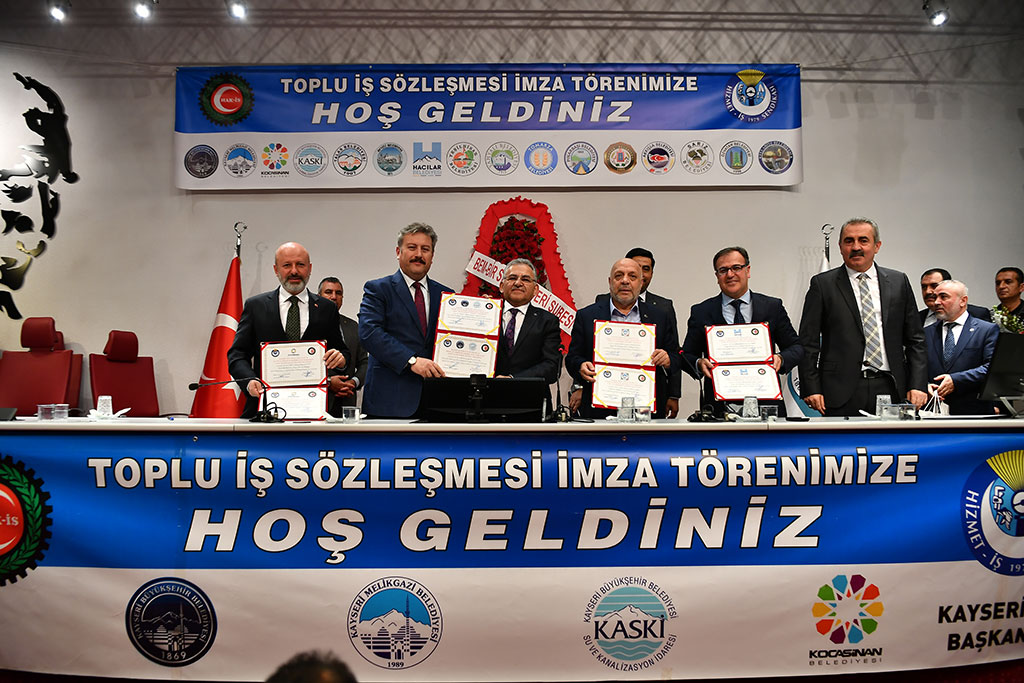 Kayseri Büyükşehir Belediyesi ile KASKİ ve ilçe belediyelerinin çalışanlarını kapsayan toplu sözleşme Türkiye’de örneği olmayan bir törenle imzalandı. Hak İş Konfederasyonu’na bağlı Hizmet İş Sendikası ile yürütülen toplu sözleşmelerin imza töreni Büyükşehir Belediye Başkanı Dr. Memduh Büyükkılıç ve ilçe belediye başkanlarının katılımıyla toplu halde gerçekleştirildi. Kayseri Büyükşehir Belediyesi Meclis Salonu’nda yapılan imza törenine Büyükşehir Belediye Başkanı Memduh Büyükkılıç, Hak İş Konfederasyonu ve Hizmet İş Sendikası Genel Başkanı Mahmut Arslan, ilçe belediye başkanları, bürokratlar ve çalışanlar katıldı. Saygı duruşu ve İstiklal Marşı’nın ardından Kuran-ı Kerim okundu. Törende konuşan Hizmet İş Sendikası Şube Başkanı Serhat Çelik, bazı belediyelerle bir yıl bazıları ile iki ve üç yıllık olarak toplu sözleşme yaptıklarını, sözleşmelerle sosyal ve mali haklarda yüzde 13 ile 17 arasında artış gerçekleştirildiğini söyledi. Hizmet İş Sendikası Genel Başkan Yardımcısı Halil Özdemir de konuşmasında Kayseri’dekine benzer toplu sözleşmenin Türkiye’nin başka bir yerinde görülemeyeceğini ifade ederek, “Her alanda liderliğini gösteren Türkiye’nin parlayan yıldızı Kayseri, toplu sözleşmede de liderliğini göstermiştir” dedi. Hak İş Konfederasyonu Genel Başkanı Mahmut Arslan ise toplu sözleşmedeki birliktelik nedeniyle Kayseri’yi tebrik etti. Büyükşehir ve ilçe belediyeleri arasındaki dayanışmayı takdir ettiğini dile getiren Arslan, bu manzaranın şehrin uzlaşmacı ve dayanışmacı kültürünün göstergesi olduğunu söyledi ve bunu sağlayan başta Büyükşehir Belediye Başkanı Memduh Büyükkılıç olmak üzere ilçe belediye başkanlarına alkış istedi. “BİRLİKTELİĞİN BEREKETİNİ YAŞIYORUZ” Büyükşehir Belediye Başkanı Memduh Büyükkılıç da konuşmasında Kayseri’de birlikteliğin bereketini yaşadıklarını söyledi. Bir aile anlayışında olduklarını ve dayanışmanın en güzel örneklerini sergilediklerini ifade eden Başkan Büyükkılıç, tüm belediye çalışanlarına verdikleri emek için teşekkür etti. Kayseri belediyeciliğindeki uyumun önemini vurgulayan Başkan Memduh Büyükkılıç, ilçe belediyeleriyle el ele daha iyi hizmet vermek için çalıştıklarını söyledi. Konuşmaların ardından hayırlı olsun temennileriyle toplu sözleşmelere imzalar atıldı.