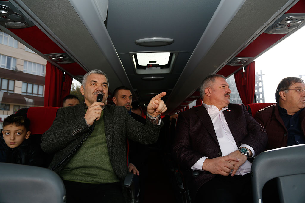 Kayseri Büyükşehir Belediye Başkanı Mustafa Çelik’in gerçekleştirdiği görsel brifinge bu kez OSB Yönetim Kurulu üyeleri ve birim müdürleri katıldı. Başkan Çelik, yapılan yatırımların bir bölümünü katılımcılarla gezerek bilgiler verdi ve önümüzdeki dönemde yapılması planlanan projelerle ilgili açıklamalarda bulundu. OSB Yönetim Kurulu Başkanı Tahir Nursaçan, yapılan yatırımlarla Kayseri’nin Avrupa’nın bile örnek alacağı bir şehir haline geldiğini ifade ederek Başkan Çelik’e teşekkür etti. Büyükşehir Belediye Başkanı Mustafa Çelik, Asri Mezarlık önünde başlayacak olan görsel brifing öncesinde cenazeleri için mezarlığa gelenlere taziyede bulundu. Kayseri Organize Sanayi Bölgesi Başkanı Tahir Nursaçan, yönetim kurulu üyeleri ve birim müdürlerinin katıldığı görsel brifingin ilk durağı Asri Mezarlık içindeki Orgeneral Hulusi Akar Camii oldu. Cami hakkında katılımcıları bilgilendiren Başkan Çelik, mezarlıkta yaptıkları hizmetleri de anlatarak dinimize yakışır bir şekilde temiz ve düzenli bir mezarlık yaptıklarını söyledi. Başkan Çelik, “Hedefimiz önümüzdeki yıl İldem, Argıncık ve Erkilet mezarlıklarını da bu hale getirmek” dedi. Görsel brifing öncesi cenazesi olan bir aileyi ziyaret ettiğini de hatırlatan Başkan Çelik, “İstanbul’dan gelen aile İstanbul’da bile böyle hizmet olmadığını söyledi” diye konuştu. “YOLLARDA GEÇEN ZAMANI AZALTTIK” Görsel brifing sırasında Büyükşehir Belediye Başkanlığındaki 3,5 senenin bilançosunu çıkardıklarında hep iyi neticeler çıktığını ifade eden Başkan Çelik, bu 3,5 senede ülkemizde ve ülkemiz dışında yatırımları engelleyecek bir çok olumsuzluk yaşanmasına rağmen gece gündüz çalıştıklarını ve her zaman daha iyi neler yapabilirizin kaygısında olduklarını belirtti. Özellikle ulaşım alanında yaptıkları yatırımlarla herkesin artık çok daha kısa sürede evinden işine gitmeye başladığını ifade eden Çelik, “Herkesin cebine en az yarım saat koyduk. Şehrimizi başka şehirlerle mukayese edilmeyecek şekilde düzgün, rahat ve yeşil bir şehir haline getirdik” dedi. 3,5 YILDA 14 KATLI KAVŞAK Katlı kavşak ve yolları yaparken yan yollar vasıtasıyla ulaşımı kesmeden yatırımları yaptıklarını ifade eden Başkan Mustafa Çelik, 50 yerde noktasal bazda çözümler getirerek trafiği daha akıcı hale getirdiklerini kaydetti. Kayseri’deki 4 katlı kavşağa 3,5 yılda 14 katlı kavşak daha eklediklerini ifade eden Başkan Mustafa Çelik, “Kayseri’de trafik ışıkları çok şeklinde eleştiriler vardı. Yaptığımız çalışmalarla 56 ışığı kaldırdık” diye konuştu. Kısa ve orta vadeli bu çözümlerin yanı sıra uzun vadeli çözümler için büyük bulvarlar yaptıklarını da dile getiren Çelik, katılımcılara bunlardan biri olan Bekir Yıldız Bulvarını gösterdi ve çok hızlı bir şekilde şehre önemli bir bulvar kazandırdıklarını söyledi. Görsel brifing sırasında Sanayi Odası Katlı Kavşağı üzerinden geçerken yolları gösteren Başkan Çelik, dünyada pek çok yerde bulunmayan bir güzelliğin ortaya çıktığını belirtti. Başkan Mustafa Çelik, Sahabiye Kentsel Dönüşüm Projesi’nin son durumunu da göstererek bilgiler verdi ve normal süresinden çok daha hızlı ilerlediklerini kaydetti. Çelik, Sahabiye için hala temel atma töreni dahi yapmadıklarını da hatırlattı. Görsel brifing kapsamında daha sonra Kocasinan Bulvarı’na çıkıldı ve katlı kavşaklardan geçildi. Başkan Çelik, Sivas Caddesi’nden Talas’a dönüşte yapılan kavşak düzenlemesini de gösterdi. Görsel brifing sırasında bir açıklama yapan OSB Yönetim Kurulu Başkanı Tahir Nursaçan, Başkan Çelik’in üç yıl içinde OSB trafiğini kolaylaştırmak için her şeyi yaptığını ifade ederek “Allah razı olsun” ifadelerini kullandı. Görsel brifing Orgeneral Hulusi Akar Bulvarı ile devam etti. Bulvarın eski Tavlusun Caddesi bölümünde 124 gecekonduyu rızaen anlaşarak ev sahipleri ile birlikte yıktıklarını ifade eden Başkan Çelik, Farabi Caddesi’ni Hulusi Akar Bulvarı’na bağlamak için de 30’dan fazla gecekonduyu yıktıklarını söyledi. Farabi Caddesi’ni 400 metresi Askeriye içinden tünelden geçilerek Talas Yoluna bağlayacaklarını vurgulayan Başkan Çelik, yakında konuyla ilgili protokol yapacaklarını kaydetti. Başkan Çelik, Kartal Kavşağı’ndan geçişte Talas Caddesi’nin Mustafa Kemal Paşa Bulvarı’na bağlantısını beş şeride çıkararak buradaki sorunu çözdüklerini de belirtti. “İŞSİZ GENÇLERİMİZİN KAYGISINI YAŞIYORUZ” Görsel brifing Büyükşehir Belediyesi Meslek Akademisi ve KAYMEK Mesleki Sınav Merkezi ile devam etti. Başkan Çelik, Meslek Akademisini konuklarıyla birlikte gezdi. OSB Yönetim Kurulu Başkanı Nursaçan bu yapılan işin takdire şayan olduğunu belirtti. Başkan Mustafa Çelik de “Sanayici eleman ararken birçok gencimizin işsiz gezmesinin kaygısını yaşıyoruz. Bu yüzden bu tesisi yaptık” diye konuştu. Görsel brifing kapsamında daha sonra Talas Sosyal Yaşam Merkezi gezildi. Sosyal Yaşam Merkezi’ndeki birimleri sanayicilerle birlikte gezen Başkan Çelik, Genç KAYMEK kurslarını da ziyaret etti ve Genç KAYMEK öğrencileriyle fotoğraf çektirdi. Görsel brifing sırasında söz alan OSB Teknik Koleji Müdürü Durmuş Payas “Yapılanları görünce Kayserili olarak gurur duyuyorum, onur duyuyorum. Başkanımız sağ olsun her konuda kolejimize destek verdi. Şu anda Türkiye’nin en saygın okullarından birisiyiz ve şu anda benzerimiz yok. Türkiye’de hiçbir okulda olmayan şekilde Başkanımız kütüphane yaptı” dedi ve kütüphaneye kitap ve okul bahçesine spor alanları talebinde bulundu. Başkan Mustafa Çelik de gençliğe destek olacak bu tür çalı