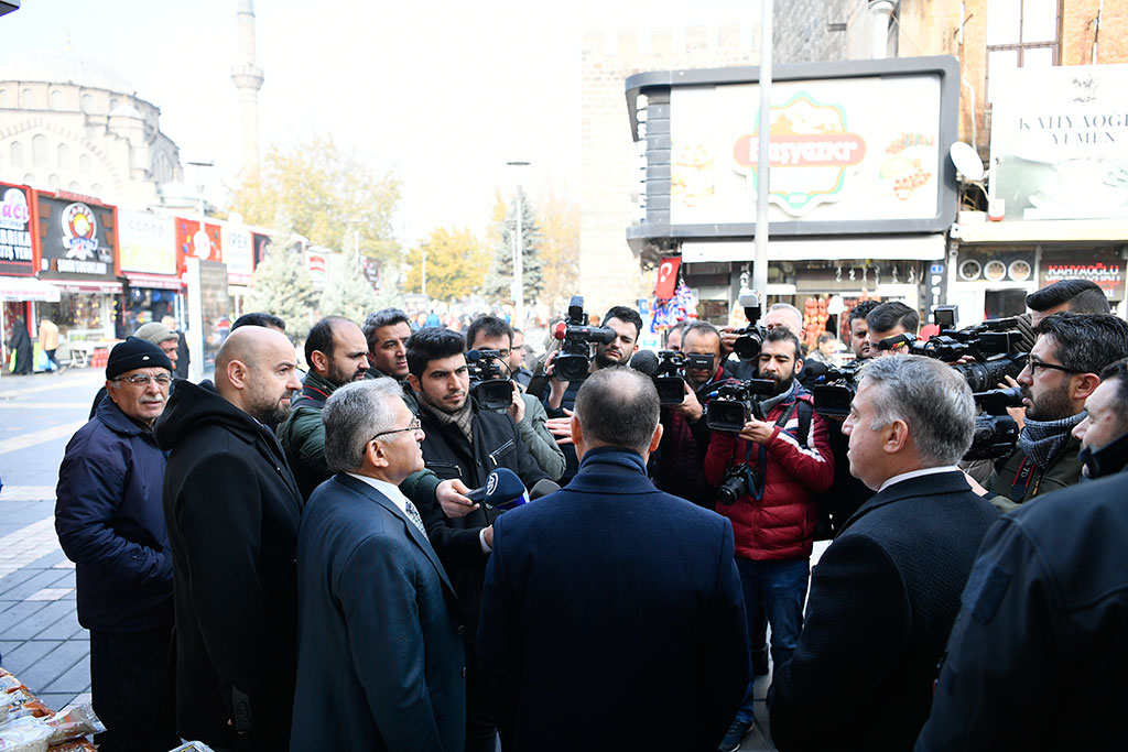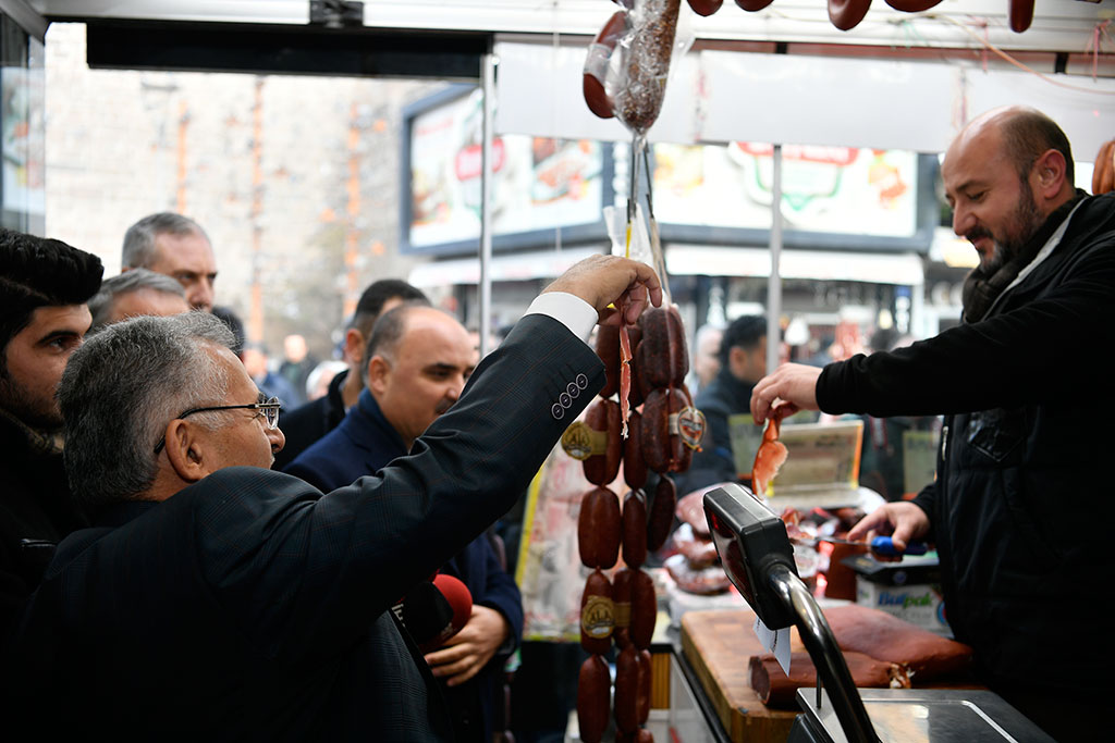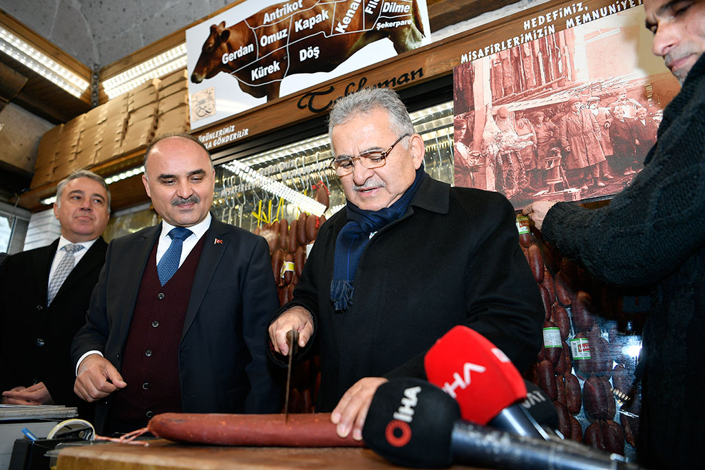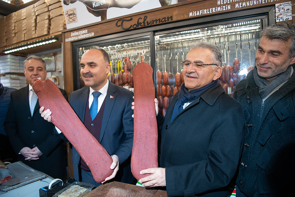 Kayseri Büyükşehir Belediye Başkanı Dr. Memduh Büyükkılıç, Vali Şehmus Günaydın ve Kayseri İl Tarım ve Orman Müdürü Mustafa Şahin ile birlikte esnaf ziyaretinde bulundu. Cumhuriyet Mahallesi’ndeki pastırmacı esnafını ziyaret eden Başkan Büyükkılıç, pastırma denince akla Kayseri’nin geldiğini belirtti ve söz konusu pastırma olunca Kayseri’nin hiçbir il ile karşılaştırılamayacağını söyledi. Vali Şehmus Günaydın ve Büyükşehir Belediye Başkanı Dr. Memduh Büyükkılıç, Kayseri’nin en önemli değerlerinden olan pastırma ve sucukla ilgili mesajlar verdiler. Cumhuriyet Mahallesi’ndeki sucuk ve pastırmacı esnafını ziyaret eden Vali Günaydın ve Başkan Büyükkılıç, hayırlı olsun temennilerinde bulundular ve kendilerini takip eden basın mensupları ve vatandaşlara pastırma ikram ettiler. “PASTIRMA KAYSERİ’DE YENİR, KAYSERİ’DEN ALINIR” Esnaf ziyaretleri sırasında basın mensuplarının pastırmayla ilgili sorularını da cevaplayan Büyükşehir Belediye Başkanı Dr. Memduh Büyükkılıç, pastırma denilince akla gelen tek şehrin Kayseri olduğunu söyledi. Pastırmanın Kayseri ürünü olduğunu dile getiren Başkan Büyükkılıç, “Pastırma Kayseri’de yenilir ve Kayseri’den alınır. Pastırmanın bir tarzı ve bir lezzeti vardır. Her dilimlenmiş et pastırma olmaz” dedi. Ziyaretleri sırasında sucuk ve pastırmanın tanıtımı üzerinde de duran Başkan Büyükkılıç, “Sadece üretmek yetmez, tanıtmak da lazım. Tanıtım için de fedakarlık gerekir. Tanıtımı sadece Valiliğimizden ya da Büyükşehir Belediyemizden beklememeliyiz” diye konuştu. “KAYSERİ PASTIRMADA FARKLI YERDE” Sucuk ve pastırmacı esnafını ziyaret sırasında basın mensuplarının farklı illerdeki pastırmalarla ilgili soruları üzerine Kayseri pastırmasının mukayese edilemeyeceğini vurgulayan Başkan Büyükkılıç, “Biz böyle bir mukayeseye giremeyiz. Herkesin bir ligi bir kategorisi var. Pastırma denince akla Kayseri gelir. Bir sınıflandırma yapılacaksa Kayseri ve diğerleri şeklinde sınıflandırılabilir” dedi. Vali Günaydın ve Başkan Büyükkılıç, ziyaretleri sırasında alış veriş yapan vatandaşlarla da sohbet ettiler. Vatandaşların Kars’tan Kocaeli’ne kadar doğudan batıya kuzeyden güneye Türkiye’nin farklı illerine Kayseri sucuğu ve pastırması gönderdikleri görüldü. Ziyaretlerin ardından bir açıklama yapan Başkan Memduh Büyükkılıç, Kayseri’nin pastırmasıyla yüzyıllardır anılan bir şehir olduğunu söyledi. Başkan Büyükkılıç, şehrin değerlerini koruyup kollayacaklarını kaydetti. Vali Şehmus Günaydın da açıklamasında, “Zaman zaman Başkanımızla esnafımızı ziyaret ediyoruz. Pastırma Kayseri için Kayseri’nin tanıtımı için çok önemli. Kayseri’mizin bütün değerlerini Türkiye’de ve dünyanın her yerinde tanıtmak istiyoruz” diye konuştu.