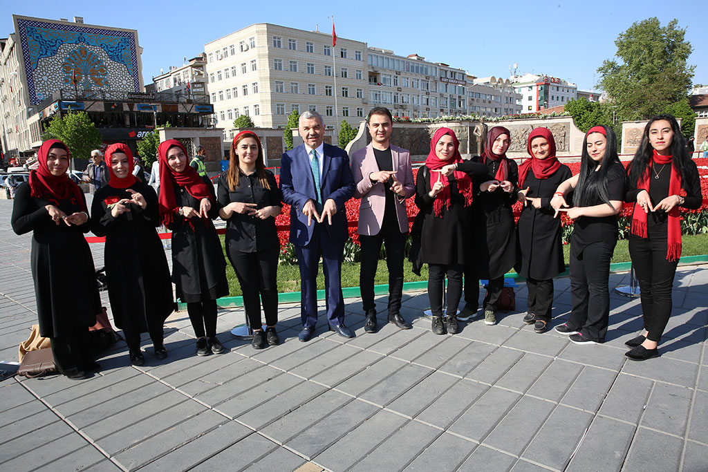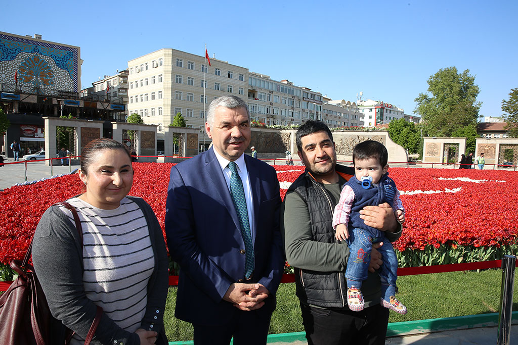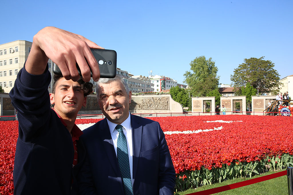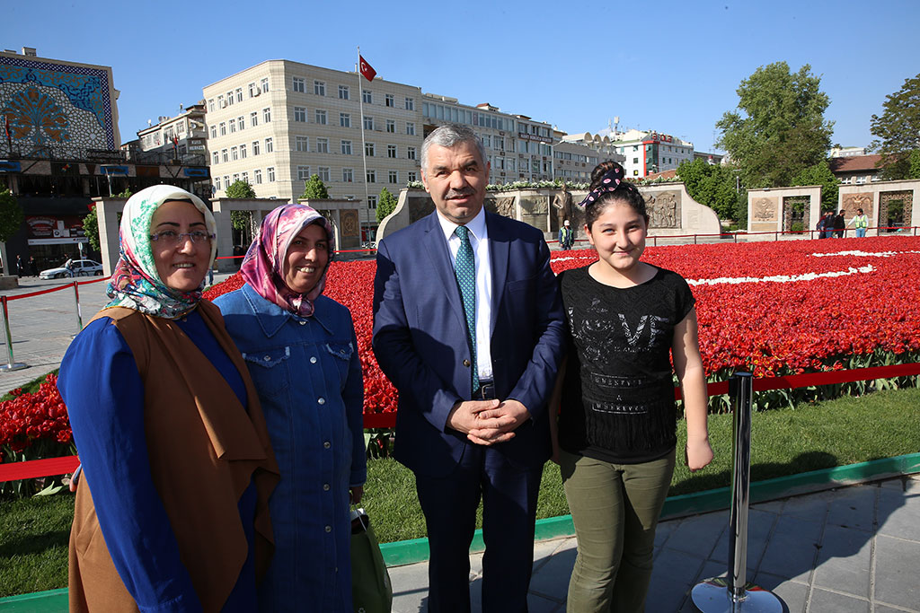 Büyükşehir Belediyesi’nin Cumhuriyet Meydanı’nda yaptığı lale peyzajlı dünyanın en büyük bayrağı her kesimden büyük ilgi görmeye devam ediyor. 24 Nisan’da kaldırılması düşünülen lale peyzajlı Türk Bayrağı, ilginin artarak devam ettiğini gören Büyükşehir Belediye Başkanı Mustafa Çelik’in talimatıyla bir süre daha kalacak. Bu arada lalelerden oluşan eşsiz güzellik Kocasinan Halk Eğitim Merkezi İşitme Engelliler Kursu’na ilham verdi ve kursiyerler tarafından Türk Bayrağı’nın önünde işaret diliyle İstiklal Marşı okundu. Büyükşehir Belediye Başkanı Mustafa Çelik akşam saatlerinde Cumhuriyet Meydanı’na giderek lale peyzajıyla yapılan 400 metrekarenin üzerindeki büyüklüğüyle dünya rekorunu Kayseri’ye getiren Türk Bayrağı’na gösterilen ilgiyi yerinde gördü. Vatandaşlarla birlikte fotoğraf çektiren Başkan Çelik, Türk Bayrağına olan ilginin devam etmesi nedeniyle bayrağın bir süre daha Cumhuriyet Meydanı’nda sergilenmesi talimatını verdi. İŞARET DİLİYLE İSTİKLAL MARŞI Bu arada rekor bayrak anlamlı çalışmalara da ilham veriyor. Kocasinan Halk Eğitim Merkezi İşaret Dili Kursu tarafından Türk Bayrağı önünde işaret dili ile İstiklal Marşı okundu. Bu çalışma Cumhuriyet Meydanı’nda anlamlı bir tablo oluşturdu. Halk Eğitim Merkezi kursiyerleri Büyükşehir Belediye Başkanı Mustafa Çelik ile de fotoğraf çektirdi.