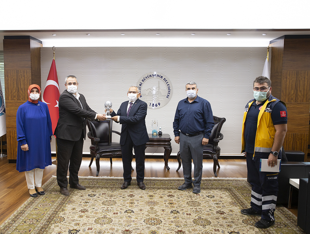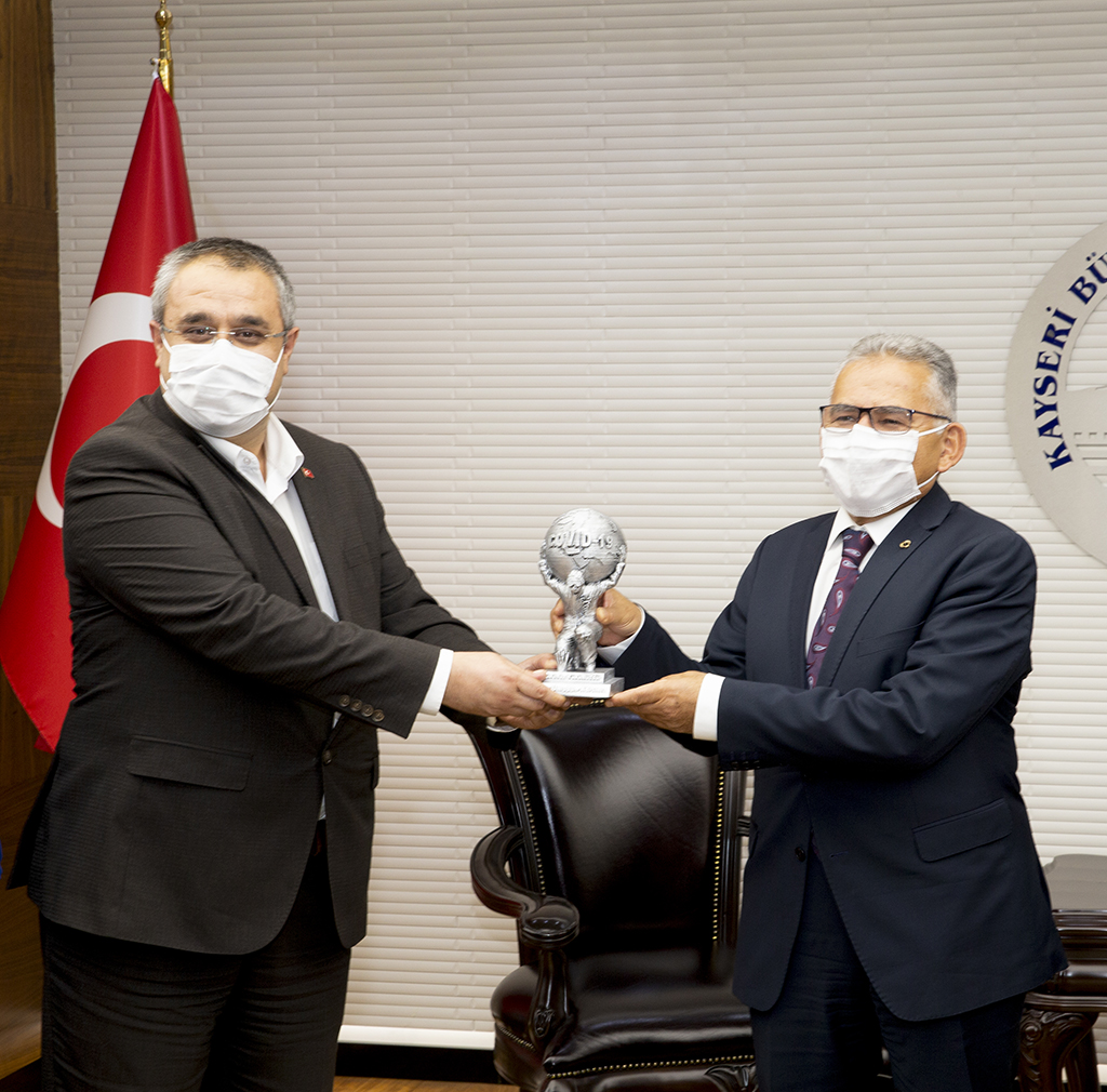 Kayseri Büyükşehir Belediye Başkanı Dr. Memduh Büyükkılıç, Sağlık-Sen Kayseri Şube Başkanı Hakan Keser ve yönetim kurulu üyelerinin ziyaretinde, koronavirüs salgını sürecinde sağlık çalışanlarına mazeret üretmeden her konuda destek verdiklerini ve onların yükünü hafifletmek için gayret gösterdiklerini belirtti. Sağlık-Sen Kayseri Şube Başkanı Hakan Keser ve yönetimi, sağlık sektörüne desteklerinden dolayı Başkan Büyükkılıç’a teşekkür ziyaretinde bulundu. Başkan Büyükkılıç, ziyaretten duyduğu memnuniyeti dile getirerek, sağlık sektörü ile birlikte hareket etmenin kendileri için sağlık sektörüne destek olmanın kendileri için bir onur kaynağı olduğunu belirtti. Pandemi sürecinde sağlıkçıların ne kadar gayretli ve fedakar çalıştığının tüm herkes tarafından görüldüğünü kaydeden Başkan Büyükkılıç, şunları söyledi: “İnşallah yapılan çalışmalarla aşıyı bulacağız ve bu hastalığı omuzumuzdan atacağız. Bu süreçte lojistik destek vermekte bizim olmazsa olmazımız. Biz işin reklam boyutuna değil beklentilere cevap vermeye gayret gösteriyoruz. Ulaşım, araç gereç, eleman, barınma, dezenfektan, kolonya ve su gibi ihtiyaçları karşıladık. Kayseri’mizi bu süreçten en sağlıklı şekilde ‘nasıl çıkarırız’ konusunun gayreti ve anlayışı içerisinde olduk. İyi bir noktaya geldik. Ama yetmez. Bizim bu konuda daha dikkatli, daha fedakâr ve daha gayretli olmamız lazım. Tedbiri elden bırakmamamız lazım. Halen daha dünyada, ülkemizde ve tabi ki şehrimizde bu süreç devam ediyor. Hassasiyet göstermemiz lazım. Gerekli çalışmaları yapmamız lazım. Ben sizlere fedakârca çalışmalarla bu yükü omuzladığınız için her kademedeki kardeşlerimizi ayırmaksızın teşekkür ediyorum. Sağlık-Sen Kayseri Şube Başkanı Hakan Keser de Pandemi sürecinde sağlık çalışanlarına vermiş olduğu yardım, destek ve katkılardan dolayı aynı zamanda bir doktor olan Başkan Büyükkılıç’a teşekkür etti. Ziyaretin sonunda Kevser tarafından Başkan Büyükkılıç’a hediye takdiminde bulunuldu.
