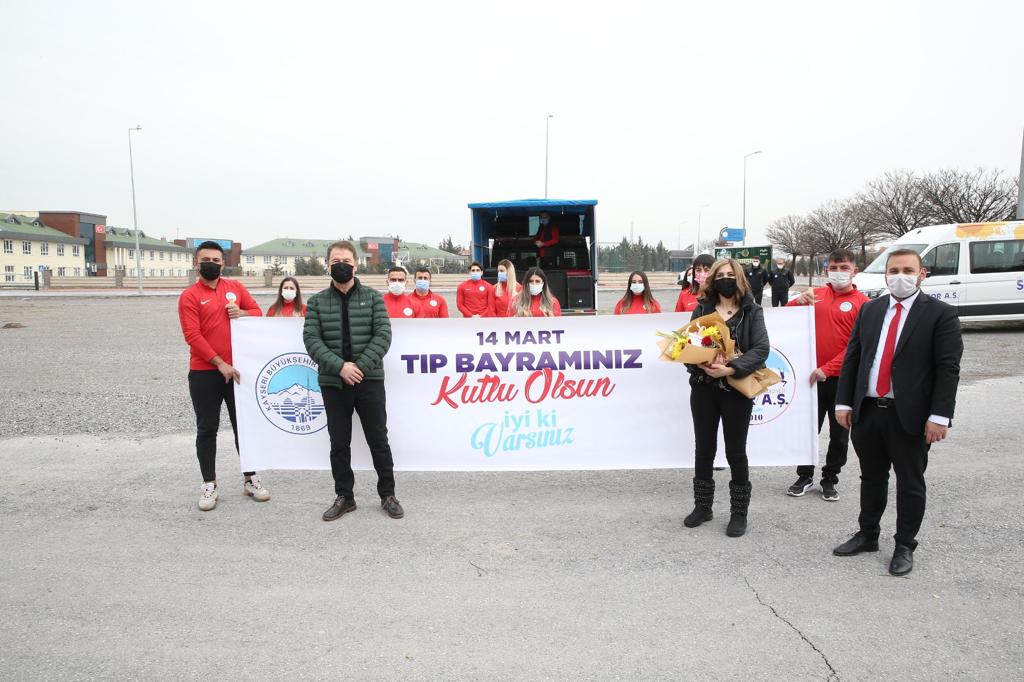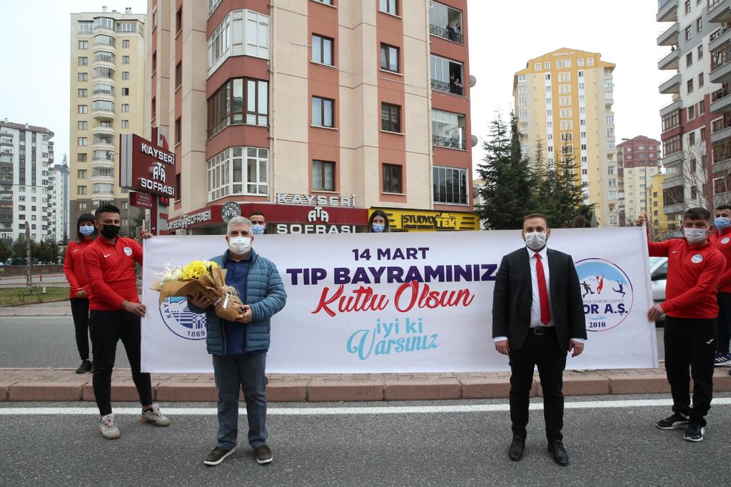 Kayseri Büyükşehir Belediyesi, pandemi sürecinin kahramanlarının 14 Mart Tıp Bayramı’nı renkli ve sürpriz bir etkinlikle kutladı. Pandemi sürecinde özellikle kısıtlama günlerinde yaptığı etkinliklerle vatandaşlara moral veren ve Pandemi mücadelesinde farkındalık oluşturan Spor A.Ş, bu kez 14 Mart Tıp Bayramı’nda sağlık çalışanlarının yanında oldu.Spor A.Ş Genel Müdürü İbrahim Somtaş ve çalışanları ilk olarak aynı zamanda Nöroloji Doktoru olan Büyükşehir Belediye Başkanı Dr. Memduh Büyükkılıç’ı doktor eşi Necmiye Büyükkılıç ve doktor oğlu Mehmed Enes Büyükkılıç ile birlikte yaşadığı eve sürpriz bir ziyarette bulundu.