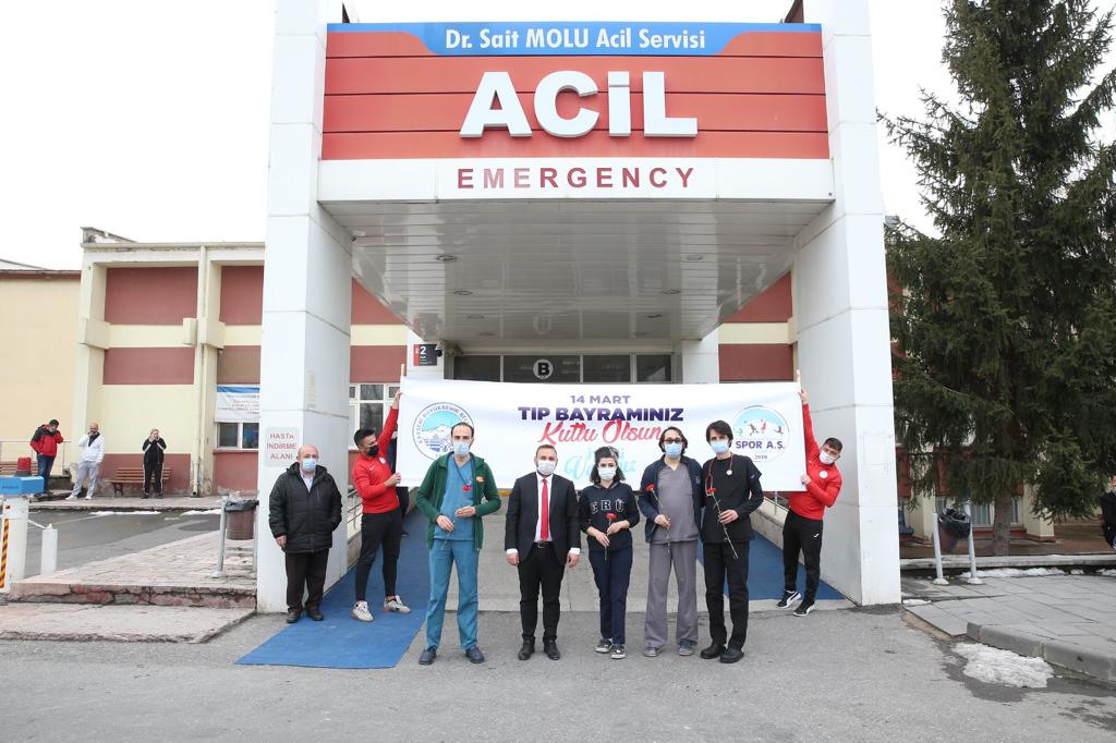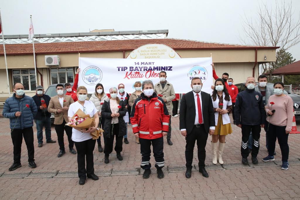 Spor A.Ş ekipleri İl Sağlık Müdürü Doç. Dr. Ali Ramazan Benli, Erciyes Üniversitesi Tıp Fakültesi Hastaneleri Başhekimi Prof. Dr. H.Kutay Taşdemir, Şehir Hastanesi Başhekimi Prof. Dr. İlhami Çelik ve Devlet Hastanesi Başhekimi Uzman Doktor İsmail Altıntop’a da ikametlerinde sürpriz ziyaretlerde bulunarak, çiçek takdim edip 14 Mart Tıp Bayramlarını kutladı.