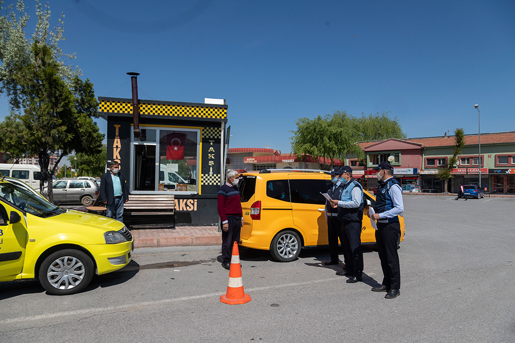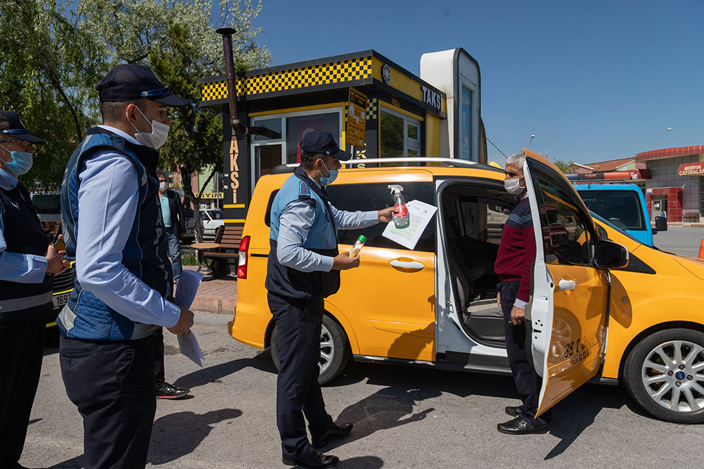 Kayseri Büyükşehir Belediyesi zabıta ekiplerinin koronavirüs tedbirlerine uyulması yönündeki denetim ve bilgilendirmeleri hız kesmeden devam ediyor. Zabıta ekipleri tarafından bu kez ticari taksiciler bilgilendirildi. Büyükşehir Belediyesi zabıta ekipleri taksi duraklarını gezerek ticari taksilerle ilgili uyulması gereken önlemleri denetledi. Aynı zamanda taksicilerle yolcuları bilgilendiren zabıta ekipleri, koronavirüs salgınının önlenmesi için alınan tedbirlere azami derecede uyulması gerektiğini belirttiler. Denetimlerde, taksilerin en az haftada bir dezenfekte edileceği ve bu durumun belgelendirileceği belirtildi. Tedbirler çerçevesinde taksi şoförleri ve müşterilerin maske takacağı, en fazla üç müşterinin taşınabileceği, taksilerde dezenfektan veya 80 derecelik kolonya bulundurulacağı vurgulanarak bu konulara karşı dikkatli olunması istendi.