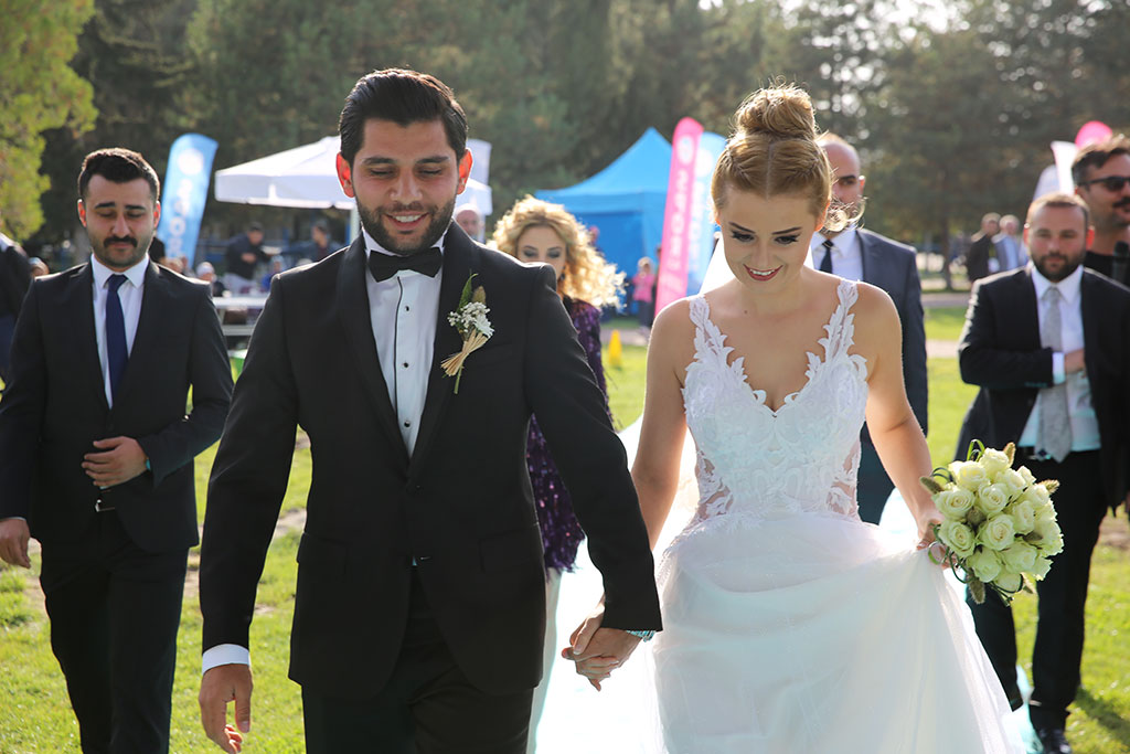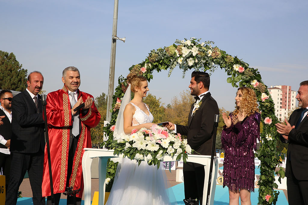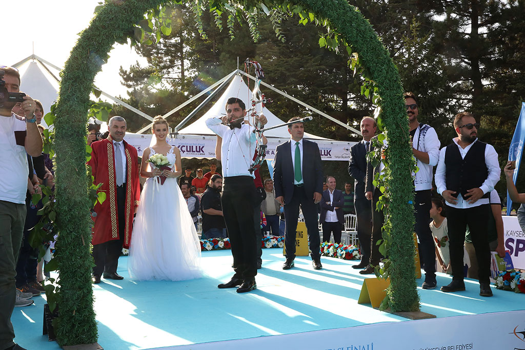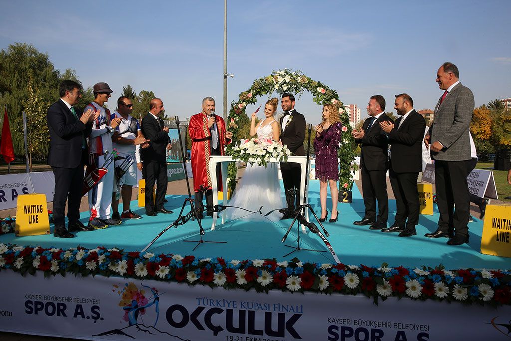 Uluslararası müsabakalarda şehrimizi ve ülkemizi başarıyla temsil eden Milli Okçumuz Demir Elmaağaçlı, şampiyona yakışır bir nikah gerçekleştirdi. Demir Elmaağaçlı ve Burcu Buket Şenez’in Türkiye Okçuluk Kupası Finallerinin yapıldığı sahadaki nikahını Büyükşehir Belediye Başkanı Mustafa Çelik kıydı. Büyükşehir Belediyesi Spor A.Ş. sporcusu Milli gururumuz Demir Elmağaçlı, örneği görülmemiş bir nikahla bir kez daha 12’den vurdu. Türkiye Okçuluk Kupası finallerinin yapıldığı Fuar alanında Demir Elmaağaçlı ve Burcu Buket Şenez’in nikahı kıyıldı. Nikah töreni Türkiye Okçuluk Kupası’nda final atışlarının yapılmasının hemen ardından gerçekleştirildi. Genç çiftin nikahını Büyükşehir Belediye Başkanı Mustafa Çelik kıydı. “Demir bizim evladımız. Normalde oğlan eviyim; ama gelin hanım kızımız yalnız kalmasın diye kız evindenim” diyerek nikah merasimine başlayan Büyükşehir Belediye Başkanı Çelik, genç çifte ve onların şahsında tüm gençlere bazı tavsiyelerde bulundu. Mutluluğun yollarını anlatan Başkan Çelik, “Anne babalarınızın hayır duasını almak için ne kadar gayret ederseniz yarın evlatlarınız da öyle davranacak. Bir anlamda siz kendi hayatınızın senaryosunu yazacaksınız. Anne babalar evlatlarının kötülüğünü istemez. Dualarıyla evlerimizin bereket ve huzur kaynağı. Ayrıca evlilik iki kişilik bir bisiklet yolculuğu gibi. Önünüze çıkan engelleri birlikte aşacaksınız” dedi. Burcu-Demir çiftinin nikah şahitleri arasında Okçuluk Federasyonu Başkan Yardımcısı Rüstem Varol ile Milli Okçular da vardı. Başkan Mustafa Çelik, şahitlerin de onayı ile nikahı “Rabbim bir yastıkta bahtiyar bir yastıkta ihtiyar eylesin” temennileriyle kıydı. Milli okçumuz Demir Elmaağaçlı, nikahtan sonra, damat kıyafetiyle nikahın kıyıldığı platformdan hedefe atış yaptı ve hayatının en anlamlı atışını gerçekleştirmiş oldu.