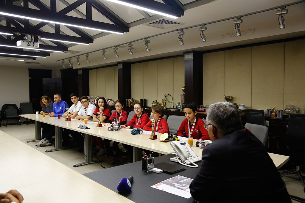Antalya’da yapılan, dünyanın en büyük robotik festivali Robotex İnternational 2019’da şampiyon olan Erciyes Koleji, kupa ve madalyalarıyla birlikte Büyükşehir Belediye Başkanı Dr. Memduh Büyükkılıç’ı ziyaret etti. Başkan Büyükkılıç, Estonya’da Türkiye’yi temsil etme hakkı kazanan öğrencileri bu önemli başarı nedeniyle tebrik ederek başarılarının devamını diledi. Erciyes Koleji’nin Büyükşehir Belediye Başkanı Dr. Memduh Büyükkılıç’ı ziyaretine Yönetim Kurulu Başkanı Mustafa Hastekkeşin, yönetim kurulu üyeleri, okul idarecileri ve robotik takımı katıldı. Erciyes Koleji Yönetim Kurulu Başkanı Hastekkeşin, Antalya’da 200 okul ve 800 öğrencinin katılımıyla yapılan Robotex İnternational 2019’da kızlar itfaiyecilik kategorisinde Türkiye birinciliği, zihin kontrolü kategorisinde Türkiye ikinciliği ve dron kategorisinde Türkiye üçüncülüğü kazanarak en başarılı okul olduklarını ve ülkemizi Estonya’da temsil etmeye hak kazandıklarını söyledi. Hastekkeşin, ayrıca okul basketbol takımında da yer alan öğrencileri Samet Yiğitoğlu’nun U16 milli takımımızın 14 kişilik aday kadrosuna seçildiğini de belirterek, genç basketbolcuyu Başkan Büyükkılıç ile tanıştırdı. Büyükşehir Belediye Başkanı Memduh Büyükkılıç da bu önemli başarı nedeniyle okulu ve öğrencileri tebrik etti. Öğrencilerden kendilerine sağlanan imkanları iyi değerlendirmelerini isteyen Başkan Büyükkılıç, “Hem sosyal, hem kültürel hem de bilgiyi en güzel şekilde değerlendirerek gurur kaynağımız olmuşsunuz. Sizleri tebrik ediyorum” diye konuştu. Başkan Büyükkılıç, Erciyes Koleji’ne Antalya’da birincilik kazandıran robot itfaiye ile ilgili de ayrıca bilgi aldı.