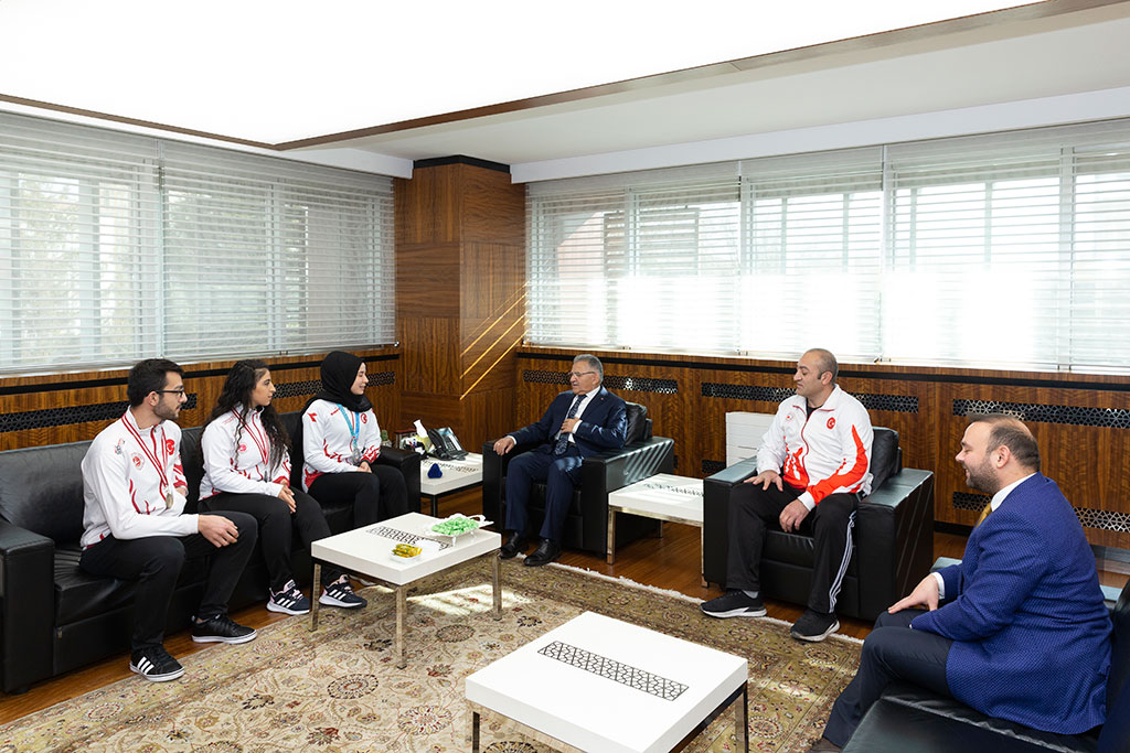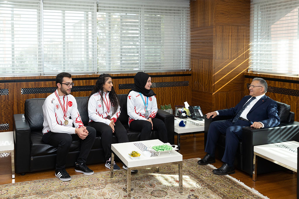 Büyükşehir Belediyesi bünyesinde 7’den 70’e herkese spor yapma imkanı tanımakla kalmayıp çok önemli sporcular da yetiştiren Spor A.Ş.’nin şampiyonları Büyükşehir Belediye Başkanı Dr. Memduh Büyükkılıç’ı ziyaret etti. Büyükşehir Belediye Başkanı Dr. Memduh Büyükkılıç’ı, Spor A.Ş. Genel Müdürü İbrahim Somtaş ile birlikte ziyaret eden sporcular arasında Kickboks Dünya Şampiyonası’nda dünya ikincisi olma başarısını gösteren Hayriye Türksoy, Wushu Balkan Şampiyonası’nda birinci olan Sülayman Kaya ve Wushu Balkan Şampiyonası ikincisi Zehra Yılmaz yer aldı. Başkan Büyükkılıç, Spor A.Ş.’nin başarılı sporcularını tebrik ederek başarılarının devamı diledi. Spor A.Ş. sporcuları da katıldıkları şampiyonalarla ilgili bilgi vererek, katılacakları şampiyonalarda Kayseri’ye yeni başarılarla döneceklerini dile getirdiler.