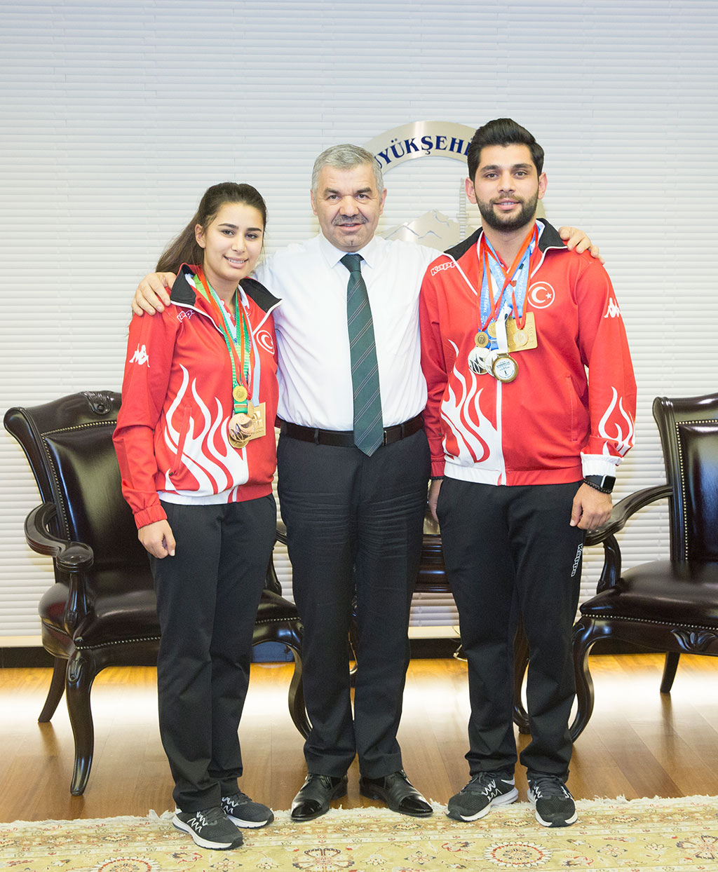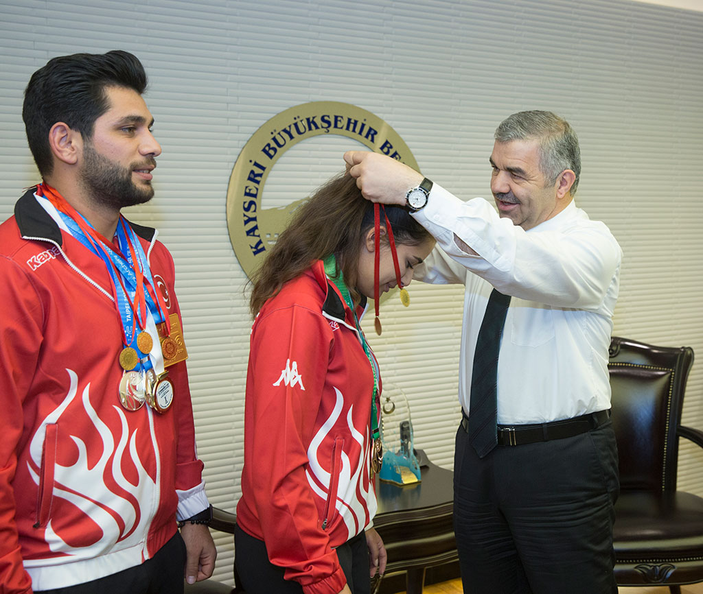 Kayseri’nin gururu olan şampiyon kardeşler Büyükşehir Belediye Başkanı Mustafa Çelik’i ziyaret ettiler. Gizem ve Demir Elmaağaçlı’yı Kayseri’ye yaşattıkları şampiyonlular için tebrik eden Başkan Çelik, başarılı sporcuları altınla ödüllendirdi. Okçulukta girdikleri tüm müsabakalarda şehrimizi ve ülkemizi başarıyla temsil eden Gizem ve Demir Elmaağaçlı kardeşler Büyükşehir Belediye Başkanı Mustafa Çelik’e daha önce verdikleri sözü tutarak yeni madalyalarla geldiler. Şampiyon kardeşler, üç üniversite olimpiyat madalyası, iki dünya derecesi ve bir Fetih Kupası derecesiyle Başkan Çelik’i ziyaret ettiklerini belirterek, başarıların devamının geleceğini ifade ettiler. Büyükşehir Belediye Başkanı Mustafa Çelik de Kayseri’nin adını ulusal ve uluslararası alanda duyuran başarılı sporcuları şehir adına tebrik etti. Sporun ve sporcunun her zaman yanında olmaya gayret ettiklerini vurgulayan Başkan Çelik, “Meclis üyelerimizin oy birliğiyle aldığımız kararla ilimize uluslararası derece getiren tüm sporcularımızı ödüllendirelim istedik. Birinciye 30 altın, ikinciye 20 altın, üçüncüye 10 altın veriyoruz. İlimize katıldığınız bu madalyalardan dolayı size teşekkür ediyoruz” dedi. Başkan Çelik, şampiyon kardeşleri kazandıkları madalyalar ölçüsünde altınla ödüllendirdi ve başarılarının devamı temennisinde bulundu.