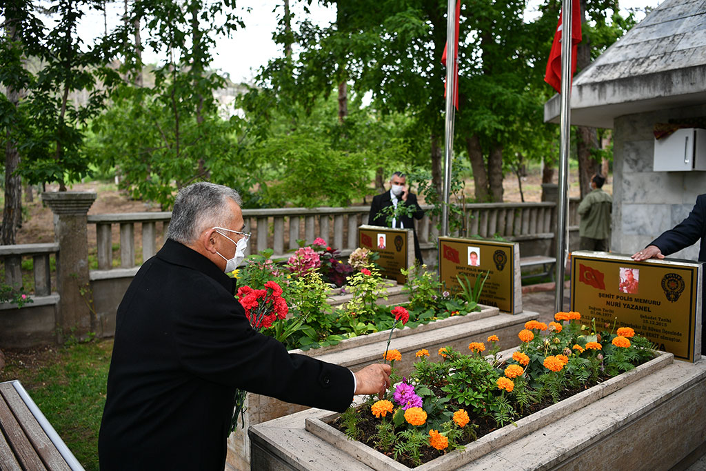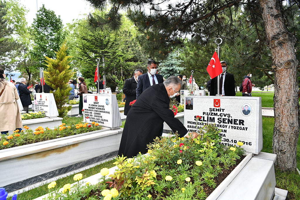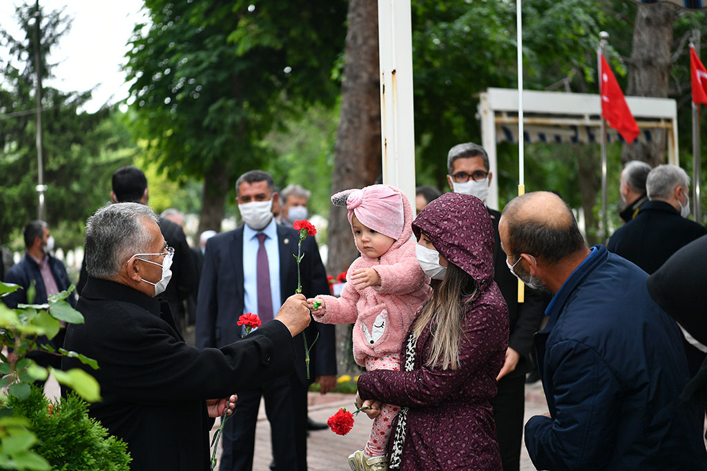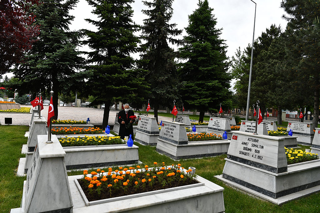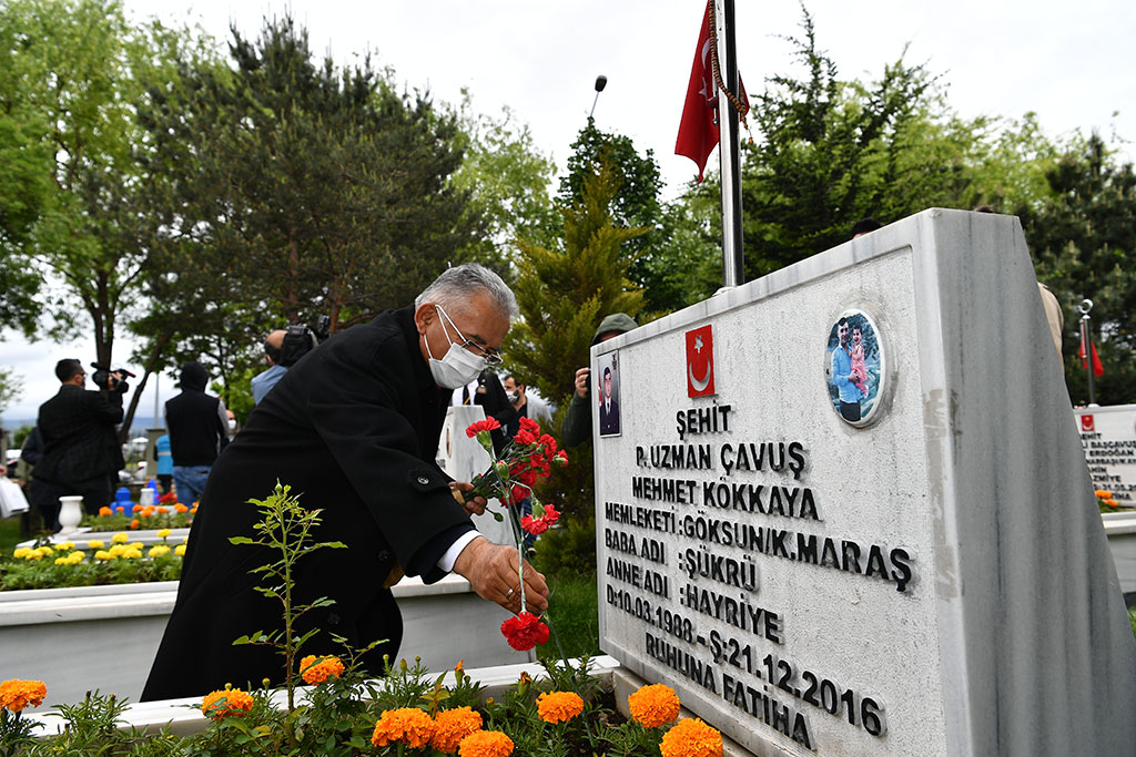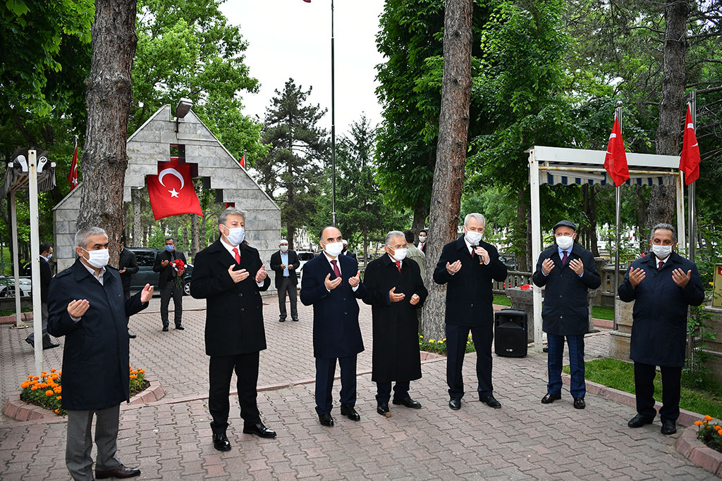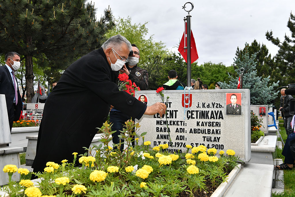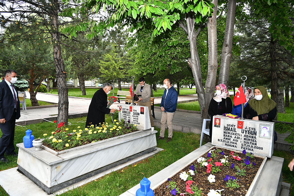 Kayseri Büyükşehir Belediye Başkanı Dr. Memduh Büyükkılıç Ramazan Bayramı dolayısıyla Kartal Şehitliği’nde düzenlenen bayramlaşma törenine katıldı. Büyükkılıç konuşmasında birlik ve beraberlik mesajlarını yineledi. Ramazan Bayramı’nın ilk bayramlaşma töreni Kayseri Kartal Şehitliği’nde ve Polis Şehitliği’nde gerçekleştirildi. Törene Kayseri Büyükşehir Belediye Başkanı Dr. Memduh Büyükkılıç’ın yanı sıra Kayseri Valisi Şehmus Günaydın, Melikgazi Belediye Başkanı Mustafa Palancıoğlu, Kocasinan Belediye Başkanı Ahmet Çolakbayrakdar, Talas Belediye Başkanı Mustafa Yalçın, İl Müftüsü Prof. Dr. Şahin Güven ve şehit aileleri katıldı. Okunan Kur’an-ı Kerim tilavetinin ardından İl Müftüsü Prof. Dr. Şahin Güven’in ettiği dua ile şehitlerimize rahmet okundu. Başkan Büyükkılıç, tören sonrası yaptığı konuşmada, “Öncelikle şehitlerimize Allah’tan rahmet diliyorum. Şehitlerimiz inşallah şefaatçi olur diyoruz. Şehit yakınlarımızın bayramını tebrik ediyoruz. Elbette ki Kayserili hemşehrilerimizin bayramlarını tebrik ediyoruz. İslam aleminin bayramını tebrik ediyoruz. Huzur içerisinde nice bayramlara diyoruz. Bu bayram biraz bayram ruhuna aykırı gibi görüntü oluşsa da buruk bir bayram ise de elbette şartlar böyleydi. Bu şartlara uygun olarak bizler de bayramımızı tebrik edip birbirimizle birliğimizi beraberliğimizi dayanışmamızı inşallah koruyan anlayış içerisinde sahip çıkmamızı paylaşıyor, daha nice huzurlu sağlıklı bayramlara ulaşmayı temenni ediyorum. Şehitlerimiz bizler için şefaatçi olsunlar.” İfadelerini kullandı. Vali Şehmus Günaydın da “Ülkemiz milletimiz bayrağımız ezanımız için canlarını seve seve feda eden bütün şehitlerimizi rahmetle minnetle yâd ediyorum. Vefat eden gazilerimizi rahmetle minnetle yâd ediyorum. Hayatta olan gazilerimize de şükranlarımızı sunuyor onlara da sağlıklı huzurlu nice seneler temenni ediyorum. Buruk bir bayram yaşıyoruz demeyelim ama bayramlarımızın manevi iklimi çok önemli. Kucaklaşamasak ta birbirimizi ziyaret edemesek te bayramımızı telefonla yaşıyoruz bu manevi iklimi yoğun bir şekilde hep beraber yaşıyoruz.” dedi.