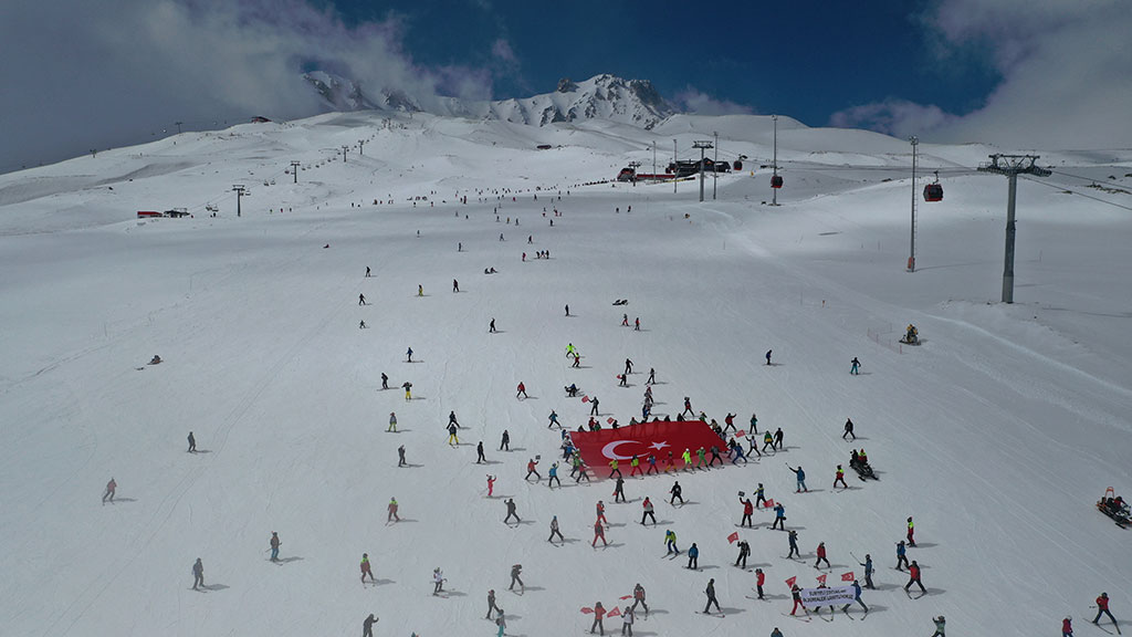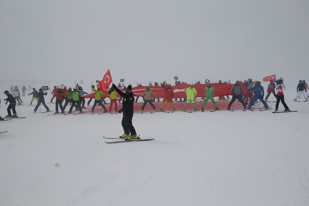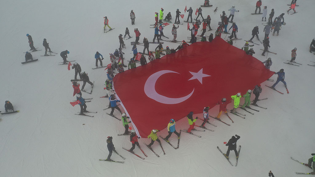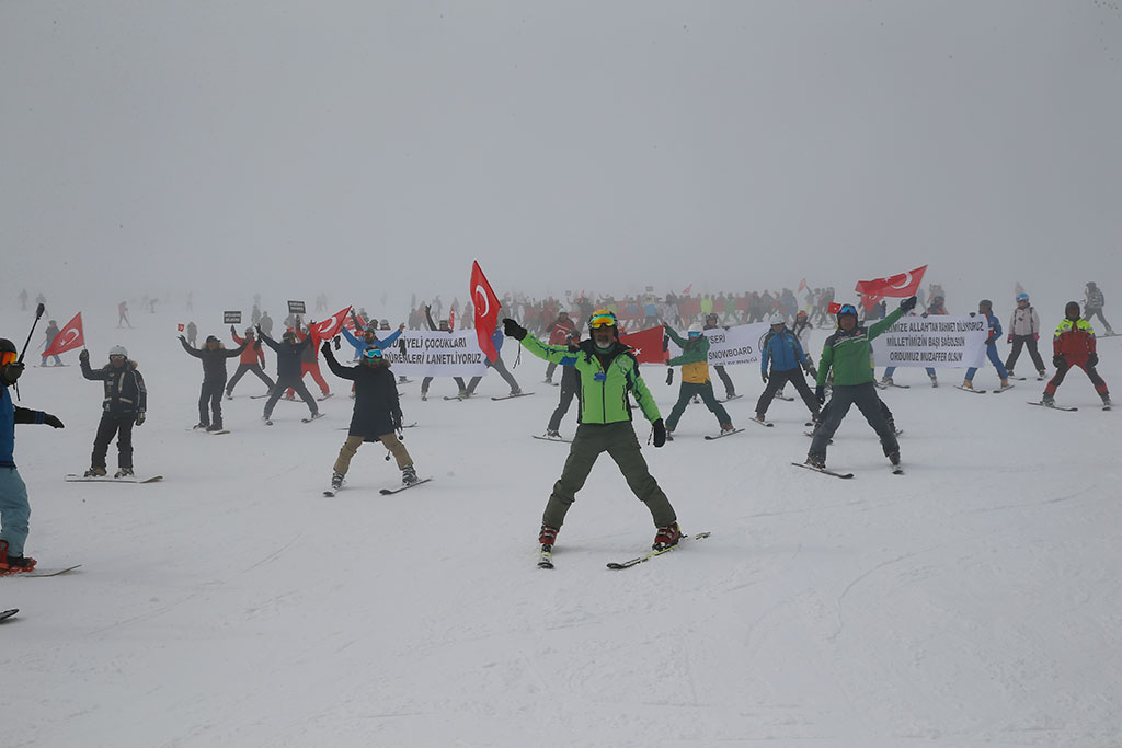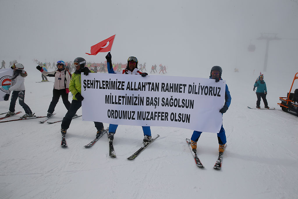 İdlib’de şehit olan askerlerimiz ve tüm şehitlerimizin anısına Erciyes’te bir araya gelen 250 kayakçı, Türk Bayrağı açarak, İstiklal Marşı ve dualar eşliğinde şehitlerimizi andı. Kayseri Büyükşehir Belediye Başkanı Dr. Memduh Büyükkılıç’ın da katıldığı anma programında Mehmetçiklerimiz için Erciyes, tek ses, tek yürek oldu. Erciyes Kayak Merkezi’nde düzenlenen, şehir içinden ve şehir dışından gelen yüzlerce vatandaşımızın da katıldığı anma programında Kayseri Kayak ve Snowboard Öğretmenleri Derneği üyeleri, Kayseri kayak kulüpleri, Erciyes A.Ş çalışanları ve kayakseverler ile birlikte yaklaşık 250 kayakçı 1600 metre uzunluğundaki pistte Türk Bayrağı açarak kaydılar. Tük Bayrağı’nı taşıyan kayakçılar pistin sonunda Büyükşehir Belediye Başkanı Memduh Büyükkılıç ve vatandaşlarla bir araya geldi. Ardından saygı duruşu yapıldı ve İstiklal Marşı okundu. Ülkemizin bekası için hayatlarını feda eden şehitlerimiz için düzenlenen anma programında konuşan Başkan Memduh Büyükkılıç, “Bu vatanın evlatları olarak nerede olursak olalım, aynı milli duygulara sahip olarak Ay Yıldızlı Türk Bayrağı’mıza, vatanımıza, milletimize ve devletimize sahip çıkma duygusu ile bezenmiş durumdayız. Allah bu güzellikleri elimizden ve gönlümüzden almasın. Malumunuz bu son süreçte şehitlerimiz var. Şehitlerimizden bir tanesi de Kayseri Develi’mizden. Dün şehidimize, adeta on binlerce vatan sevdalısı, bayrak sevdalısı, gerçek manada şehitlerin ölmediğine inanan ve şehitlerimizin şefaatından medet umarak orada toplanan vatandaşlarımız şehitler ölmez vatan bölünmez diyerek haykırmak suretiyle değerlerimize sahip çıkmıştır. Şehitlerimize Allah’tan rahmet dilerken, kıymetli ailelerine de sabırlar niyaz ediyoruz. Cenab-ı Allah onlara sabır versin, milletimizin başı sağolsun” dedi. Erciyes’te düzenlenen anma programının milletimizin birlikteliği adına önemli olduğunu belirten Büyükkılıç, “Erciyes’te hep beraber el ele, gönül gönüle, hocalarımızla, öğrencilerimizle, kayakçılarımızla, yurtiçi ve dışından gelerek teröre lanet okuyan binlerce vatandaşımız, İstiklal Marşı’mızı söyleyerek Türk Bayrağı’mıza sahip çıkıp şehitlerimizi rahmetle yâd ederek, birliğin ve beraberliğin sembolünü oluşturmuşlardır. Sizlere minnet duyuyorum. İyi ki Türk Milleti’nin evlatlarıyız. İyi ki böyle bir devletin ve milletin mensuplarıyız. Cenâb-ı Allah bu güzellikleri elimizden almasın.” şeklinde konuştu. Kayseri Büyükşehir Belediye Başkanı Dr. Memduh Büyükkılıç, düzenlenen anma programının sonunda alanda bulunanlardan tüm şehitlerimiz için dua istedi.