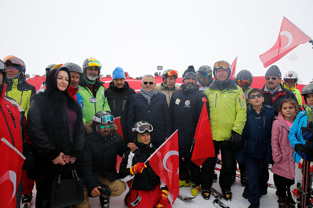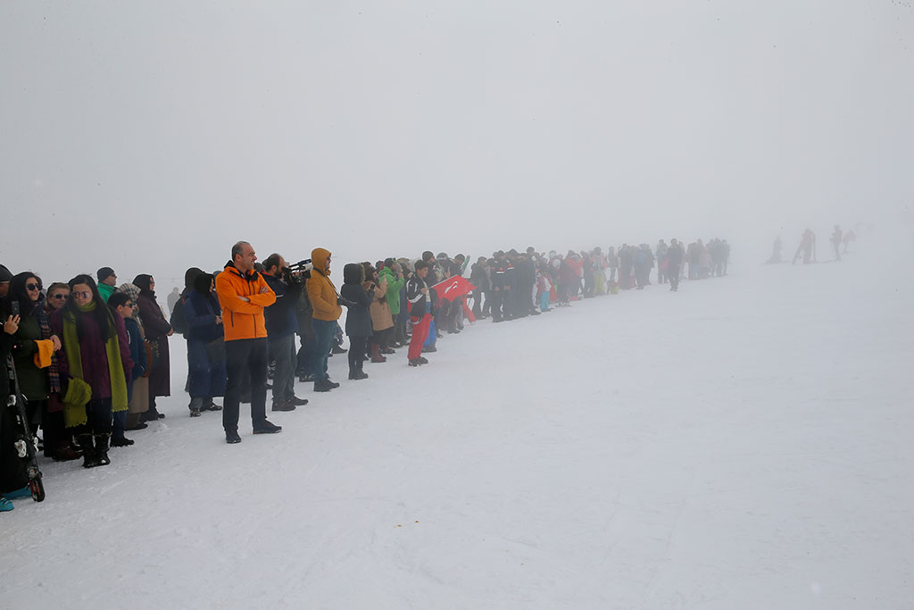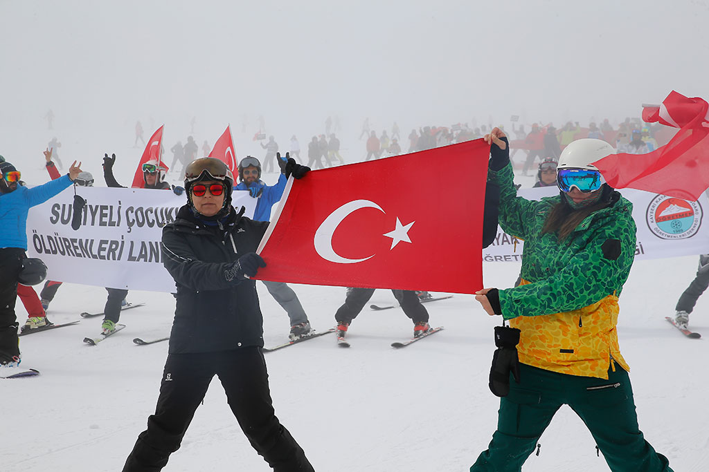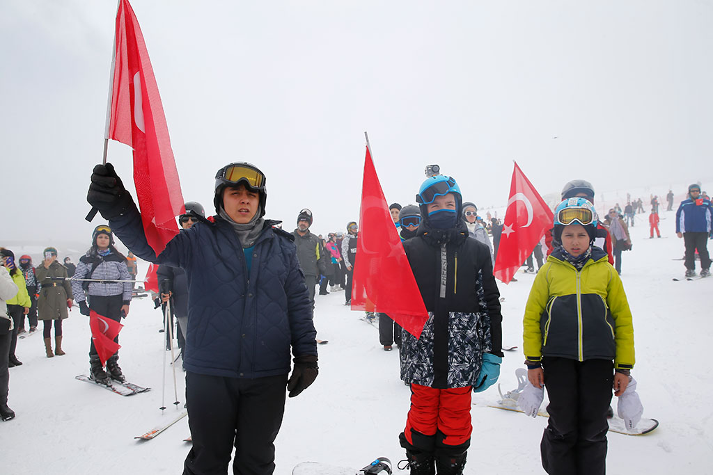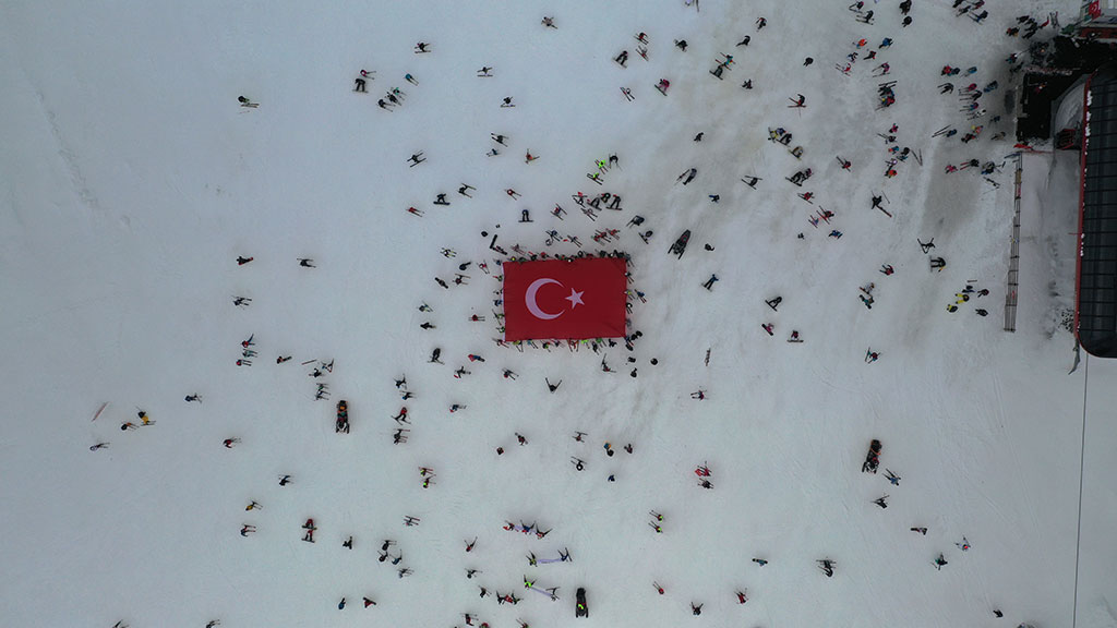 İdlib’de şehit olan askerlerimiz ve tüm şehitlerimizin anısına Erciyes’te bir araya gelen 250 kayakçı, Türk Bayrağı açarak, İstiklal Marşı ve dualar eşliğinde şehitlerimizi andı. Kayseri Büyükşehir Belediye Başkanı Dr. Memduh Büyükkılıç’ın da katıldığı anma programında Mehmetçiklerimiz için Erciyes, tek ses, tek yürek oldu. Erciyes Kayak Merkezi’nde düzenlenen, şehir içinden ve şehir dışından gelen yüzlerce vatandaşımızın da katıldığı anma programında Kayseri Kayak ve Snowboard Öğretmenleri Derneği üyeleri, Kayseri kayak kulüpleri, Erciyes A.Ş çalışanları ve kayakseverler ile birlikte yaklaşık 250 kayakçı 1600 metre uzunluğundaki pistte Türk Bayrağı açarak kaydılar. Tük Bayrağı’nı taşıyan kayakçılar pistin sonunda Büyükşehir Belediye Başkanı Memduh Büyükkılıç ve vatandaşlarla bir araya geldi. Ardından saygı duruşu yapıldı ve İstiklal Marşı okundu. Ülkemizin bekası için hayatlarını feda eden şehitlerimiz için düzenlenen anma programında konuşan Başkan Memduh Büyükkılıç, “Bu vatanın evlatları olarak nerede olursak olalım, aynı milli duygulara sahip olarak Ay Yıldızlı Türk Bayrağı’mıza, vatanımıza, milletimize ve devletimize sahip çıkma duygusu ile bezenmiş durumdayız. Allah bu güzellikleri elimizden ve gönlümüzden almasın. Malumunuz bu son süreçte şehitlerimiz var. Şehitlerimizden bir tanesi de Kayseri Develi’mizden. Dün şehidimize, adeta on binlerce vatan sevdalısı, bayrak sevdalısı, gerçek manada şehitlerin ölmediğine inanan ve şehitlerimizin şefaatından medet umarak orada toplanan vatandaşlarımız şehitler ölmez vatan bölünmez diyerek haykırmak suretiyle değerlerimize sahip çıkmıştır. Şehitlerimize Allah’tan rahmet dilerken, kıymetli ailelerine de sabırlar niyaz ediyoruz. Cenab-ı Allah onlara sabır versin, milletimizin başı sağolsun” dedi. Erciyes’te düzenlenen anma programının milletimizin birlikteliği adına önemli olduğunu belirten Büyükkılıç, “Erciyes’te hep beraber el ele, gönül gönüle, hocalarımızla, öğrencilerimizle, kayakçılarımızla, yurtiçi ve dışından gelerek teröre lanet okuyan binlerce vatandaşımız, İstiklal Marşı’mızı söyleyerek Türk Bayrağı’mıza sahip çıkıp şehitlerimizi rahmetle yâd ederek, birliğin ve beraberliğin sembolünü oluşturmuşlardır. Sizlere minnet duyuyorum. İyi ki Türk Milleti’nin evlatlarıyız. İyi ki böyle bir devletin ve milletin mensuplarıyız. Cenâb-ı Allah bu güzellikleri elimizden almasın.” şeklinde konuştu. Kayseri Büyükşehir Belediye Başkanı Dr. Memduh Büyükkılıç, düzenlenen anma programının sonunda alanda bulunanlardan tüm şehitlerimiz için dua istedi.