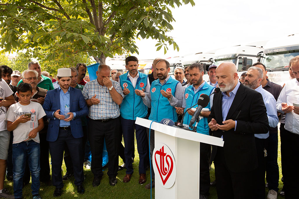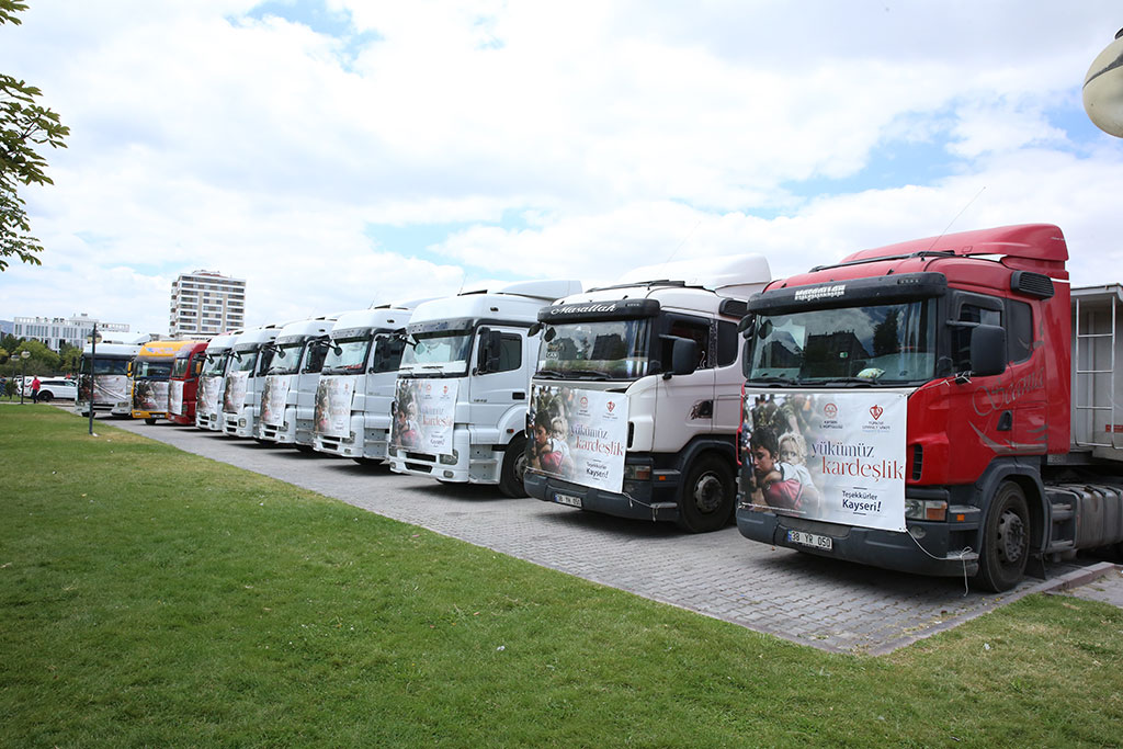Türkiye Diyanet Vakfı Kayseri Şubesi tarafından fuar alanı yanındaki Ahmet-Ayşe İnci Camii önünden 12 tır dolusu yardım malzemesini Suriye’ye gönderdi. Büyükşehir Belediye Başkanı Mustafa Çelik, son 2,5 yılda 436 tır yardım malzemesi gönderen Kayserili hayırseverlerin övünç kaynağımız olduğunu belirtti ve tüm hayır sahiplerine teşekkür etti. Türkiye Diyanet Vakfı tarafından 9 tır un, 1 tır kıyafet ve 2 tır içme suyundan oluşan yardım malzemelerinin uğurlanması törenine Büyükşehir Belediye Başkanı Mustafa Çelik’in yanı sıra Vali Yardımcısı Ali Uslanmaz, AK Parti İl Başkanı Şaban Çopuroğlu, Emniyet Müdürü İbrahim Kulular, İl Müftüsü Şahin Güven, bürokratlar ve vatandaşlar katıldı. İl Müftüsü Şahin Güven 2016 yılı Mart ayından bu yana 424 tır yardım malzemesinin Kayseri’den Suriye’ye gönderildiğini ifade ederek, gönderilecek olan 12 tır ile birlikte yardım tırı sayısının 436’ya ulaşacağını söyledi. Büyükşehir Belediye Başkanı Mustafa Çelik de Kayseri ile övünç duyduğunu dile getirdi. Kayseri’nin pek çok özelliği bulunduğunu; ama asıl zenginliğimiz ve övünç kaynağımızın gönlü zengin insanlarımız olduğunu vurgulayan Başkan Çelik, “Bu topraklarda para kazananlar yine bu topraklar için hayırlarda bulunuyorlar ve bu hayırlar yurt dışına kadar ulaşıyor. ‘Paran kadar değil hayrın kadar konuş’ sözü bu topraklardan çıktı. Rabbim pek çok insana imkan veriyor; ama herkes hayır yapacak özellikte olmuyor. Bu organizasyonu yapanlara ve hayırsever hemşehrilerime teşekkür ediyorum” dedi. 12 tırdan oluşan yardım konvoyu Marmara Üniversitesi İlahiyat Fakültesi Camii İmam Hatibi Halil Necipoğlu’nun yaptırdığı dualarla uğurlandı.