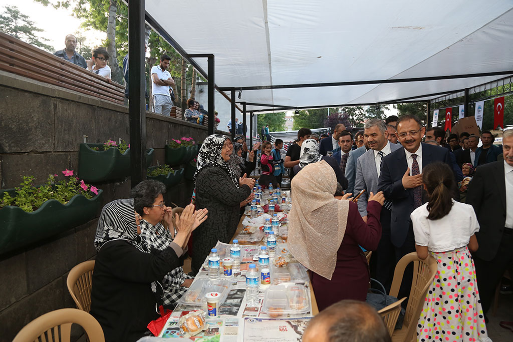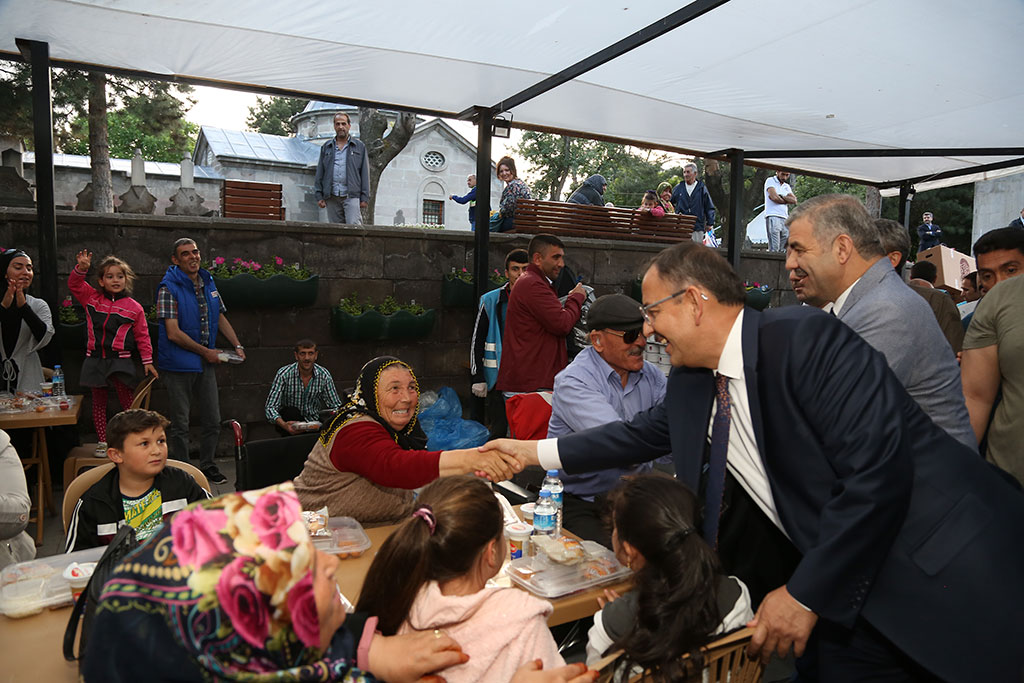 Büyükşehir Belediyesi Seyyid Burhaneddin Hz. Türbesi’nde her gün binlerce kişiye iftar vermeye devam ediyor. Çevre ve Şehircilik Bakanı Mehmet Özhaseki de Seyyid Burhaneddin Türbesi’ni ziyaret etti ve Büyükşehir Belediye Başkanı Mustafa Çelik ile birlikte iftar için gelen vatandaşlarla görüştü. Büyükşehir Belediyesi’nin Seyyid Burhaneddin Türbesi’nde 3 bin kişiye verdiği iftar ilginin artması üzerine 5 bin kişiye çıkarıldı. Büyükşehir Belediyesi’nin oluşturduğu iftar alanını Çevre ve Şehircilik Bakanı Mehmet Özhaseki, Vali Süleyman Kamçı ve Kayseri Milletvekilleri de ziyaret etti. Kayseri Milletvekilleri ve AK Parti Milletvekili Adayları ile birlikte Seyyid Burhaneddin Hz. Türbesi’ni ziyaret ederek dua eden Çevre ve Şehircilik Bakanı Mehmet Özhaseki daha sonra iftar alanına geçti. Bakan Özhaseki ve Başkan Çelik, iftar için gelen vatandaşlarla selamlaştılar, sohbet ettiler ve onlarla bol bol hatıra fotoğrafı çektirdiler.