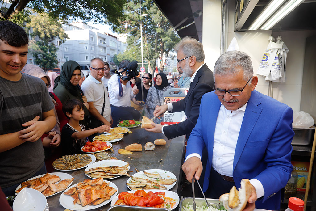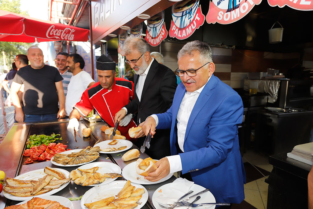 Kayseri Büyükşehir Belediye Başkanı Dr. Memduh Büyükkılıç, Önceki Dönem Enerji ve Tabi Kaynaklar Bakanı Taner Yıldız ile birlikte balık sezonunun açılışında Balıkçılarla birlikteydi. Yıldız ve Büyükkılıç, vatandaşlara balık-ekmek ikram etti. Sivas Caddesi’ndeki balıkçılar, balık sezonunun açılışını Büyükşehir Belediye Başkanı Memduh Büyükkılıç ve Önceki Dönem Enerji ve Tabi Kaynaklar Bakanı Taner Yıldız ile birlikte yaptı. Kayseri Milletvekili Taner Yıldız ve Başkan Memduh Büyükkılıç, önce Sivas Caddesi esnafını, ardından balıkçıları ziyaret etti. Sivas Caddesi’ndeki balıkçıları tek tek ziyaret ederek balık sezonunun hayırlı olması temennisinde bulunan Yıldız ve Büyükkılıç, daha sonra tezgaha geçerek vatandaşlara balık-ekmek ikram etti. Sezonun açılışı nedeniyle ikram edilen balık-ekmeklere vatandaşlar büyük ilgi gösterdi. Balıkçılarla günün anısına fotoğraflar çektiren Başkan Büyükkılıç ve Kayseri Milletvekili Taner Yıldız, daha sonra vatandaşlara tatlı ikram etti.