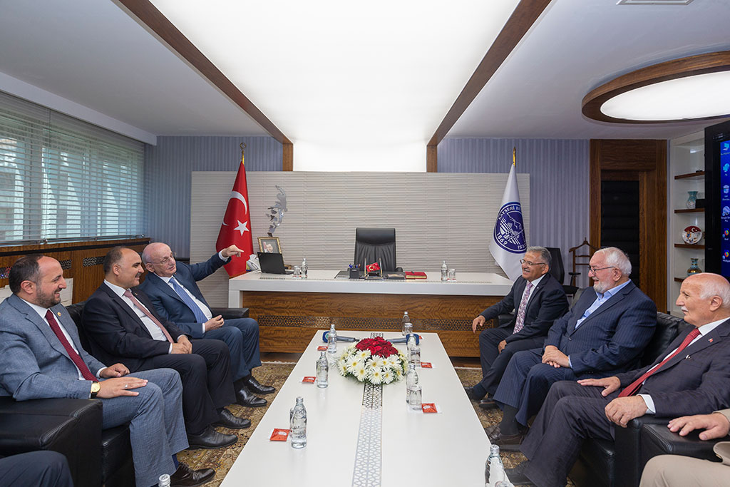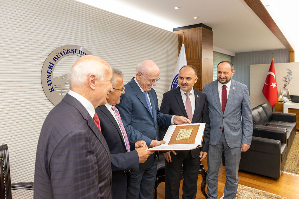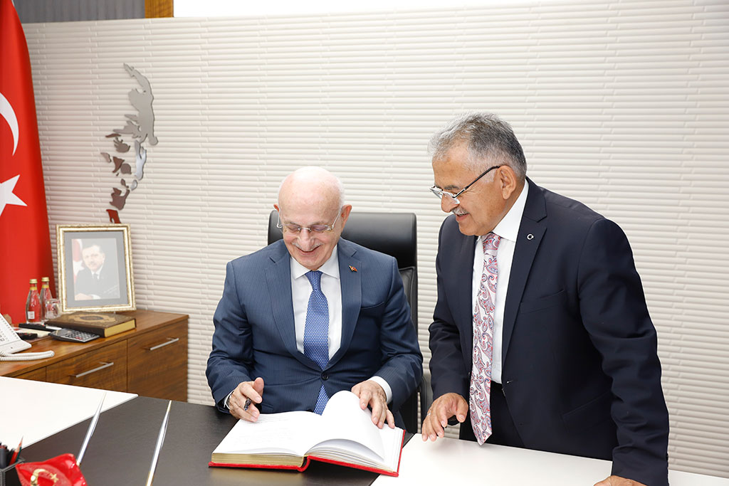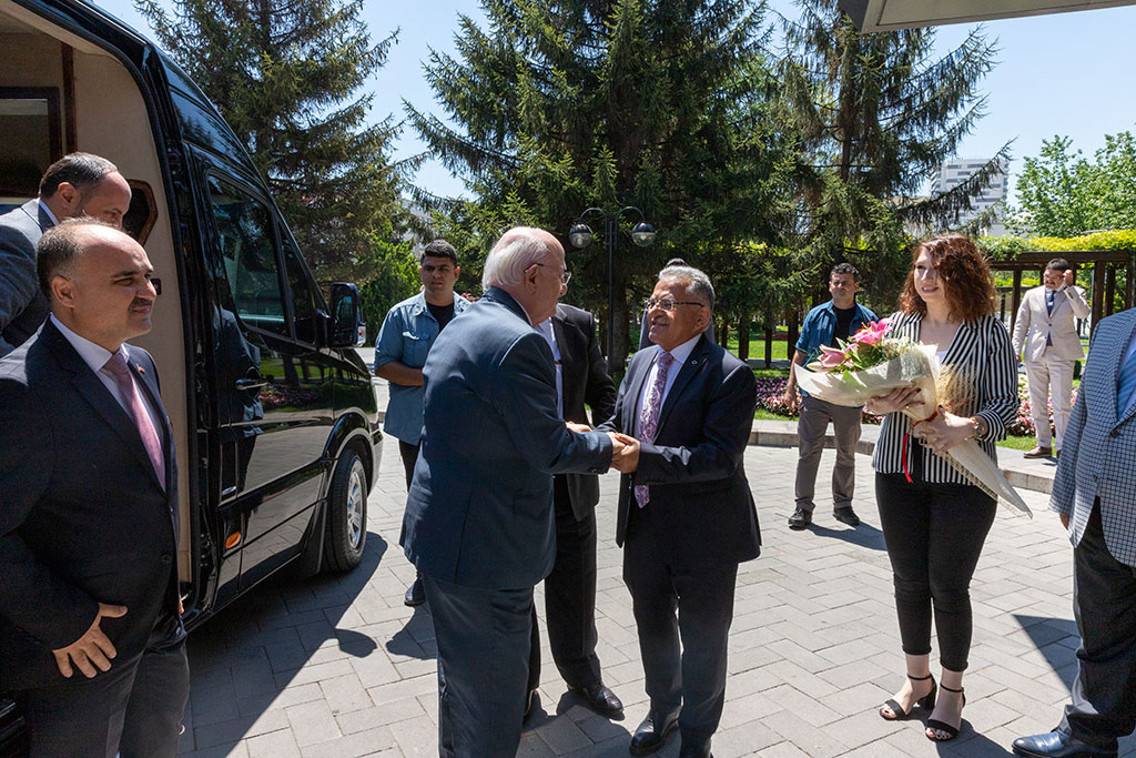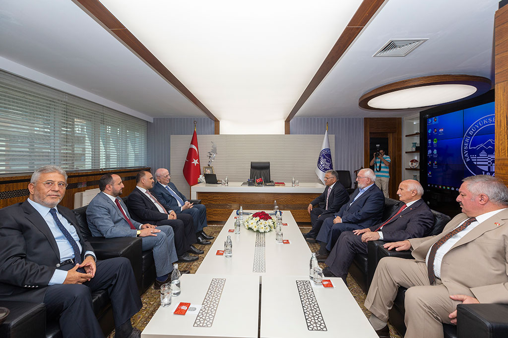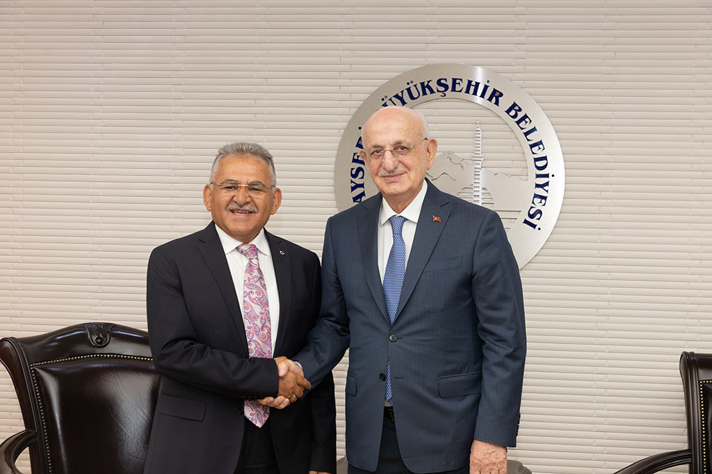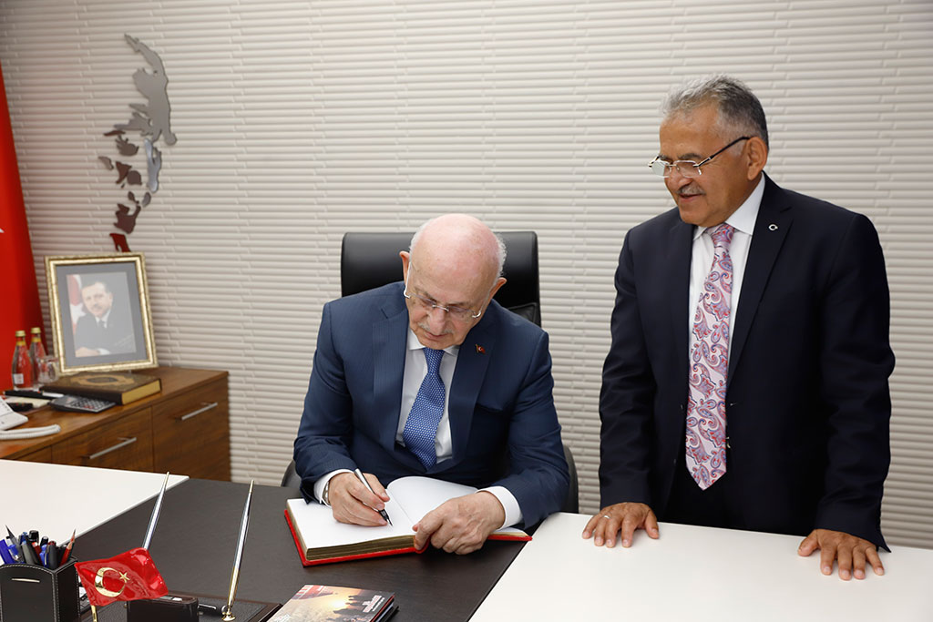 Türkiye Büyük Millet Meclisi’nin 26. Dönem Meclis Başkanı İsmail Kahraman, Büyükşehir Belediye Başkanı Dr. Memduh Büyükkılıç’ı ziyaret etti. Kahraman, sıcak ve samimi bir ortamda geçen ziyarette Başkan Büyükkılıç’ın belediyecilikteki engin tecrübesiyle kazandırdığı hizmetlere yenilerini ekleyeceğine inancının tam olduğunu söyledi. Büyükşehir Belediye Başkanı Dr. Memduh Büyükkılıç, 26. Dönem TBMM Başkanı İsmail Kahraman’ı Başkanlık girişinde karşıladı. Ziyarete Vali Şehmus Günaydın ve Kayseri Milletvekili İsmail Emrah Karayel ile 24 ve 25. Dönem Kayseri Milletvekili Yaşar Karayel de katıldı. Başkan Memduh Büyükkılıç, İsmail Kahraman’a el dokuması seccade, Kahraman da Başkan Büyükkılıç’a ziyaretin anısına Meclis Başkanlığı döneminde bastırdığı iki ciltlik Osmanlı Devlet Tarihi adlı eseri hediye etti. Sıcak ve samimi bir ortamda gerçekleşen ziyarette 26. Dönem Meclis Başkanı Kahraman, Büyükşehir Belediyesi’nin şeref defterini de imzaladı. Kahraman, şeref defterindeki yazısında “Kendisiyle arkadaş olmaktan dolayı büyük bahtiyarlık duyduğum değerli dava insanı, hizmet ehli, muhterem Dr. Memduh Büyükkılıç beyefendi ile Kayseri ve ülke meselelerini mütalaa ettik. Belediyecilikte engin tecrübe sahibi değerli başkanımızın, kazandırdığı hizmetlere yenilerini katacağına inancım tamdır. Kendisine ve şahsında çalışma arkadaşlarına tebriklerimi ve hayırlı başarı dileklerimi sunuyorum. Cenabı Hak muvaffak kılsın. Devletimize ve milletimize zeval vermesin” ifadelerini kullandı.