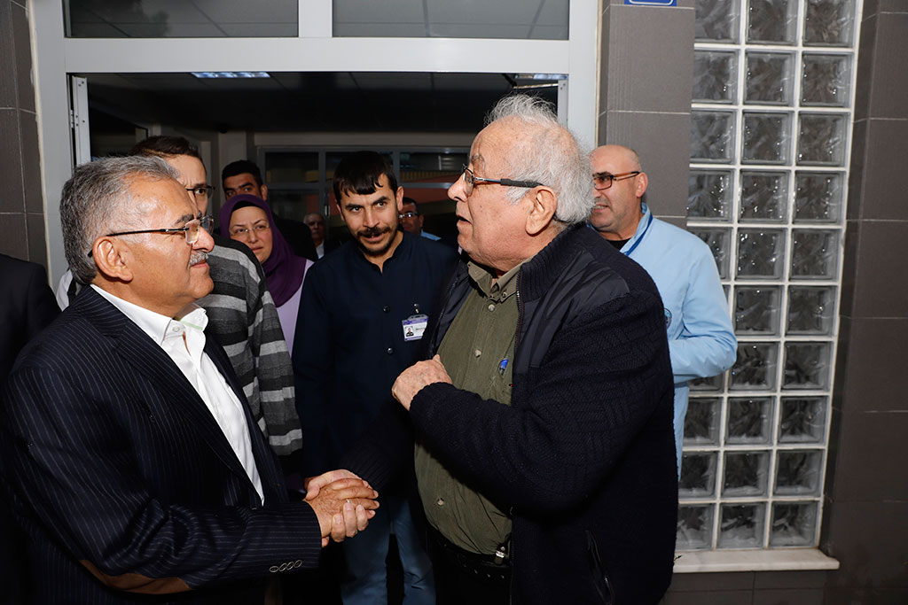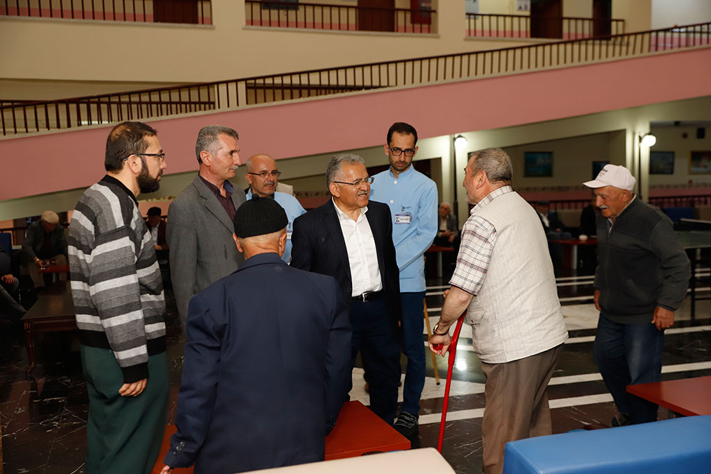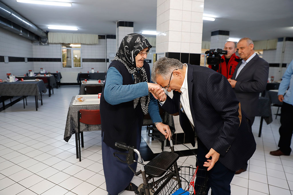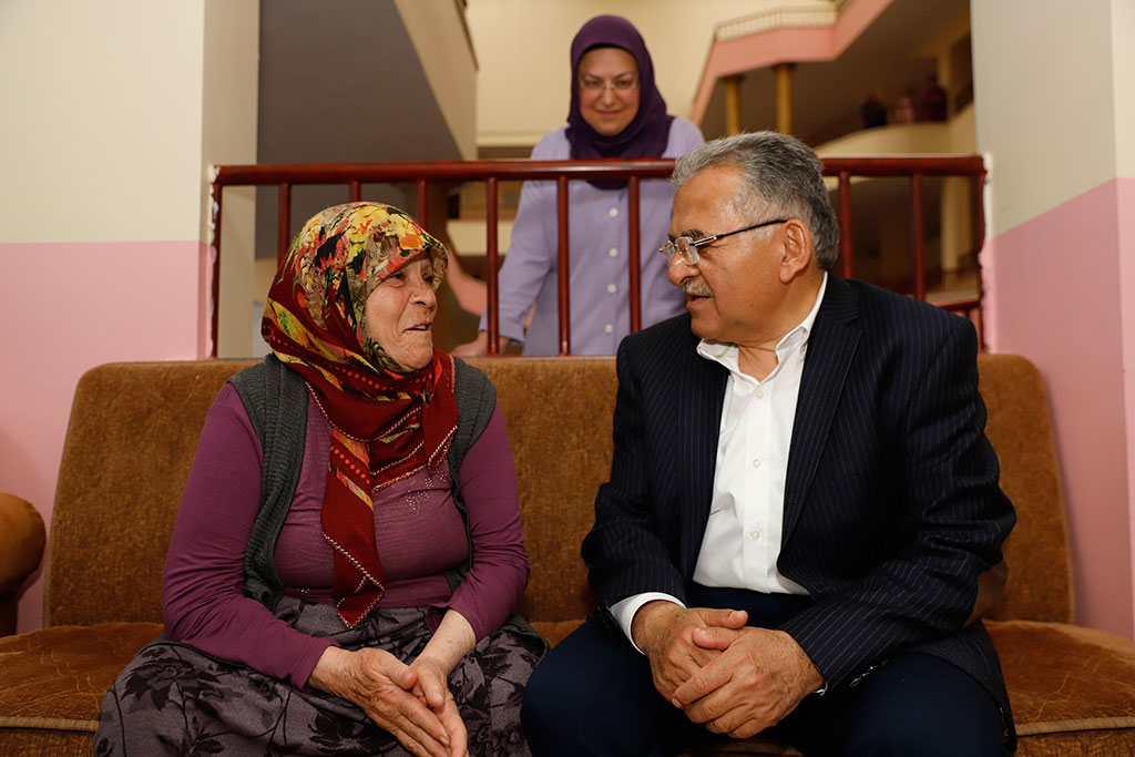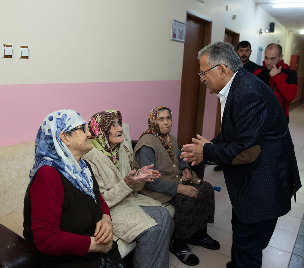 Büyükşehir Belediye Başkanı Dr. Memduh Büyükkılıç, yoğun programlarının yanı sıra zaman zaman sürpriz ziyaretler gerçekleştiriyor. Habersiz yaptığı ziyaretlerle hizmet birimlerini adeta teftiş eden Başkan Büyükkılıç, Kayseri Huzurevi’ne de ani bir ziyarette bulundu. Başkan Büyükkılıç, tüm yaşlılarımızla tek tek görüştü ve “Sizlerin gönlünü ihya etmek durumundayız, çünkü siz bizim dua kaynağımızsınız” dedi. Büyükşehir Belediye Başkanı Memduh Büyükkılıç, Huzurevi’ni ziyaret ederek tüm birimlerini gezdi ve yaşlılarımızla görüştü. Tüm yaşlılarımızla tek tek selamlaşan ve hatırlarını soran Başkan Büyükkılıç, bir istekleri olup olmadığını sordu. Yaşlılarımızın şehrin dua kaynağı olduğunu ifade eden Başkan Büyükkılıç, bu nedenle tüm yaşlılarımızın gönüllerini ihya etmek gerektiğini kaydetti. Yaşlılarımıza “Bizleri evladınız olarak görün” diyerek yaklaşan ve aldıkları hizmetlerle ilgili sorular yönelten Başkan Büyükkılıç, Huzurevi’nin personeliyle de görüştü. Başkan Büyükkılıç, yemekhaneden mutfağına, banyosundan mescidine kadar Huzurevi’nin tüm birimlerini de tek tek gezerek incelemelerde bulundu. Büyükşehir Belediye Başkanı Memduh Büyükkılıç, ziyaretinde yaşlıların her birisiyle yakından ilgilendi. Başkan Büyükkılıç, Turanlı bir Huzurevi sakinine arzu ederse ve özlem duyuyorsa Turan’a götürebileceğini de söyledi. Huzurevi sakinleri de Başkan Büyükkılıç’ın gösterdiği ilgiye, sevgi ve duayla karşılık verdi.