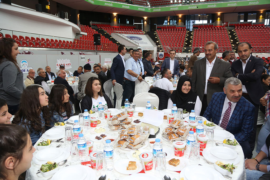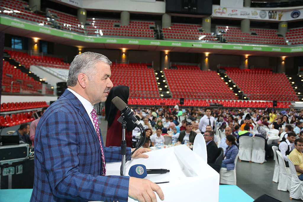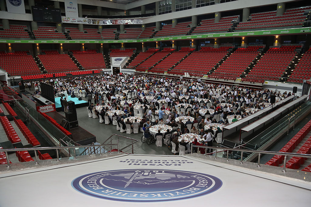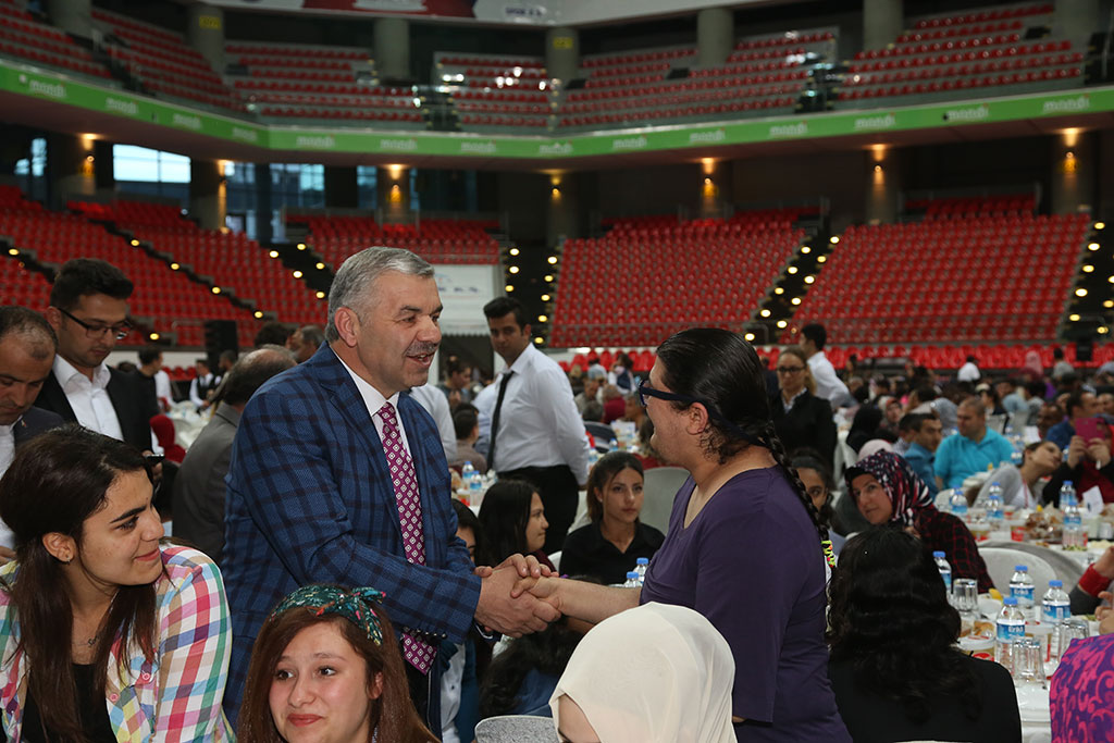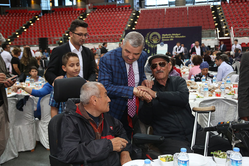 Büyükşehir Belediyesi’nin geleneksel iftar buluşmaları devam ediyor. Büyükşehir Belediye Başkanı Mustafa Çelik, yaşlılarımızla, kimsesiz çocuklarımızla ve engellilerimizle iftarda bir araya geldi. Toplumun her kesiminin duasını almak için çalıştıklarını belirten Başkan Çelik, “Sizlerin dualarıyla bu şehir bereketleniyor ve huzur buluyor” dedi. Büyükşehir Belediyesi tarafından Kadir Has Spor ve Kongre Merkezi’nde verilen iftara Huzurevi’nde kalan ve evlerinde bakım hizmeti verilen YADES Projesi bünyesindeki yaşlılarımız, Sevgi Evleri’nde kalan çocuklarımız ve Kayseri’deki engelli derneklerinden engellilerimiz katıldı. Başkan Mustafa Çelik, salonun tamamen dolduğu iftarda tüm masaları tek tek dolaştı ve katılan herkesle selamlaştı. İftar öncesi yaptığı konuşmada Ramazan ayının mübarek olmasını dileyerek sözlerine başlayan Büyükşehir Belediye Başkanı Çelik, bir taraftan rutin belediyecilik faaliyetlerini aksatmadan sürdürdüklerini bir taraftan da Kayseri’nin geleceğine yönelik projeleri hayata geçirdiklerini söyledi. Üç yılda çalışılan nokta sayısının 5 bin 700 olduğunu vurgulayan Başkan Çelik, şehrin her noktasında çalıştıklarını belirtti. Bu şehirde yaşayanların rahat ve huzuru için çalıştıklarını ve tek beklentilerinin de bu şehirde yaşayanların duası olduğunu dile getiren Başkan Çelik, “Rabbim hayırlı hizmet ömürleri verirse çalışmaya devam edeceğiz. Tüm bu hizmetleri yaparken tek bir amacımız var sizlerin duası. Toplumun her kesiminden dua alıyoruz; ama sizlerin duası çok daha önemli. Huzurevi’nde kalan yaşlılarımız YADES bünyesindeki yaşlılarımız ve Sevgi Evlerindeki çocuklarımız bizler için farklı öneme haiz. Şehrimizin engelli derneklerinden de iftarımıza katıldığılar ve hep birlikteyiz. Sizlerin dualarıyla bu şehir bereketleniyor ve huzur buluyor” dedi.